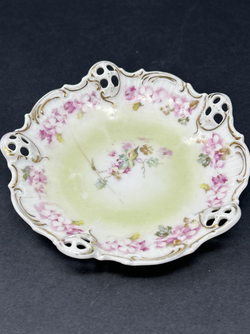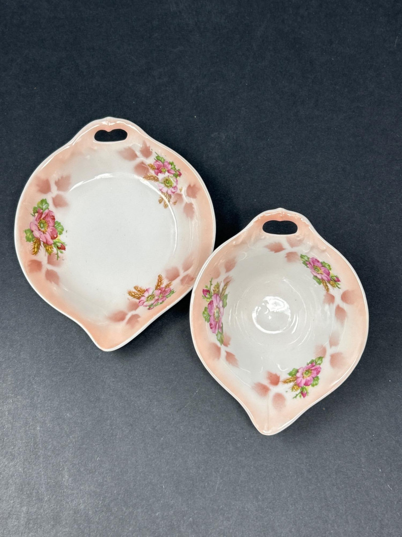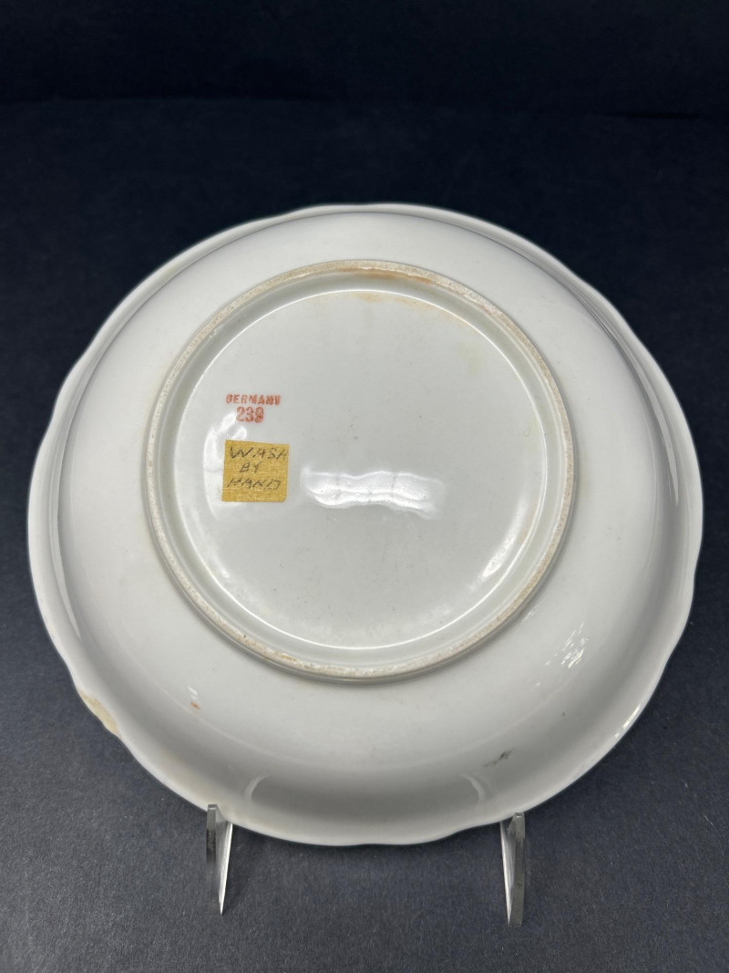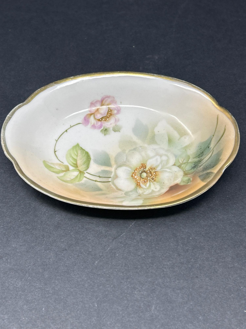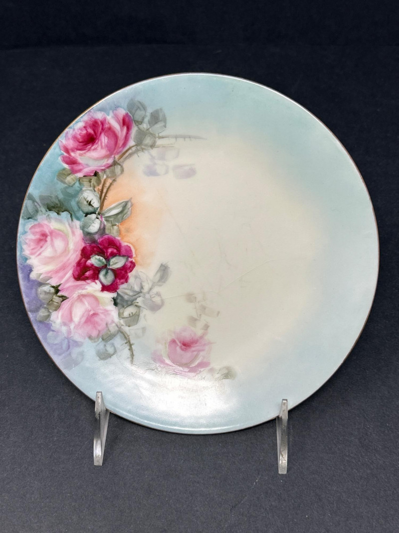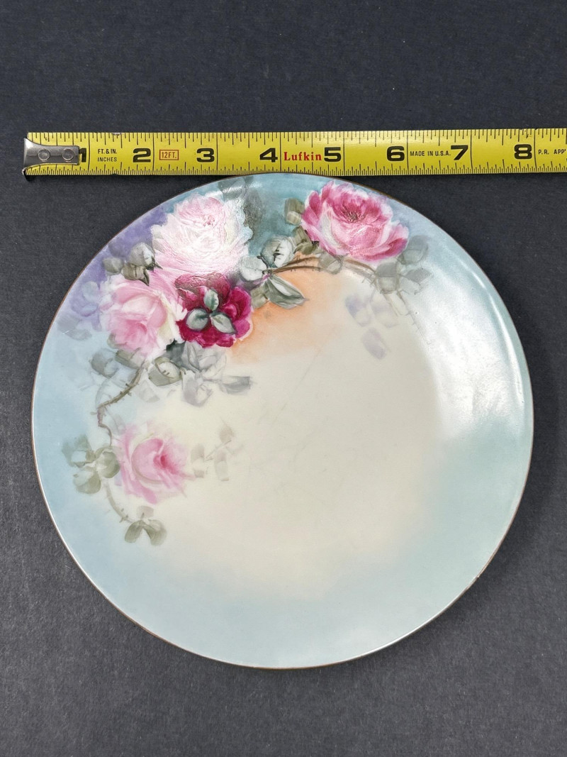 A lovely group of six hand-painted porcelain dishes from late 19th to early 20th century Europe, each featuring delicate floral decoration, soft pastel grounds, and gilt accents. Several pieces retain old family provenance labels noting they were already “old” when gifted in the 1930s–40s, adding sentimental depth and historical continuity. Oval Dish: Decorated with white and pink wild roses and a gilded rim. Stamped Beauty Germany Hand painted. Approx. 7½" × 5". Round Plate: Features pink and magenta roses on a misty blue ground. Marked T&V Limoges France. Approx. 7¼" dia. Round Shallow Bowl: Embellished with pink rose garlands and a raised beaded rim. German porcelain. Approx. 7¼" dia. Reticulated Plate: Light green ground with pink floral garland and gilt accents. Marked B.R.C. Molière Germany. Approx. 6¾" dia. Two Leaf-Form Handled Nut/Bonbon Dishes: Blush pink with rose sprigs. Both stamped Germany 240. Each approx. 5–6" across. Authentic hand-painted European porcelain spanning c. 1890–1920 Includes pieces from Germany and Limoges, France Retains handwritten provenance notes from the 1930s–40s Ideal for tea tables, vanity trays, or curated display A romantic, cohesive set with decorative and historical appealIncluded Pieces