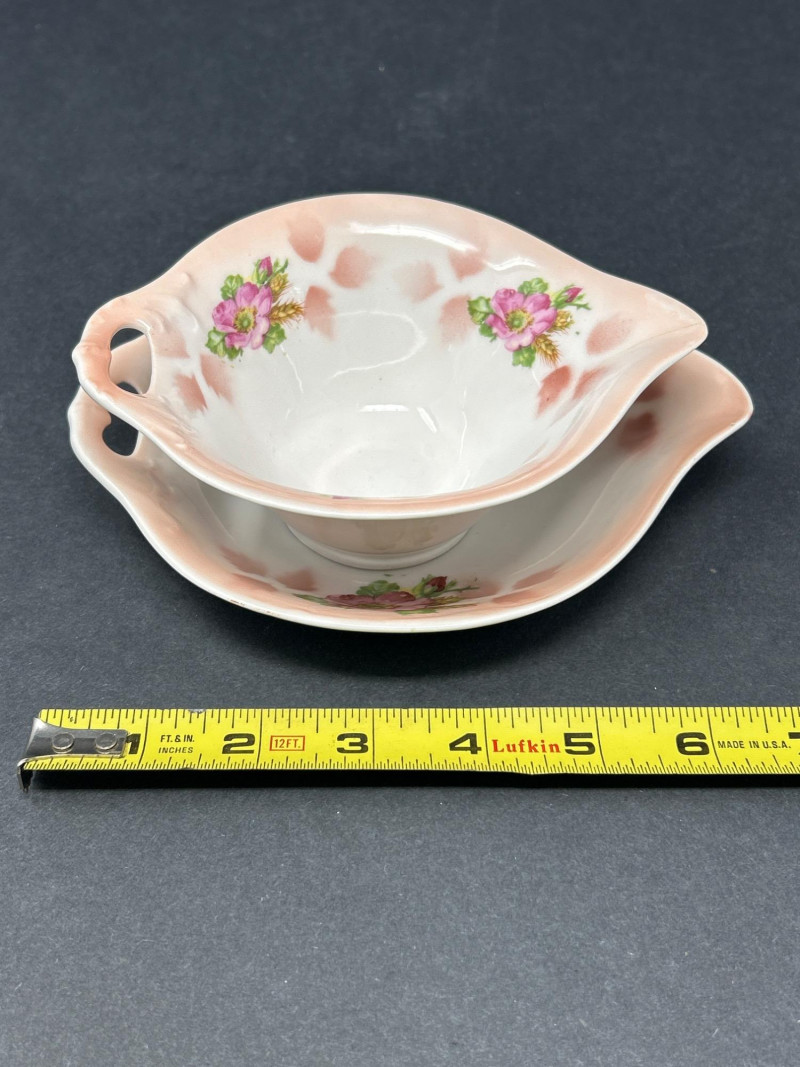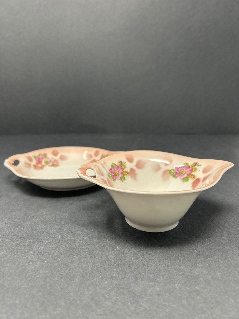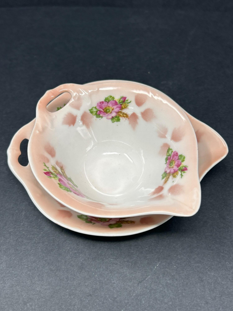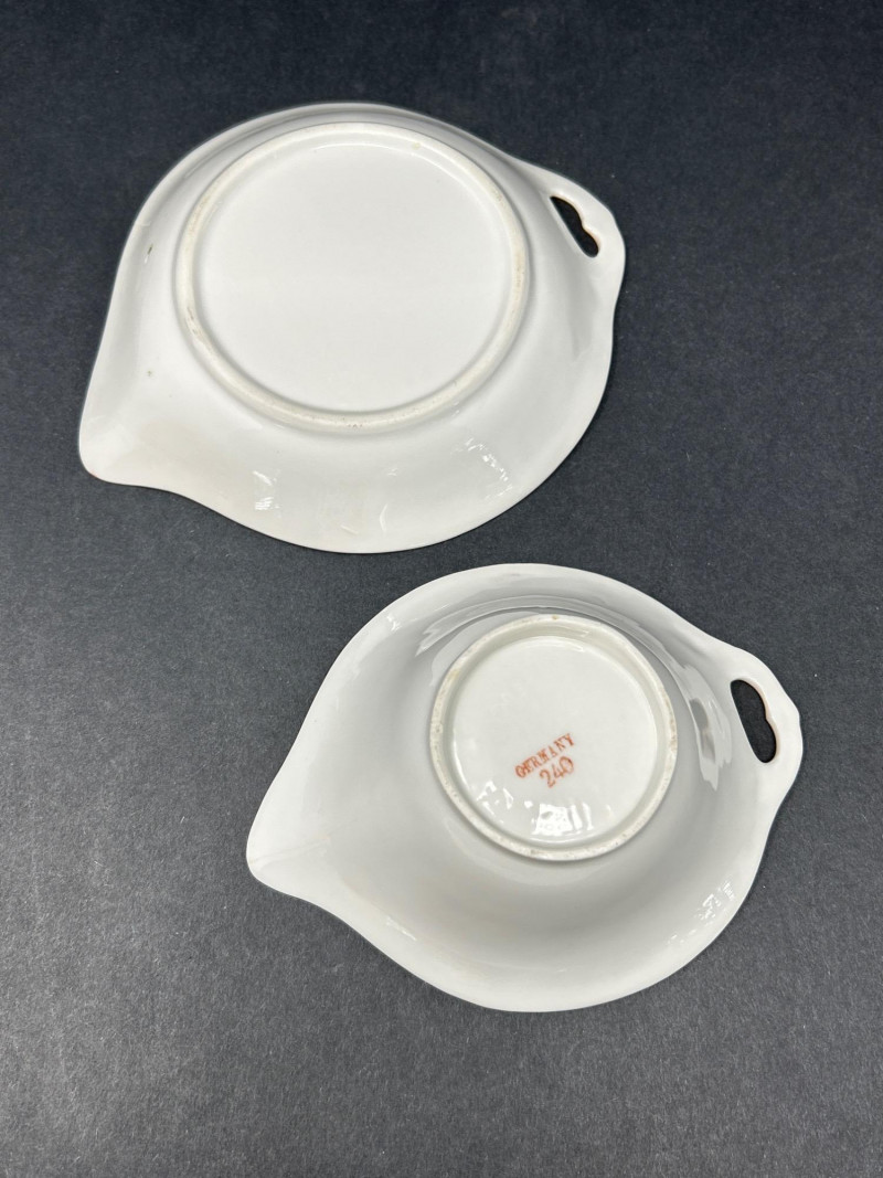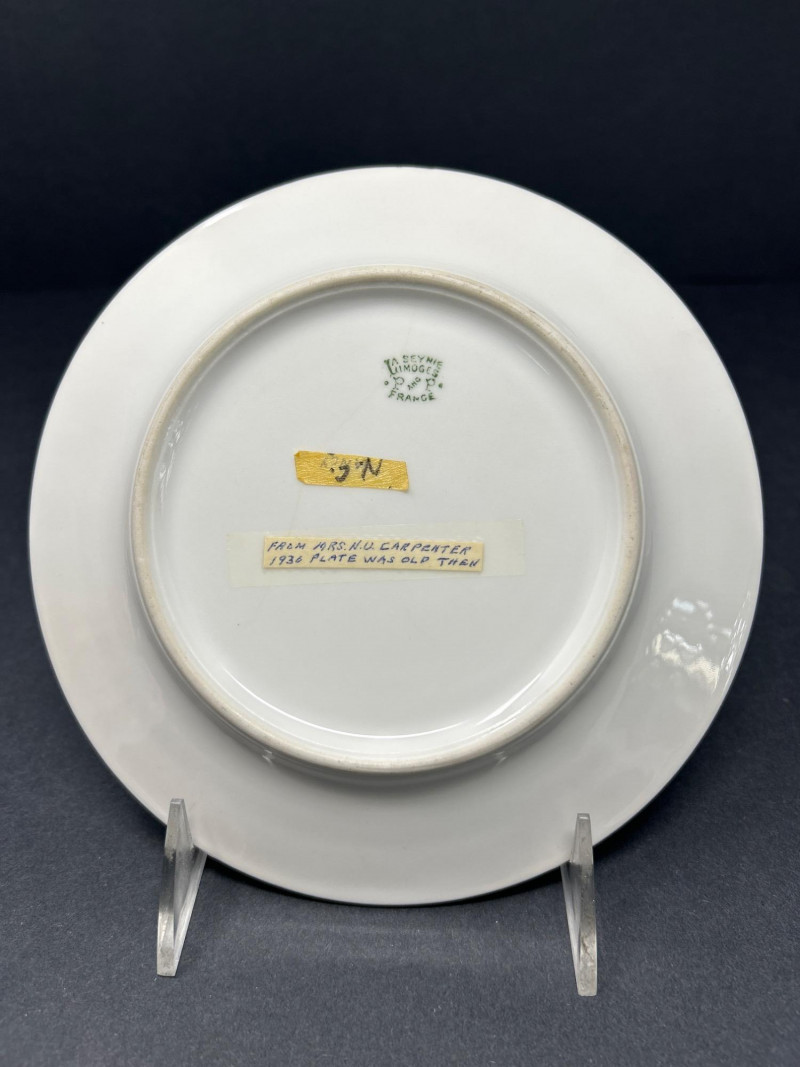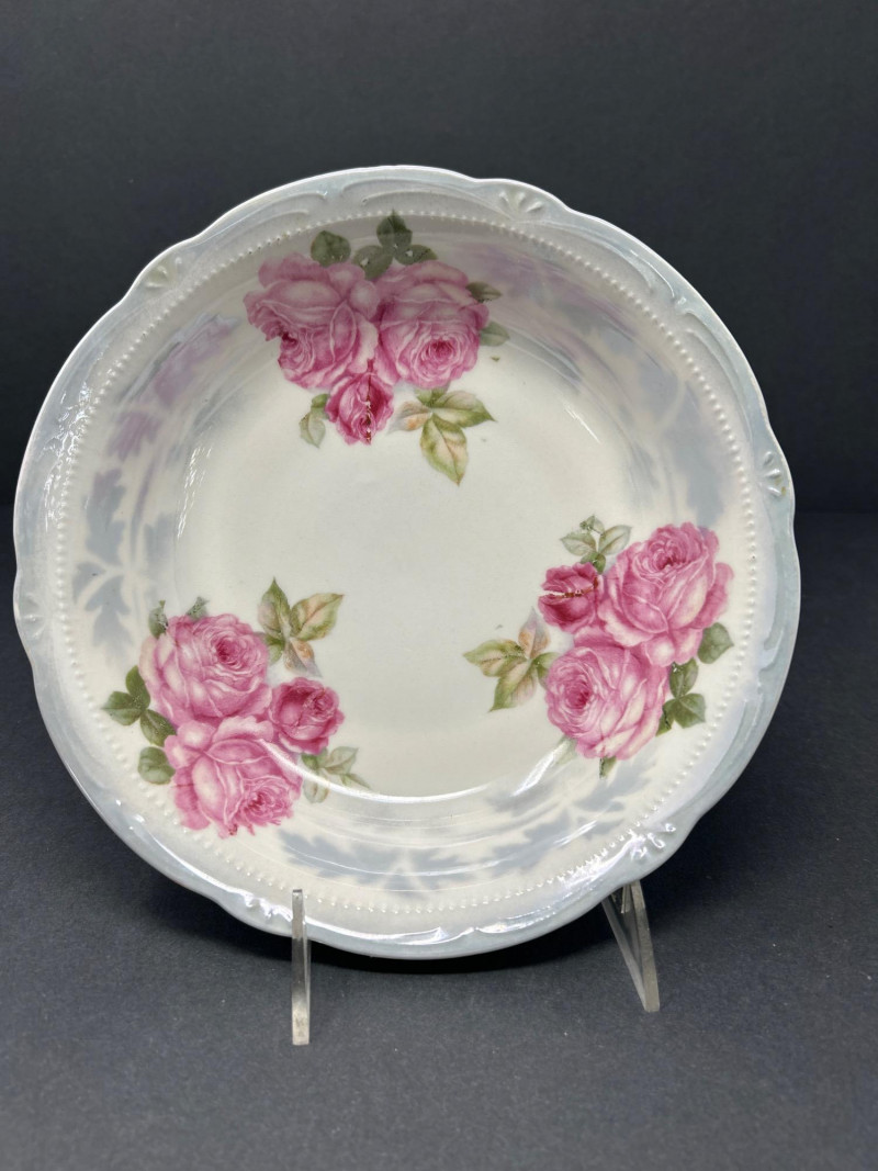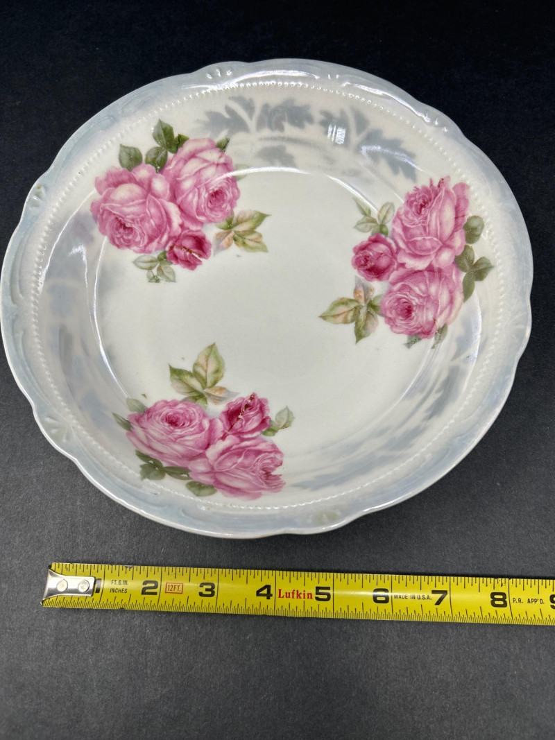 A lovely group of six hand-painted porcelain dishes from late 19th to early 20th century Europe, each featuring delicate floral decoration, soft pastel grounds, and gilt accents. Several pieces retain old family provenance labels noting they were already “old” when gifted in the 1930s–40s, adding sentimental depth and historical continuity. Oval Dish: Decorated with white and pink wild roses and a gilded rim. Stamped Beauty Germany Hand painted. Approx. 7½" × 5". Round Plate: Features pink and magenta roses on a misty blue ground. Marked T&V Limoges France. Approx. 7¼" dia. Round Shallow Bowl: Embellished with pink rose garlands and a raised beaded rim. German porcelain. Approx. 7¼" dia. Reticulated Plate: Light green ground with pink floral garland and gilt accents. Marked B.R.C. Molière Germany. Approx. 6¾" dia. Two Leaf-Form Handled Nut/Bonbon Dishes: Blush pink with rose sprigs. Both stamped Germany 240. Each approx. 5–6" across. Authentic hand-painted European porcelain spanning c. 1890–1920 Includes pieces from Germany and Limoges, France Retains handwritten provenance notes from the 1930s–40s Ideal for tea tables, vanity trays, or curated display A romantic, cohesive set with decorative and historical appealIncluded Pieces