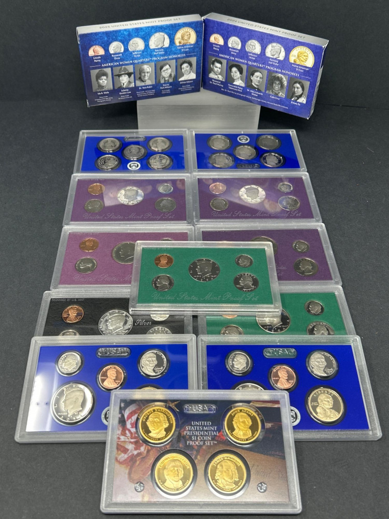Includes complete 2023 and 2025 Proof Sets with updated designs and commemorative coins, all in pristine condition with original boxes and documentation. All coins are housed in original U.S. Mint protective cases. Packaging includes Certificates of Authenticity where applicable.Highlights: