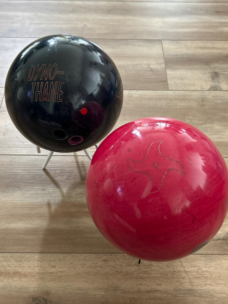 A matched set of two pre-drilled performance bowling balls from Dyno-Thane, a respected manufacturer favored by competitive bowlers in the late 1990s and early 2000s. Both balls feature custom finger drilling and thumb inserts, with surface wear consistent with prior use. Branding: Bold “DYNO-THANE” name on one side; DT Pro crosshair logo on the reverse Coverstock: Reactive resin, engineered for reliable mid-lane read and controllable backend motion Drilling: Three-finger layout with thumb insert Branding: “AMP” name with stylized ninja shuriken/star logo Coverstock: Designed for angular backend reaction and versatility on medium oil lane conditions Drilling: Three-finger layout with thumb insertBlack Ball – Dyno-Thane Vendetta DT Pro