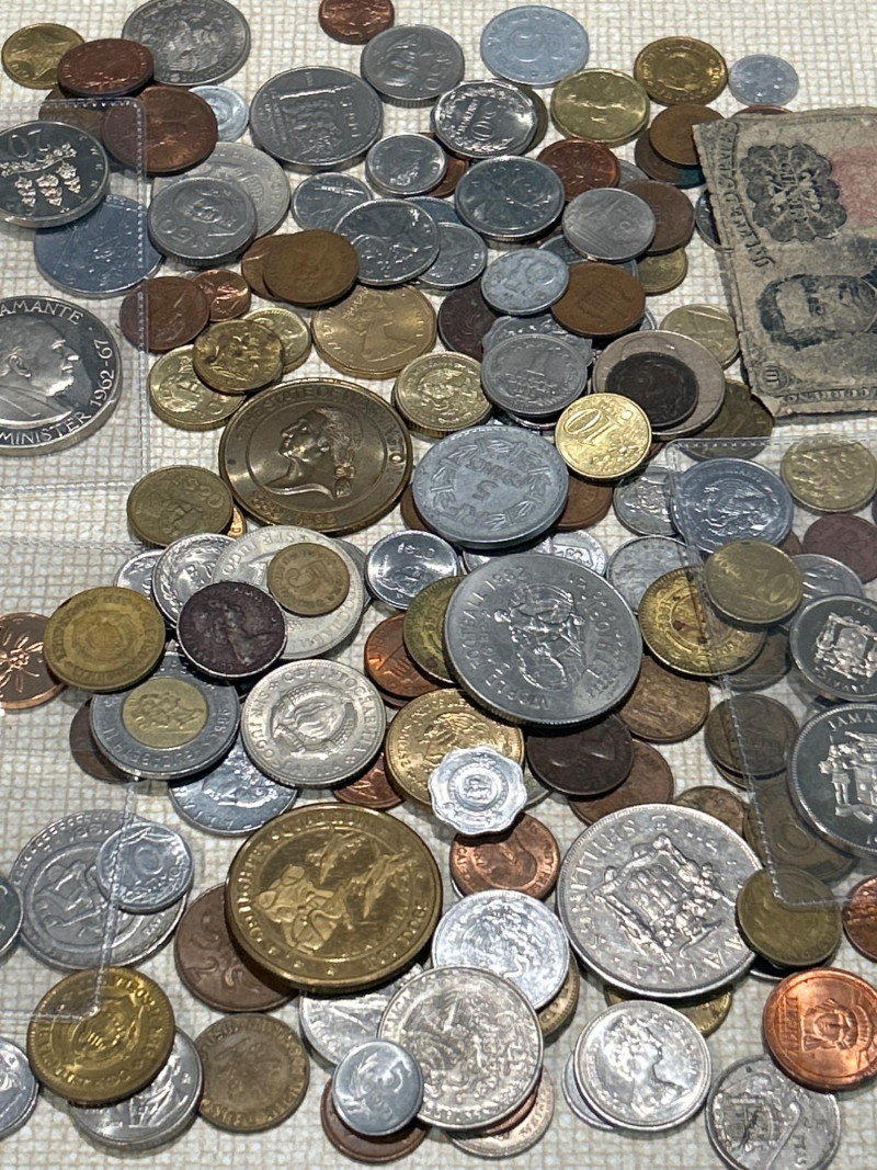 A vibrant and varied assortment of global coinage and vintage paper currency, ideal for collectors, resellers, or bulk stock buyers. This mixed lot includes: Copper, bronze, brass, nickel, and bimetallic issues from Europe, Asia, the Americas, and the Caribbean Notable examples include: Jamaica 5 Shillings 1971 – Crown-size coin with coat of arms Jamaica 5 Shillings 1962–1967 – Commemorative issue featuring Sir Alexander Bustamante Elizabeth II commemorative crowns & dollars – Includes Washington State Centennial 1889–1989 token/medal Mexican Peso & Cinco Pesos coins UK pennies, halfpennies, and two pence pieces Philippines 5 Piso & 1 Piso coins Additional visible coins from Germany, Italy, Hong Kong, and more Includes one well-worn U.S. fractional currency note Likely 19th-century design; shows heavy creasing and edge wear Includes coins and medals marking events such as World Football 1982, statehood anniversaries, and other souvenir strikes This lot offers a broad mix of countries, metals, and designs—perfect for: World coin enthusiasts Dealers seeking bulk inventory Hobbyists hunting for silver, copper, or low-mintage varietiesCirculating World Coins