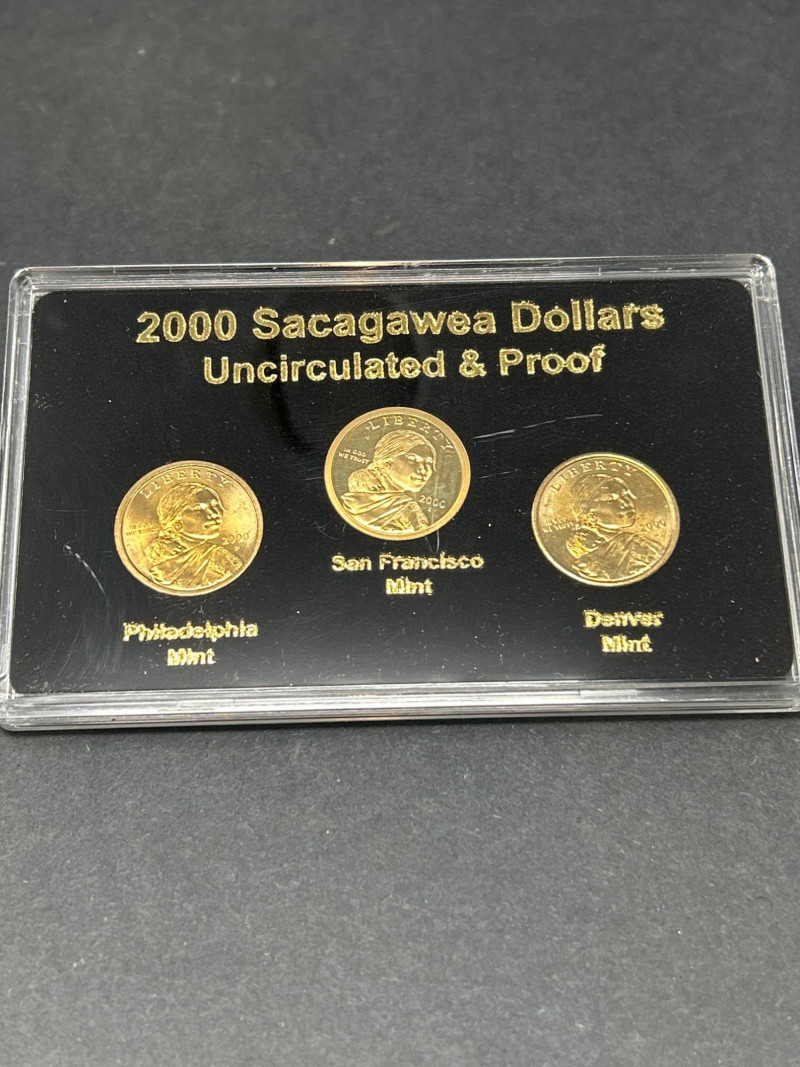 Packaging: Black presentation card with gold lettering, labeled 2000 Sacagawea Dollars — Uncirculated & Proof