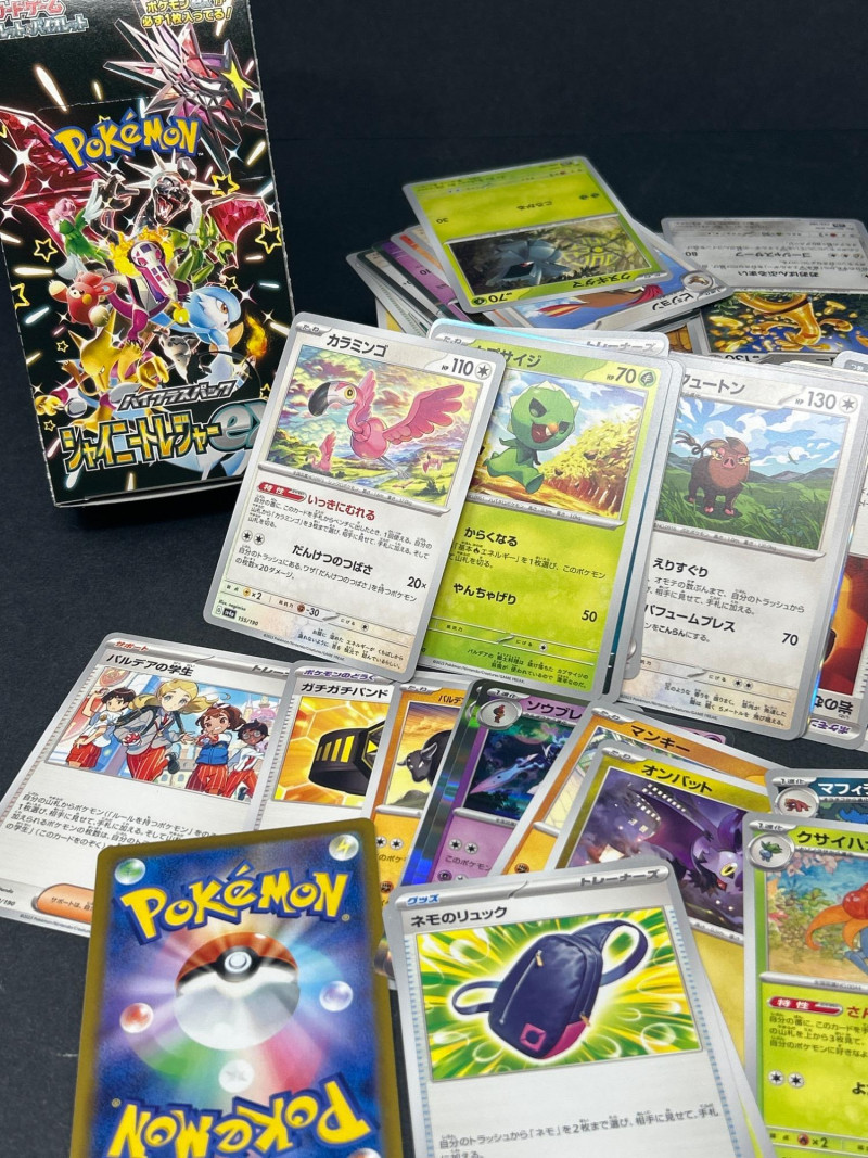 A vibrant and diverse assortment of Japanese Pokémon trading cards, featuring characters, energy types, and trainer cards from various series including the sought-after Shiny Treasure ex (SV4a) booster set. This lot includes: Series: Shiny Treasure ex (SV4a) Packaging: 1 sealed booster box Contents: 10 packs per box, 10 cards per pack Language: Japanese Copyright: ©2023 Pokémon / ©1995–2023 Nintendo / Creatures Inc. / GAME FREAK inc. Origin: Made in Japan Condition: Box appears sealed and in excellent condition Types Included: Pokémon, Trainer, and Energy cards Language: Japanese Notable Features: Holographic and non-holographic finishes Cards from multiple Pokémon types: Psychic, Grass, Fire, Electric, Fighting Includes Pokémon with moves such as: “たいあたり” (Tackle) – 20 damage “でんきショック” (Electric Shock) – 90 HP “パワフルプレス” (Powerful Press) – 70 damage “そだつリズム” (Growing Rhythm) One card features Oddish in a forest setting Includes energy cards and scenic trainer cardsBoxed Set: Shiny Treasure ex (SV4a)
