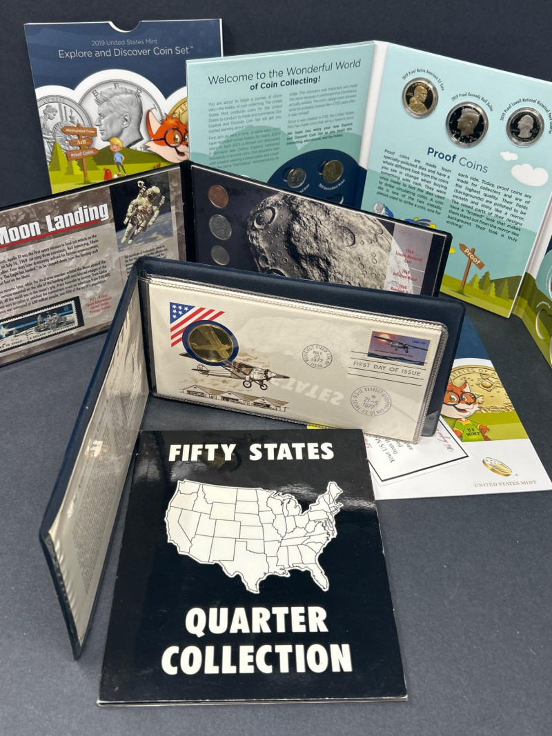 Contents: Uncirculated and proof examples: Kennedy Half Dollar, Native American $1, America the Beautiful Quarter Illustrated Coin Starter Kit & Activity Book Educational inserts on minting, proof coins, and collecting tips Highlights: Official U.S. Mint release Designed for entry-level collectors and educational use Combines collectible coins with engaging learning materials Contents: Labeled folder with slots for all 50 state quarters Many positions pre-filled with circulated examples Highlights: Classic black-and-white U.S. map cover Organized interior for state-by-state collecting Ready-made starter or completion set Contents: Selection of U.S. coins Historic Apollo 11 Moon Landing display Commemorative postage stamps Highlights: Honors America’s first lunar mission Attractive presentation for coin and space history collectors Philatelic and numismatic crossover Contents: Two First Day Covers Gold-plated Franklin Mint med alettes Roosevelt Field cancels dated May 20, 1977 Highlights: Celebrates Lindbergh’s 1927 transatlantic flight Artful cachets with aircraft and Eiffel Tower motifs Combines Medallia art, postal history, and aviation heritage2019 U.S. Mint “Explore and Discover Coin Set™”