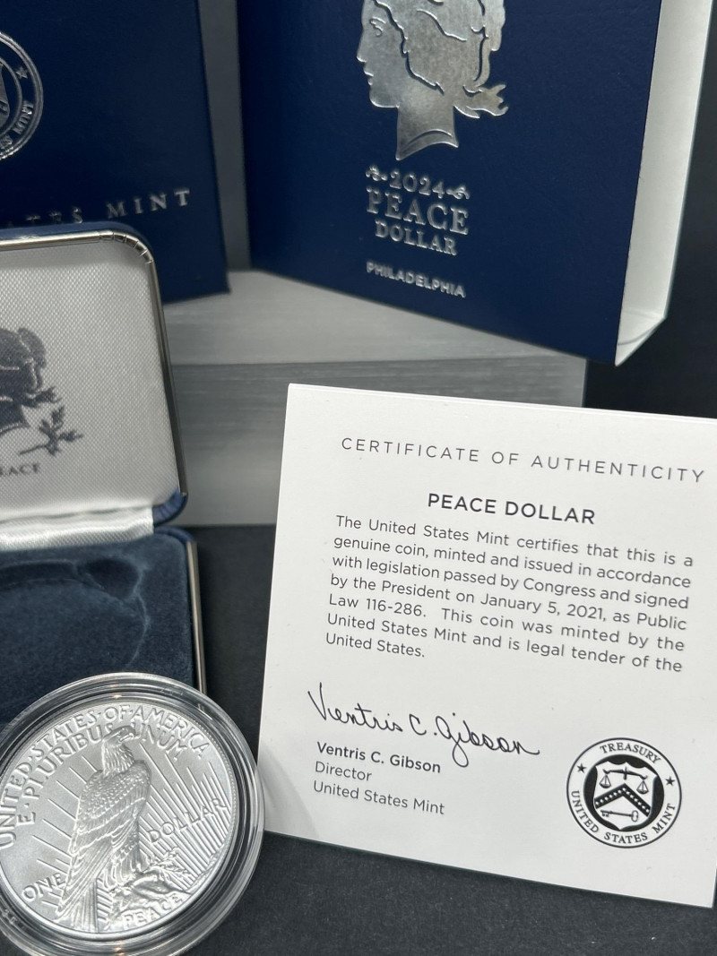 This coin is housed in its original black velvet presentation case with satin-lined lid, accompanied by the official Certificate of Authenticity and specification card from the United States Mint. The packaging includes a blue outer box embossed with the coin’s profile and “2024 PEACE DOLLAR PHILADELPHIA.” Provenance & Compliance: Issued under Public Law 116-286 and certified by the U.S. Mint Director, this coin is a genuine legal tender commemorative release. All materials are original and included as issued.