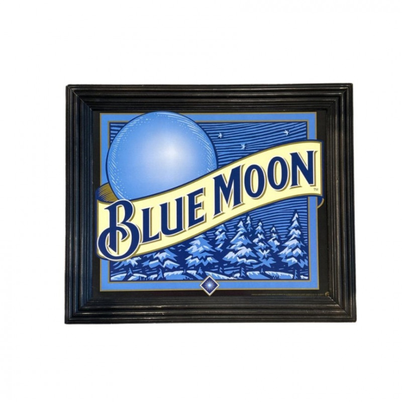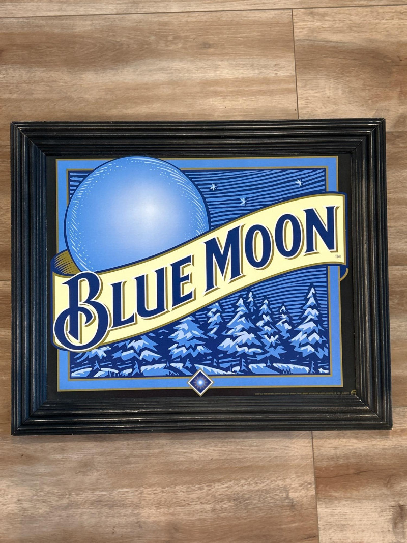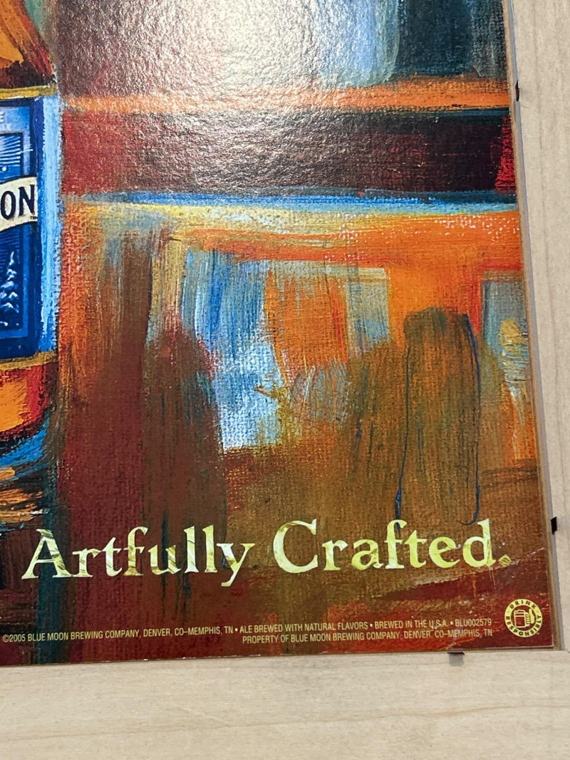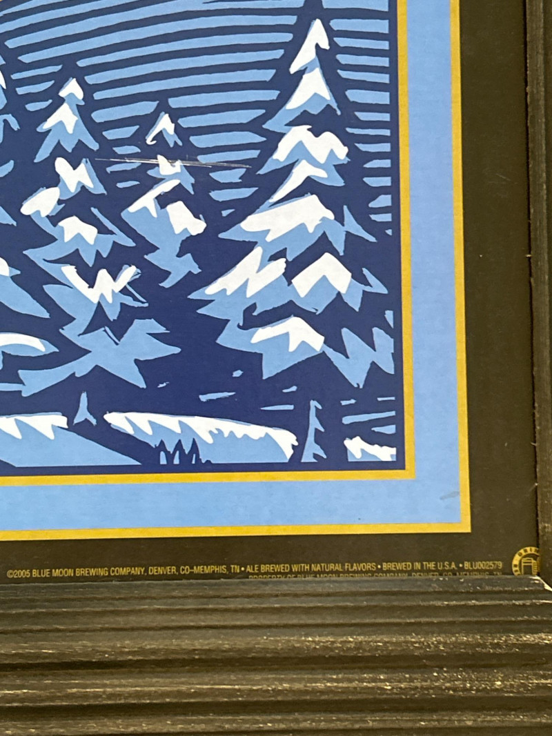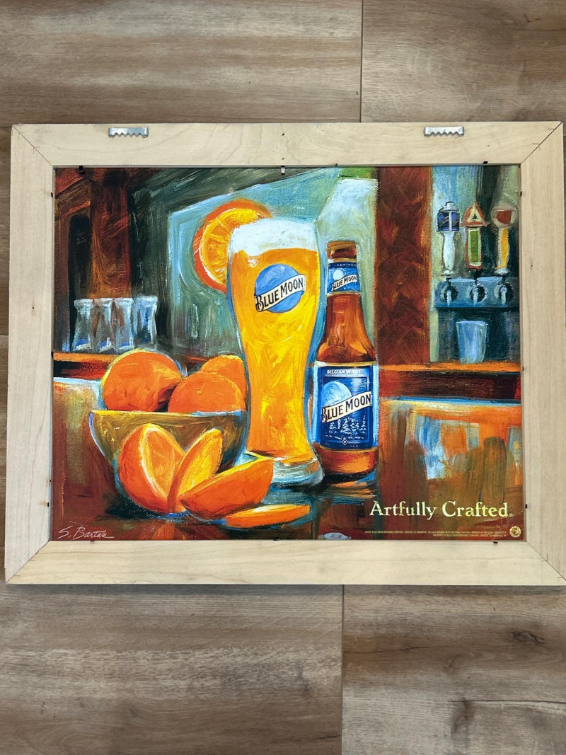 Dimensions: Approx. 20" × 20" (framed) Maker: Heritage Sign & Display for Blue Moon Brewing Company Date: 2005 Material: Printed poster mounted in a black grooved wood frame Design: Nighttime landscape featuring a glowing full moon above snow-covered pines, with the classic Blue Moon logo in cream and blue. Accented with gold and blue border detailing. Features: Original brewery promotional artwork; rear instructions included for optional picture light installation (hardware not included). Style Notes: Crisp, graphic composition with strong brand identity. Ideal for bar décor, brewery-themed interiors, or beer memorabilia collections. Dimensions: Approx. 20" × 20" (framed) Artist: Signed S. Bartok Maker: Heritage Sign & Display for Blue Moon Brewing Company Date: 2005 Material: Printed poster mounted in the same reversible black grooved wood frame Design: Lively bar interior showcasing a pint of Blue Moon Belgian White with orange garnish, bottle, and bar taps in the background. Includes the tagline “Artfully Crafted.” Features: Artist-signed promotional illustration; frame allows reversible display. Style Notes: Richly colored, hand-painted aesthetic adds warmth and character. A standout collectible for home bars, taprooms, or brewery-themed décor.Blue Moon Night Landscape Logo Sign (2005)
