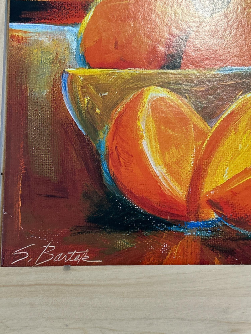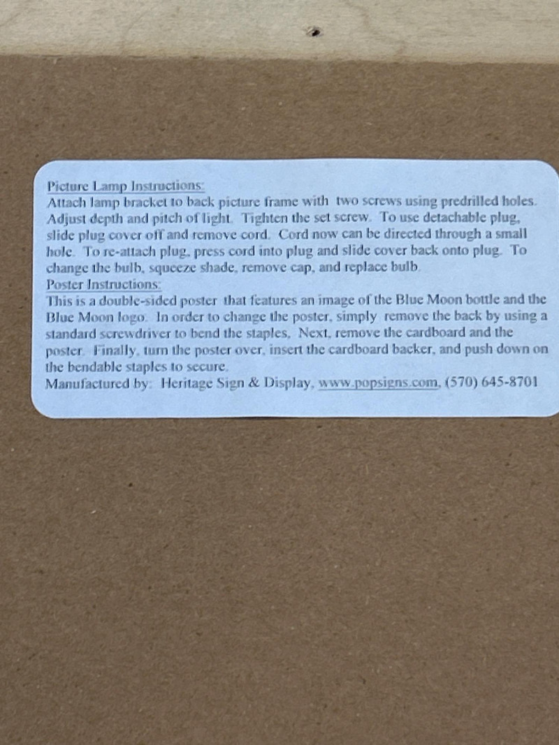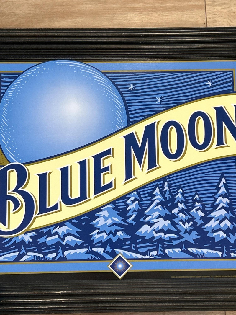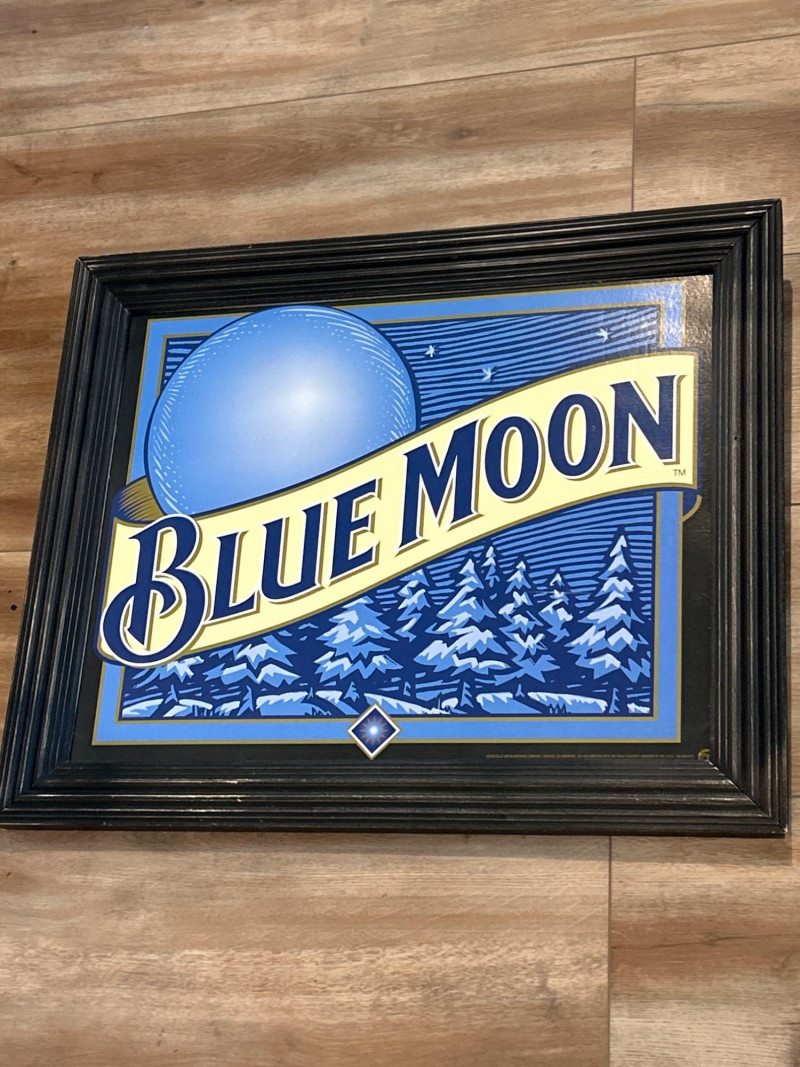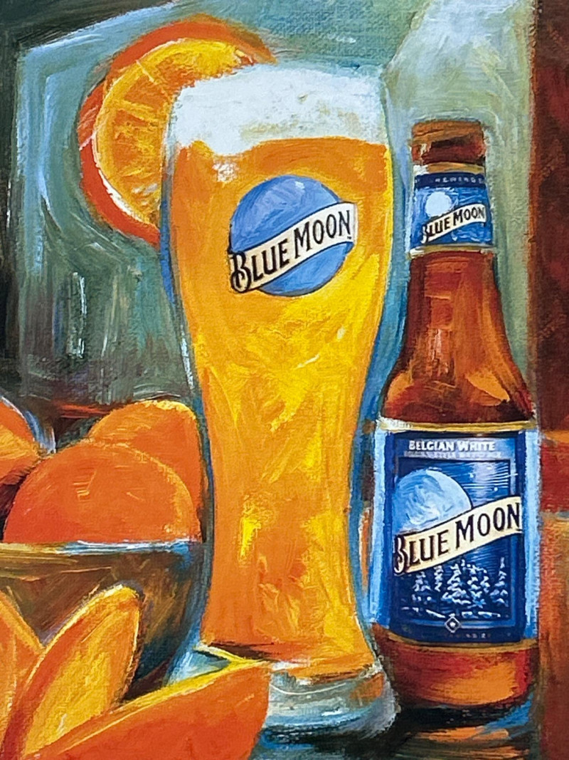Dimensions: Approx. 20" × 20" (framed) Maker: Heritage Sign & Display for Blue Moon Brewing Company Date: 2005 Material: Printed poster mounted in a black grooved wood frame Design: Nighttime landscape featuring a glowing full moon above snow-covered pines, with the classic Blue Moon logo in cream and blue. Accented with gold and blue border detailing. Features: Original brewery promotional artwork; rear instructions included for optional picture light installation (hardware not included). Style Notes: Crisp, graphic composition with strong brand identity. Ideal for bar décor, brewery-themed interiors, or beer memorabilia collections. Dimensions: Approx. 20" × 20" (framed) Artist: Signed S. Bartok Maker: Heritage Sign & Display for Blue Moon Brewing Company Date: 2005 Material: Printed poster mounted in the same reversible black grooved wood frame Design: Lively bar interior showcasing a pint of Blue Moon Belgian White with orange garnish, bottle, and bar taps in the background. Includes the tagline “Artfully Crafted.” Features: Artist-signed promotional illustration; frame allows reversible display. Style Notes: Richly colored, hand-painted aesthetic adds warmth and character. A standout collectible for home bars, taprooms, or brewery-themed décor.Blue Moon Night Landscape Logo Sign (2005)