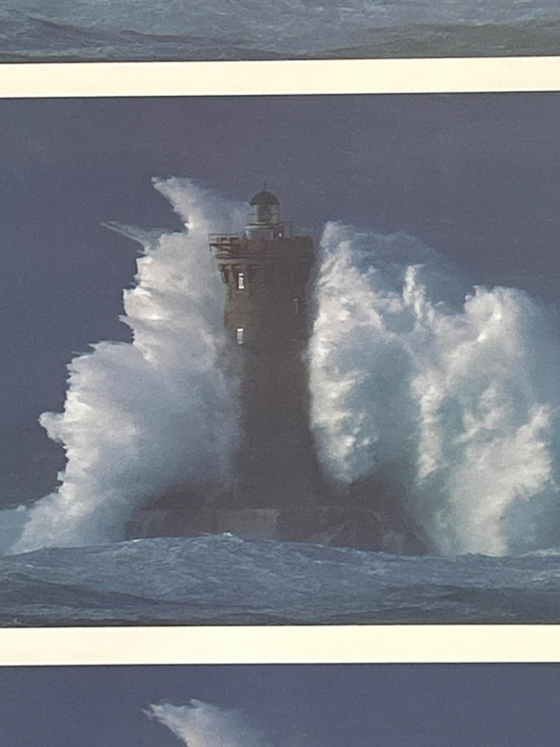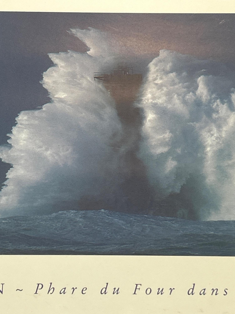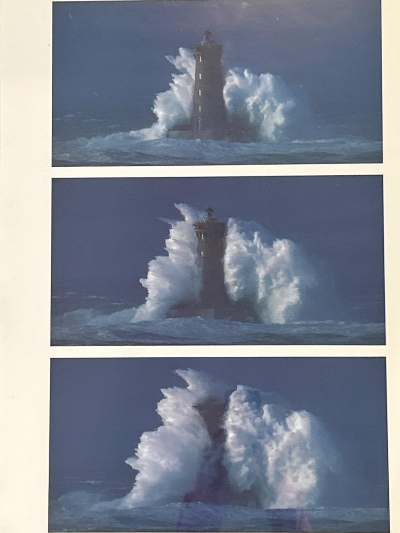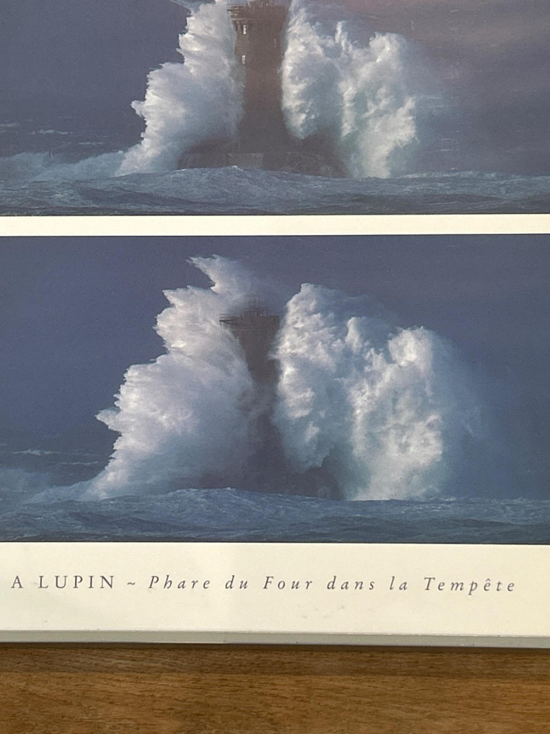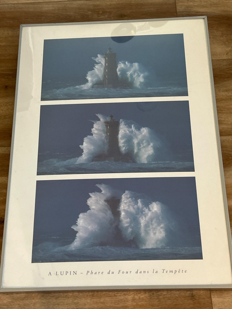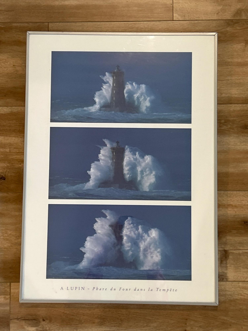 A striking framed triptych capturing the dramatic resilience of the Phare du Four lighthouse amid a tempestuous sea. This photographic sequence features three vertically arranged images, each documenting a moment of impact as colossal waves crash against the historic French lighthouse. The composition showcases nature’s raw power juxtaposed with human engineering, evoking themes of endurance and solitude. Dimensions: 29" x 28" (including frame) Medium: High-resolution photographic print on archival paper Presentation: Professionally mounted in a black wood frame with protective glazing Subject: Phare du Four lighthouse, Brittany coast, France Language Note: Captioned in French: “A LUPIN – Phare du Four dans la Tempête” This piece is ideal for collectors of maritime photography, coastal memorabilia, or those drawn to the poetic tension between sea and structure. A visually arresting addition to any wall.