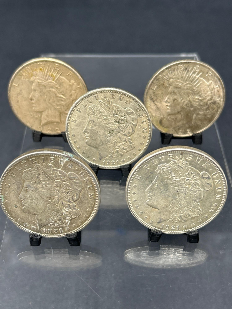 A compelling collector’s lot featuring five vintage U.S. silver dollars, comprising three Morgan Dollars and two Peace Dollars, each presented on individual black coin stands for display. Included Coins: Morgan Dollars (3 coins): 1921 (2 examples) – Final year of Morgan Dollar mintage, showcasing Lady Liberty in a Phrygian cap with “E PLURIBUS UNUM” encircling the obverse. Reverse features a heraldic eagle clutching arrows and olive branch. 1887 – A classic late 19th-century issue with sharp relief and well-preserved details. Peace Dollars (2 coins): 1922 & 1923 – Early issues of the Peace Dollar series, designed to commemorate the end of World War I. Obverse features Lady Liberty with a radiating crown; reverse depicts a perched eagle with “PEACE” inscribed below. Highlights: All coins are composed of 90% silver. Obverse and reverse details remain legible, with visible inscriptions and dates. Coins are ungraded but present well for display or further numismatic evaluation. Ideal for collectors seeking transitional examples between the Morgan and Peace series.
