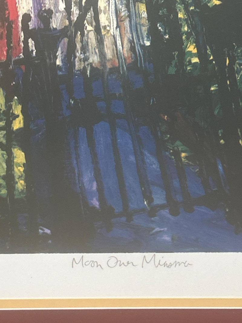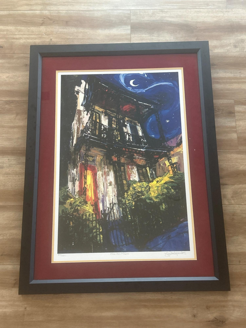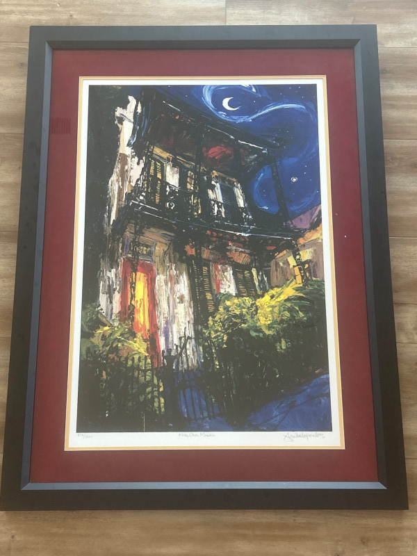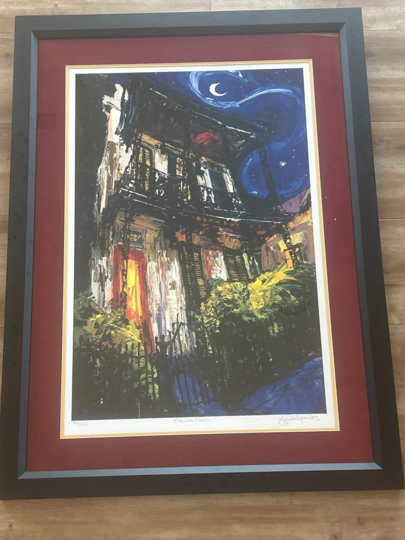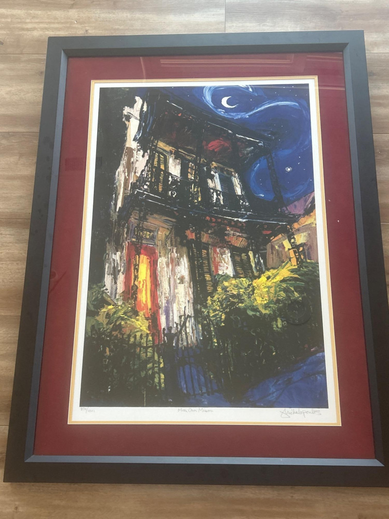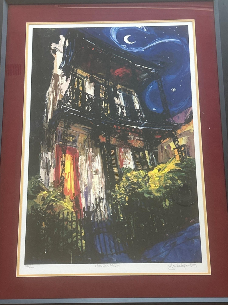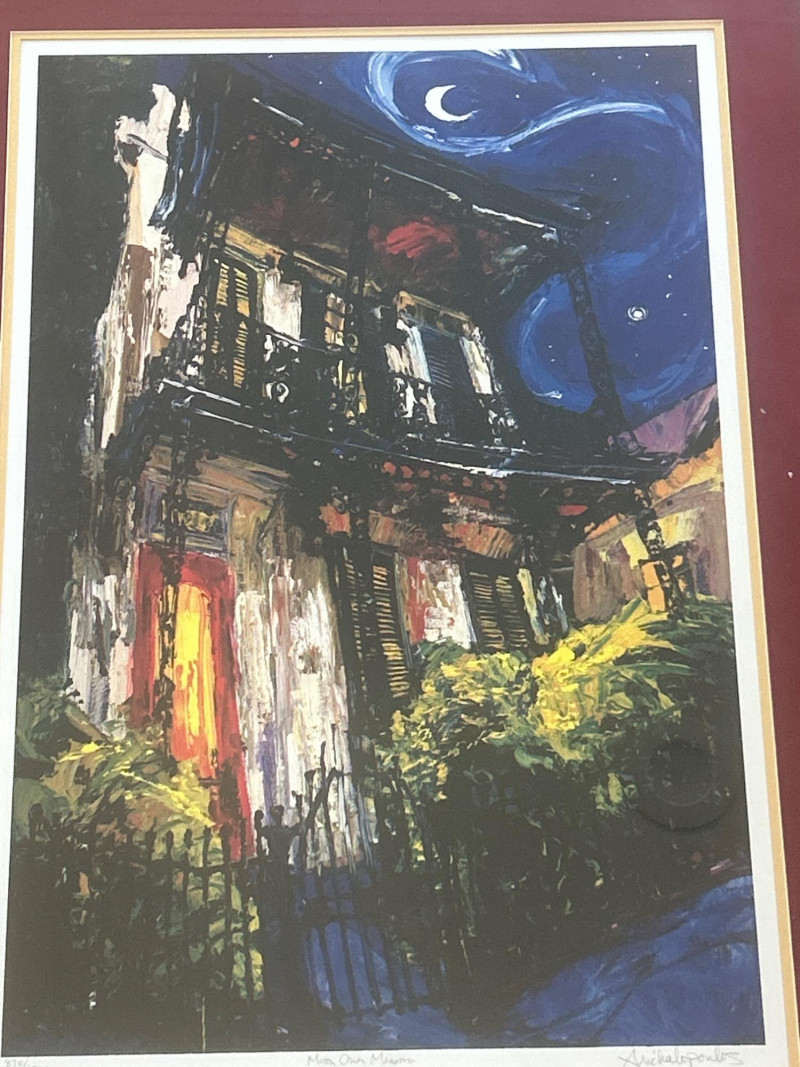 Size: approx. 41 × 30 in. A dramatic night scene by renowned New Orleans artist James Michalopoulos, known for his vibrant, distorted portrayals of the city’s architecture. Moon Over Miasma captures a French Quarter residence beneath a swirling indigo sky and crescent moon, rendered in his signature bold palette and expressive brushwork. Hand-signed lower right, titled in pencil lower center, and numbered 875/1001. Elegantly framed with deep red matting; artist bio mounted on verso. James Michalopoulos’ works are held in notable collections including the New Orleans Museum of Art and DaimlerChrysler Corporation, and are favored by collectors such as Bruce Willis, Sharon Stone, and Bonnie Raitt. He is also celebrated for his official New Orleans Jazz & Heritage Festival posters, several of which became record-breaking best sellers.About the Artist: