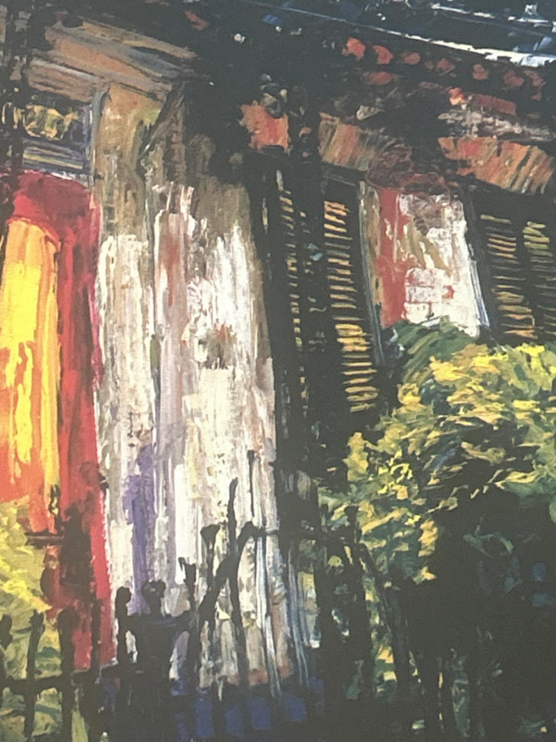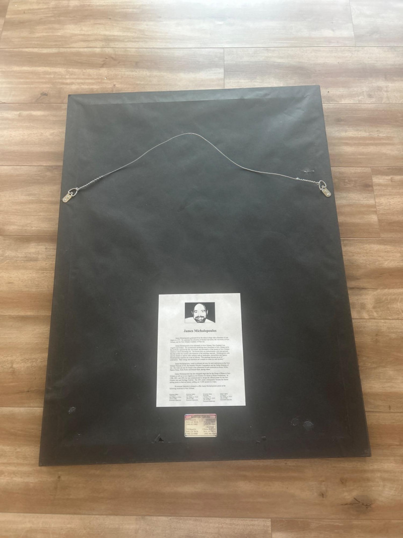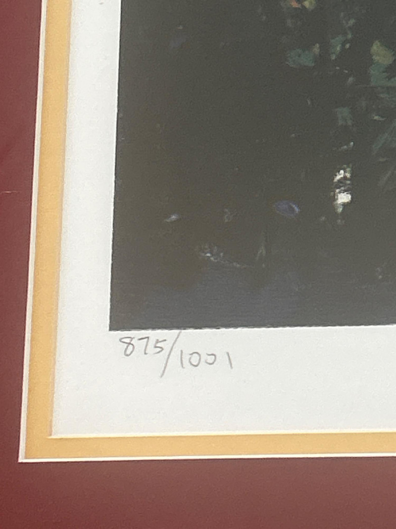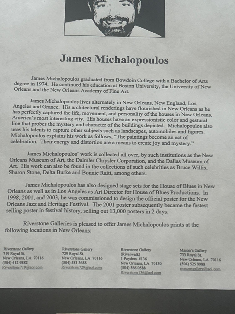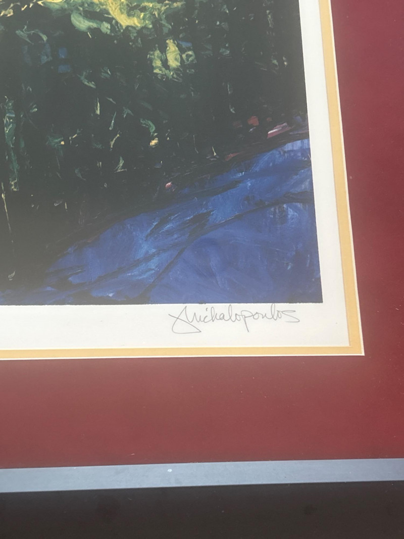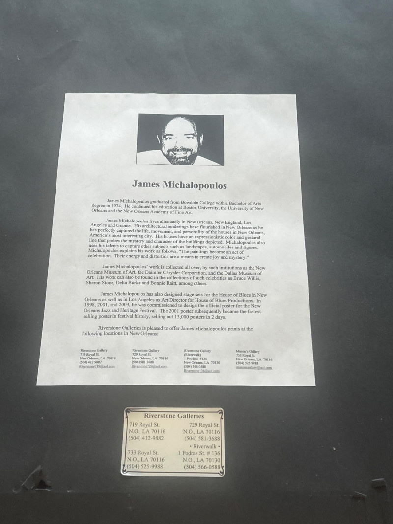 Size: approx. 41 × 30 in. A dramatic night scene by renowned New Orleans artist James Michalopoulos, known for his vibrant, distorted portrayals of the city’s architecture. Moon Over Miasma captures a French Quarter residence beneath a swirling indigo sky and crescent moon, rendered in his signature bold palette and expressive brushwork. Hand-signed lower right, titled in pencil lower center, and numbered 875/1001. Elegantly framed with deep red matting; artist bio mounted on verso. James Michalopoulos’ works are held in notable collections including the New Orleans Museum of Art and DaimlerChrysler Corporation, and are favored by collectors such as Bruce Willis, Sharon Stone, and Bonnie Raitt. He is also celebrated for his official New Orleans Jazz & Heritage Festival posters, several of which became record-breaking best sellers.About the Artist: