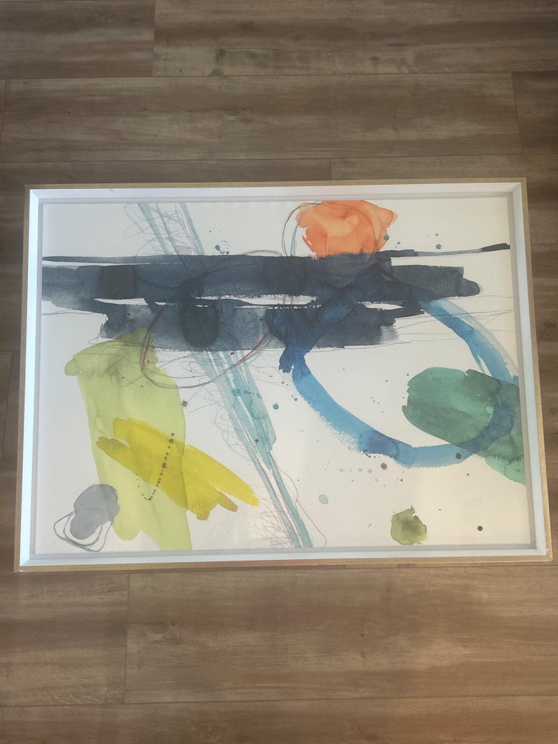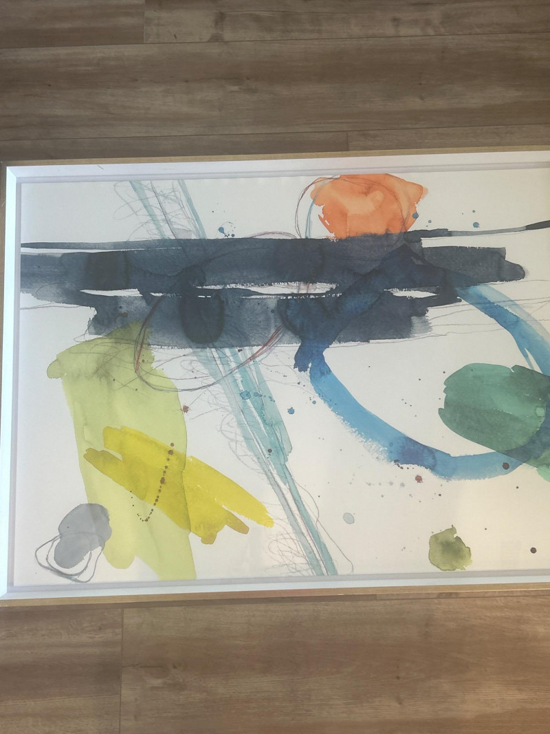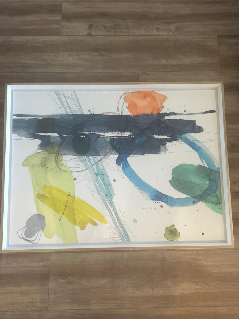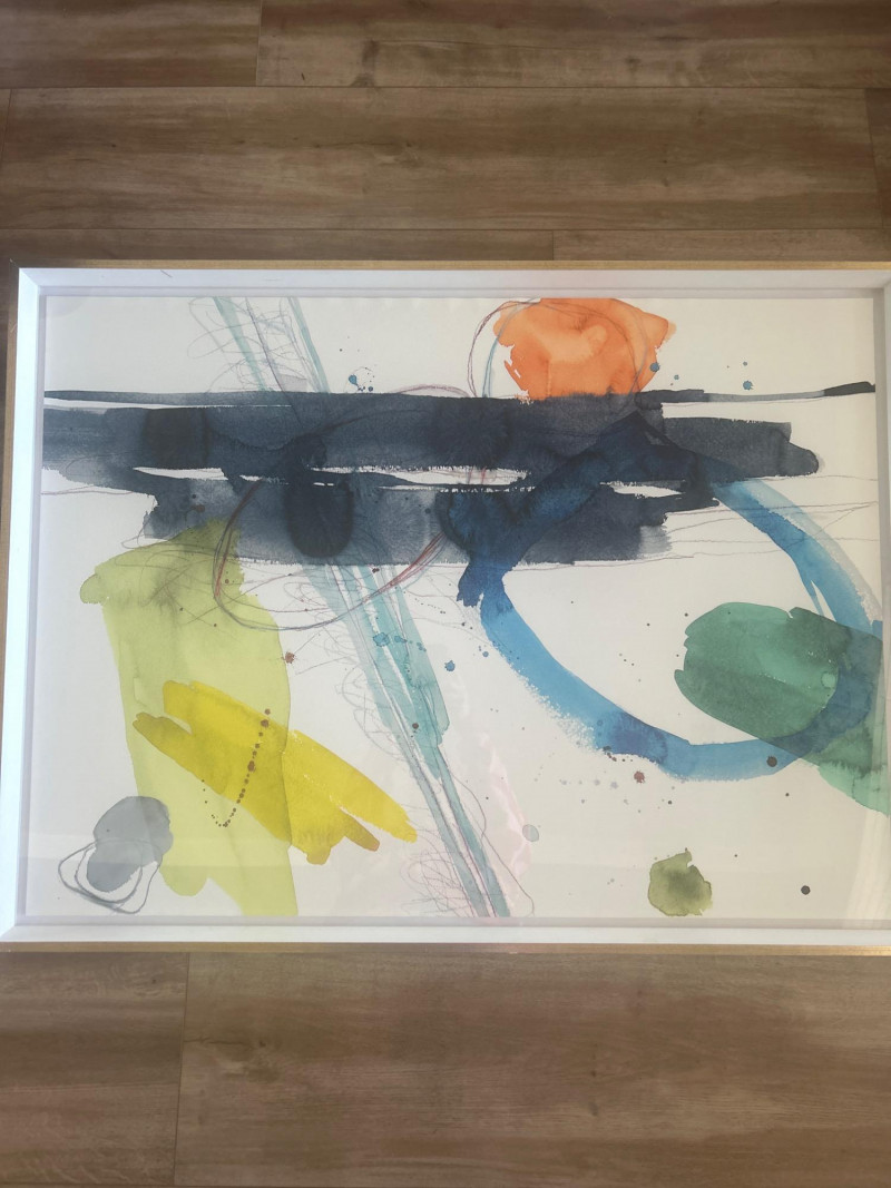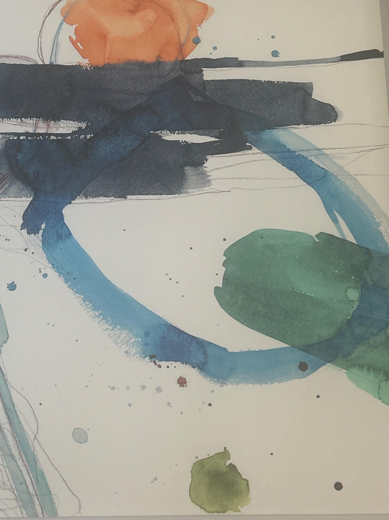 Notes: Unsigned; likely a contemporary decorative work, acquired circa 2020 A striking contemporary abstract rendered in mixed media, this large-format composition features fluid washes of deep indigo, sky blue, citrus yellow, and moss green, punctuated by spontaneous splashes of orange and delicate graphite linework. The interplay of layered transparency and expressive brushstrokes evokes a sense of motion and depth, while the dripped accents lend a raw, organic energy. Float-mounted for a clean, gallery-style presentation, this piece offers a bold yet airy aesthetic ideal for modern interiors.