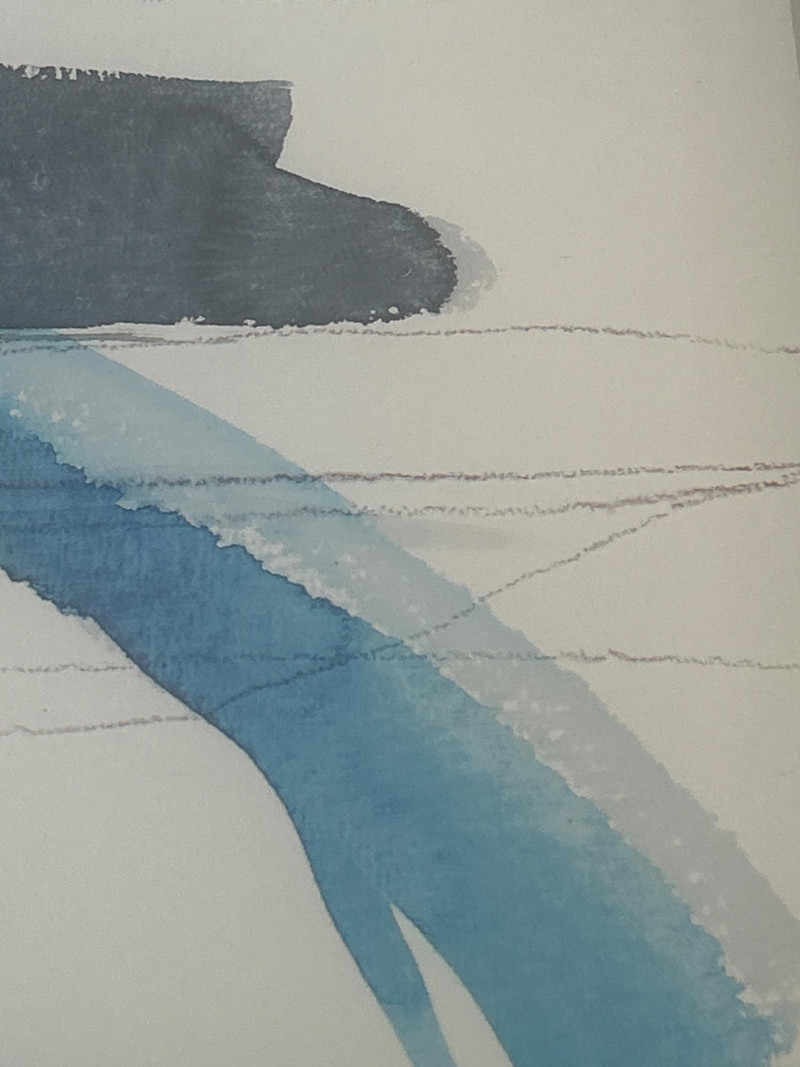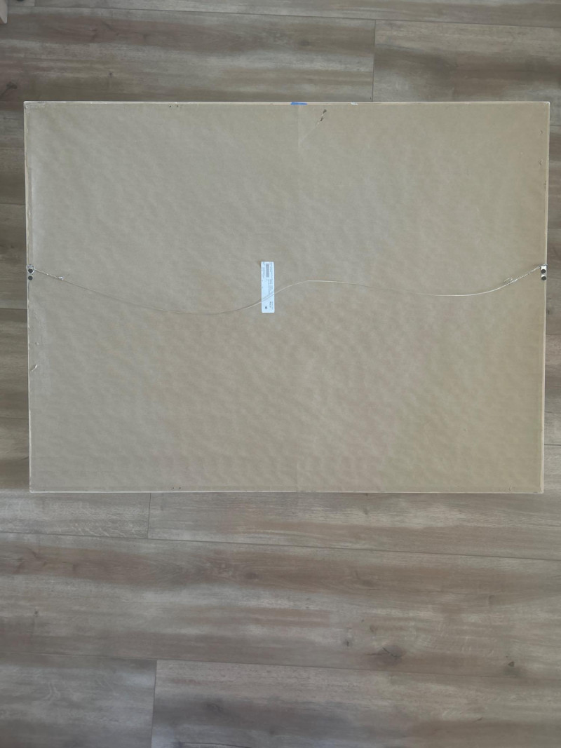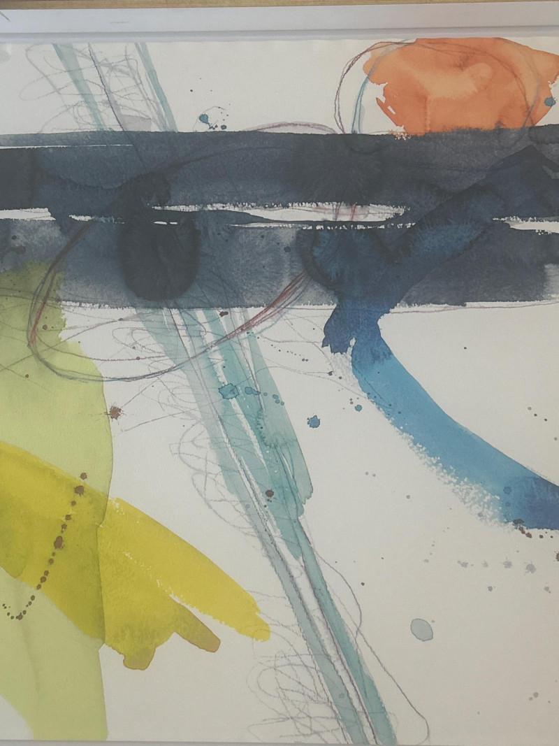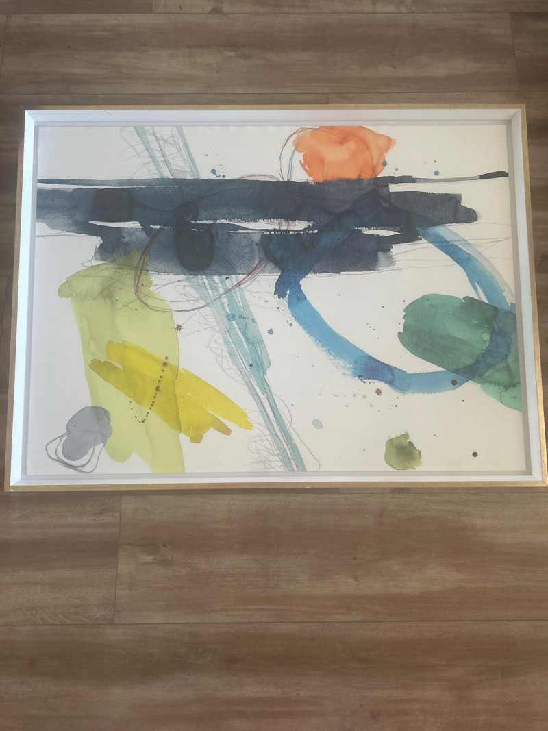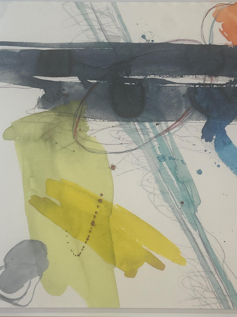 Notes: Unsigned; likely a contemporary decorative work, acquired circa 2020 A striking contemporary abstract rendered in mixed media, this large-format composition features fluid washes of deep indigo, sky blue, citrus yellow, and moss green, punctuated by spontaneous splashes of orange and delicate graphite linework. The interplay of layered transparency and expressive brushstrokes evokes a sense of motion and depth, while the dripped accents lend a raw, organic energy. Float-mounted for a clean, gallery-style presentation, this piece offers a bold yet airy aesthetic ideal for modern interiors.