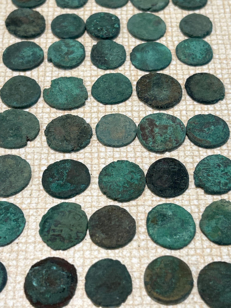 This lot features aged coins or tokens, each exhibiting advanced corrosion and surface degradation. The coins range from approximately 0.75" to 1.25" in diameter and are presumed to be composed of copper or bronze-based alloys, as suggested by the greenish patina and oxidized texture. Many pieces are almost porous and flakey, with surfaces showing signs of mineral leaching and structural fragility—indicative of prolonged burial or environmental exposure. Material: Presumed copper, bronze, or brass alloy Condition: Uncleaned; heavy corrosion; surfaces are porous and flakey; inscriptions largely obscured Dimensions: Approx. 0.75"–1.25" diameter (see image reference) Provenance: Unknown; presumed historical or archaeological origin Ideal for numismatists, restoration specialists, or historical researchers seeking unprocessed specimens. These coins may represent colonial-era currency, trade tokens, or regional coinage, though no legible mint marks are currently visible. Their untouched state preserves authenticity for conservation or metallurgical study.Key Details:
