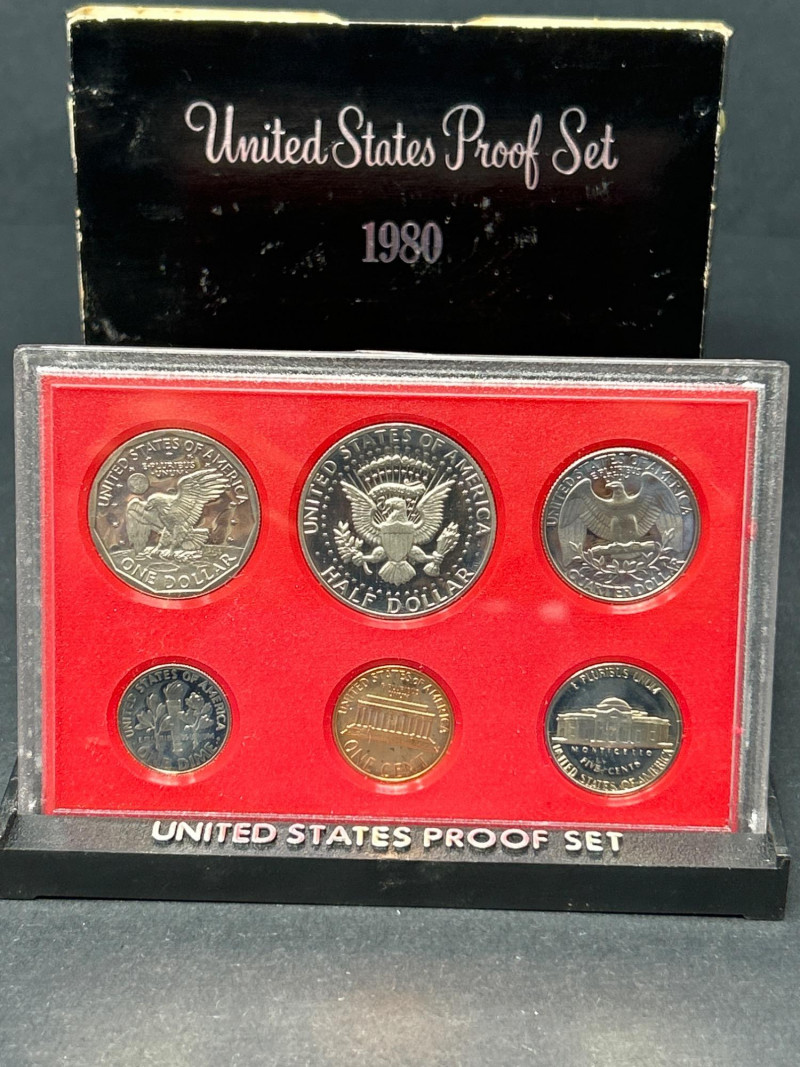Includes four complete San Francisco–minted Proof Sets. Features the iconic 1976 Bicentennial quarter, half, and dollar with dual date “1776–1976.” All coins bear the “S” mintmark and display classic mirror fields with frosted devices. Packaged in original government sleeves with red lenses; outer boxes show light scuffing. Coins remain brilliant with strong cameo contrast. Set B (1979–1982):