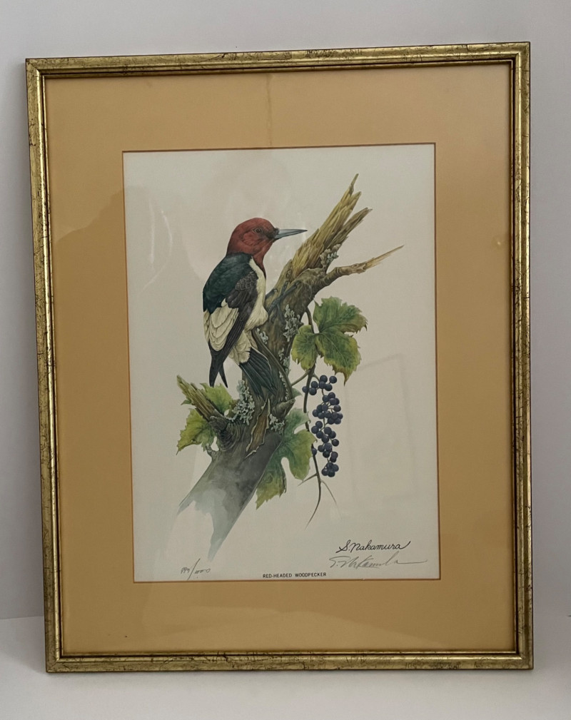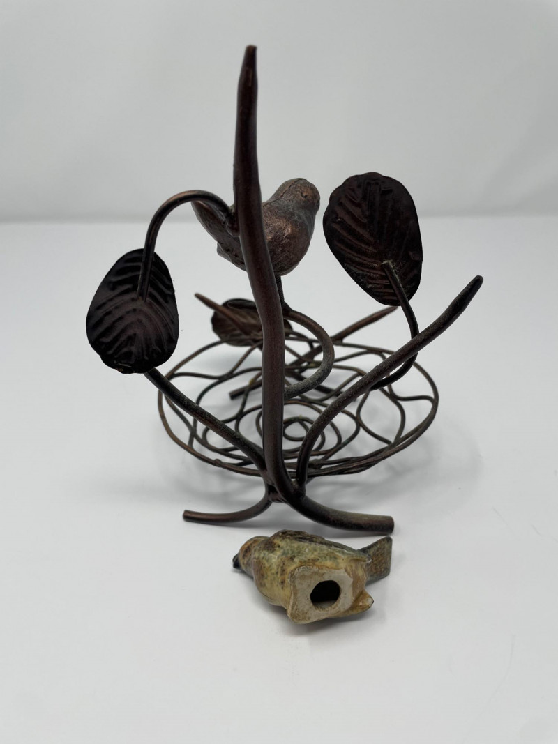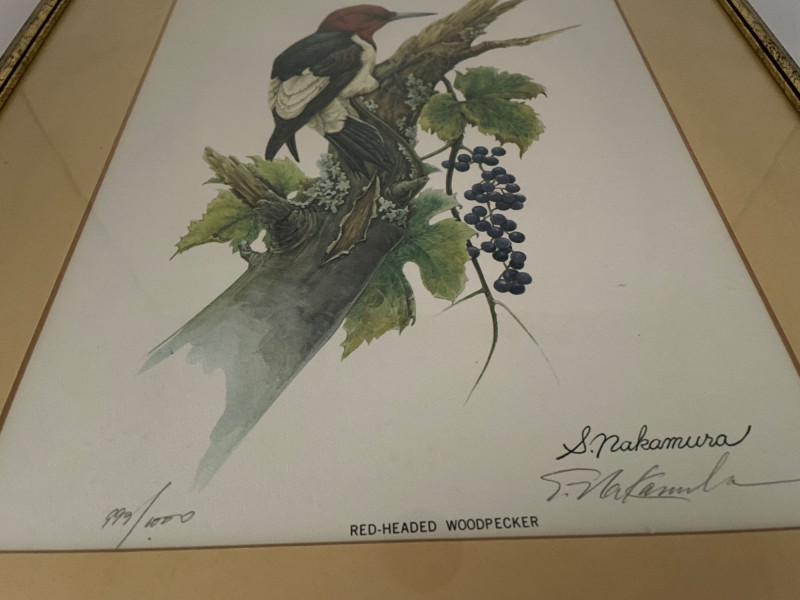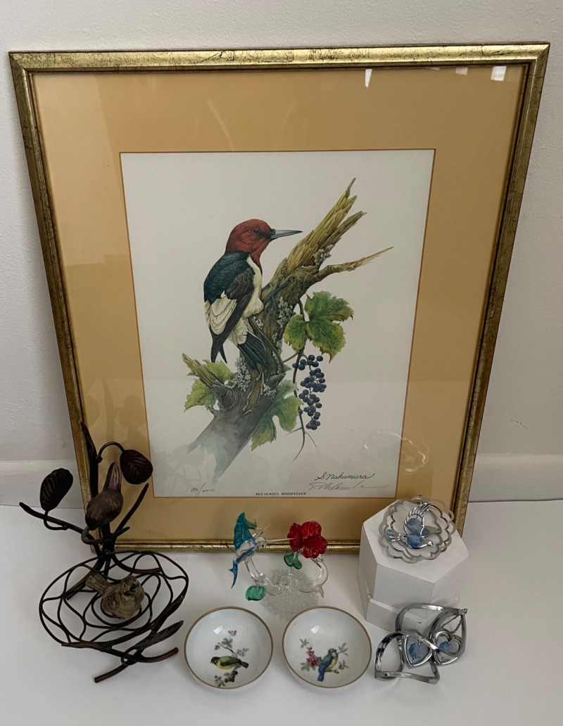 Charming bird-themed décor collection Framed Bird Print (Back) Metal Bird Sculpture (Bottom Left) Porcelain Bird Trinket Dishes (Bottom Center) Glass Bird Figurines (Bottom Center) Additional Decorative Pieces (Bottom Right) Red-Headed Woodpecker Framed Print by S. Nakamura 29” x 16” Kaiser Porcelain Dishes #22 and #61 from Germany. Both 3” Hummingbird Glass Art 3 1/2” x 4” Bird and Heart Ornaments Key Elements