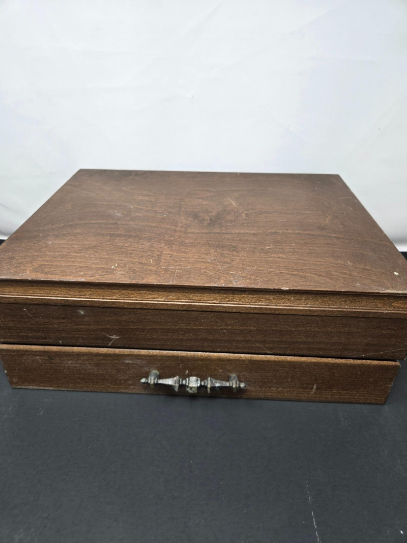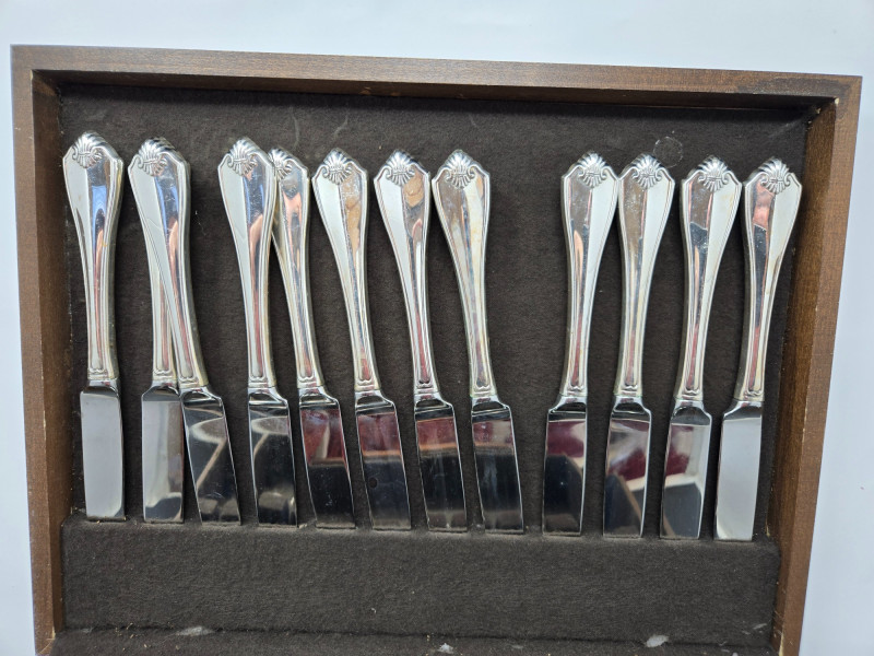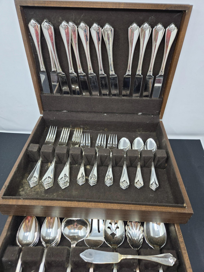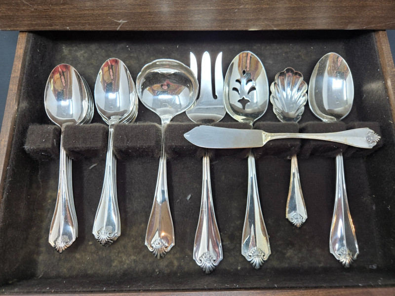 65-piece Oneida silver plated flatware set displayed in a wooden storage chest with a dark felt lining. Pieces Included: Design: Condition:Set Details