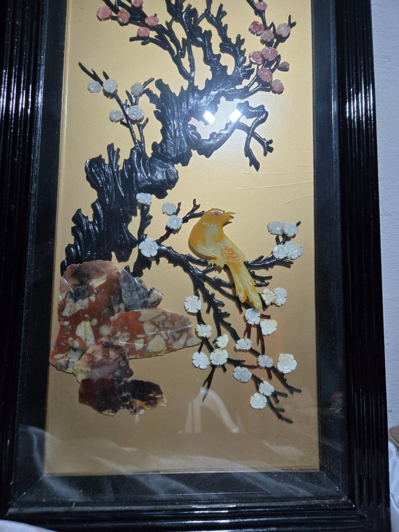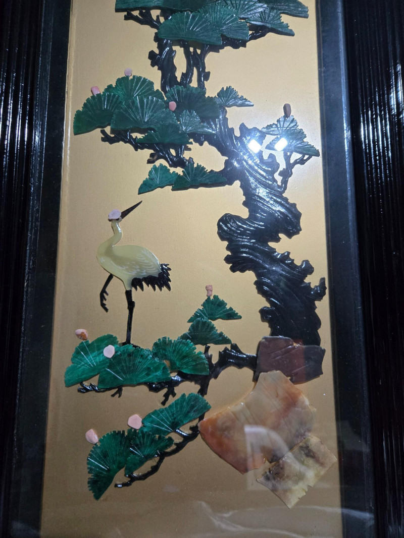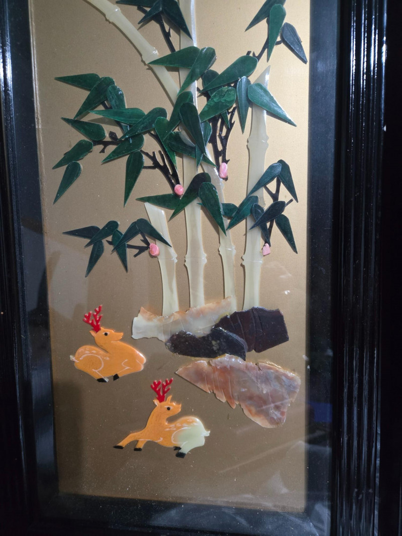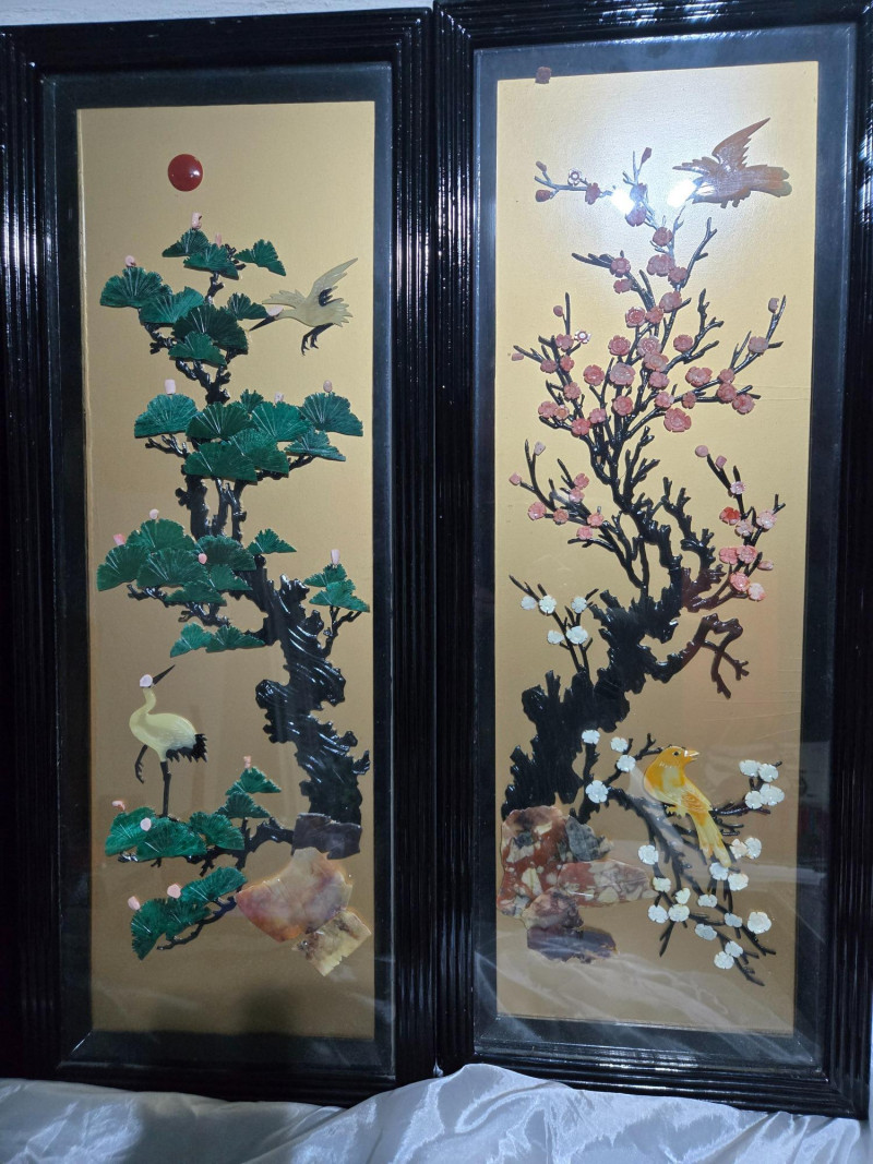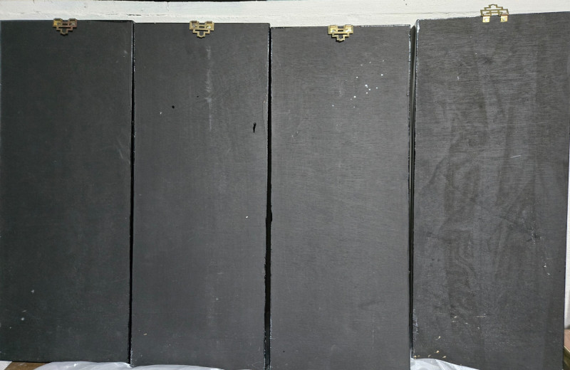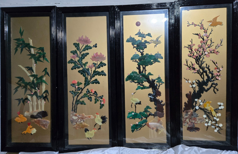 Asian-inspired lacquer art panels, each framed in black and featuring intricate designs on a golden background. Left Panel: Second Panel: Third Panel: Right Panel:Overall Composition
