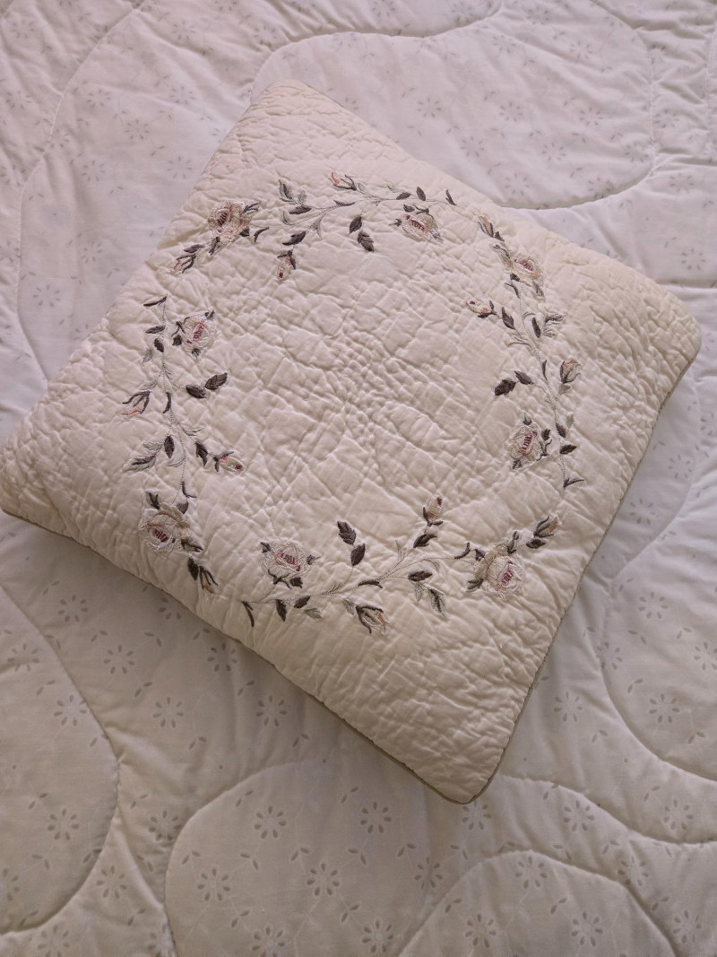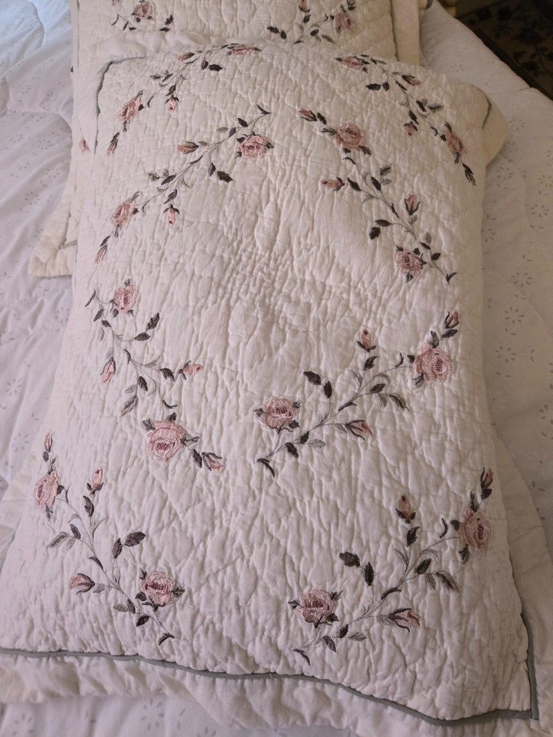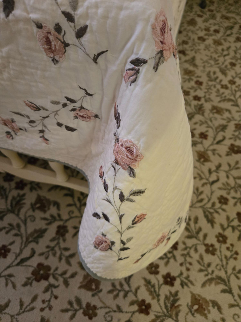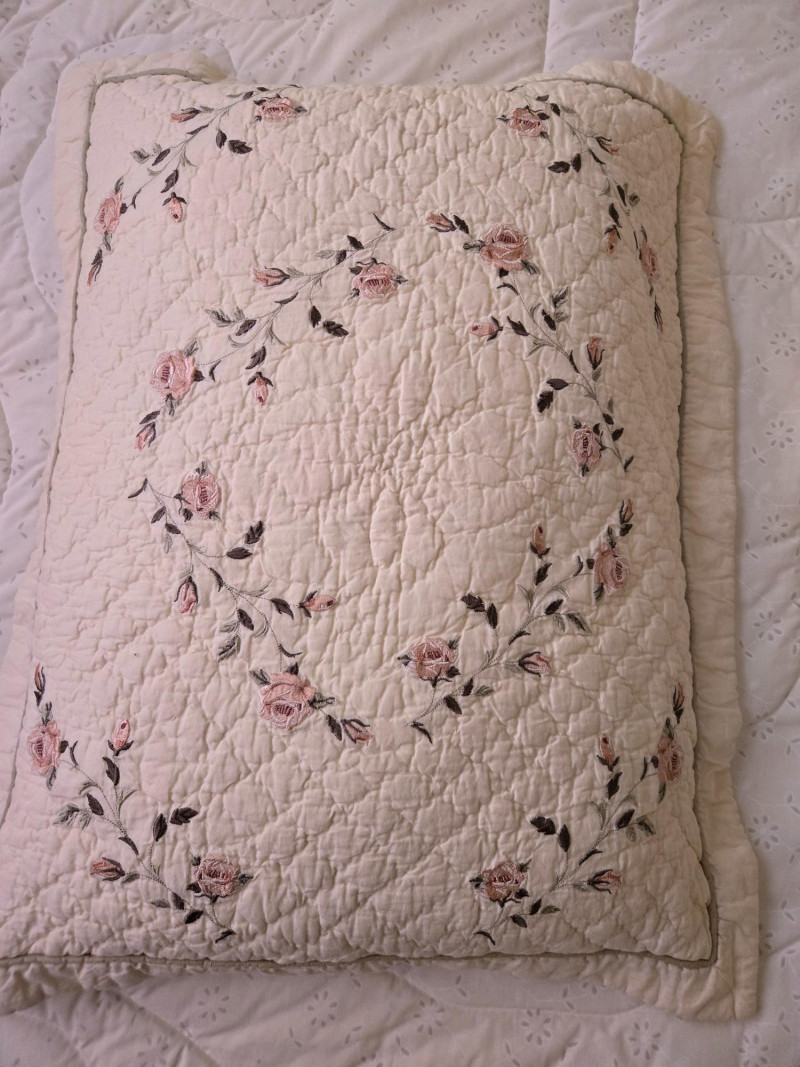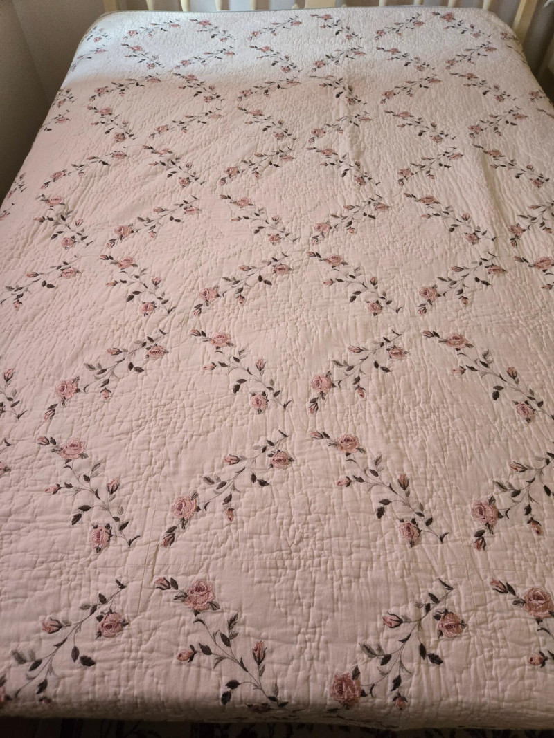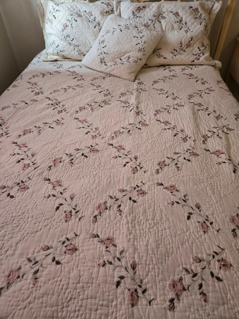 Lot # 192 - 88" x 86" Rose Patterned Quilted Bed Spead., Samsung & a Small Pillow