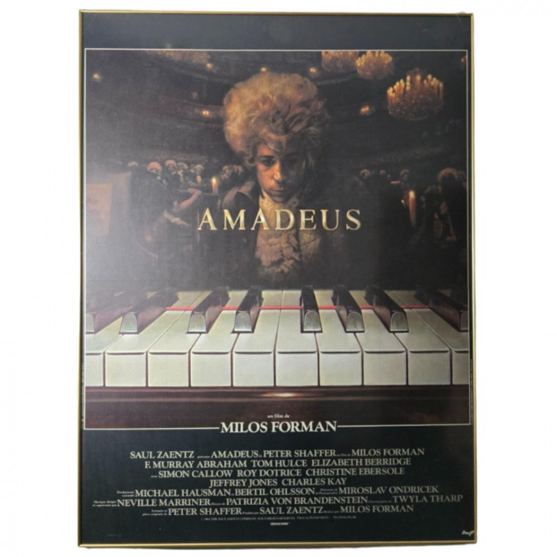 This is your chance to own a truly iconic piece of cinematic history: an original vintage movie poster for Miloš Forman's masterpiece, Amadeus (1984). This visually striking poster captures the essence of the film, showcasing the dramatic and flamboyant image of Wolfgang Amadeus Mozart, as famously portrayed by Tom Hulce, standing proudly at the piano. Summary: A visually stunning original theatrical release poster for Amadeus (1984), Miloš Forman’s Oscar-winning masterpiece. This oversized 62" × 46" print features Tom Hulce as Mozart in a dramatic pose above a piano keyboard, set against a lavish concert hall backdrop. Not a reproduction—this is a genuine vintage promotional piece from the film’s initial release, celebrating its sweep of 8 Academy Awards including Best Picture, Best Director, and Best Actor for F. Murray Abraham. A must-have for collectors of film history, classical music ephemera, or 1980s design. Film Title: Amadeus (1984) Director: Miloš Forman Production: Saul Zaentz Company Material: Printed poster stock Dimensions: 62" L × 46" W Design Features: Central image of Mozart above piano keys Candlelit concert hall background Title and credits in elegant serif font Era: Original 1984 release Condition: Excellent vintage; no major flaws noted About the Film: Amadeus swept the 1985 Academy Awards, winning an impressive 8 Oscars, including Best Picture, Best Director, and Best Actor for F. Murray Abraham's portrayal of Salieri. It tells the compelling, albeit fictionalized, story of the rivalry between the prodigious Mozart and the envious court composer Antonio Salieri, delving into themes of genius, ambition, and divine talent. This is an original release movie poster from 1984, not a modern reproduction.Item Details