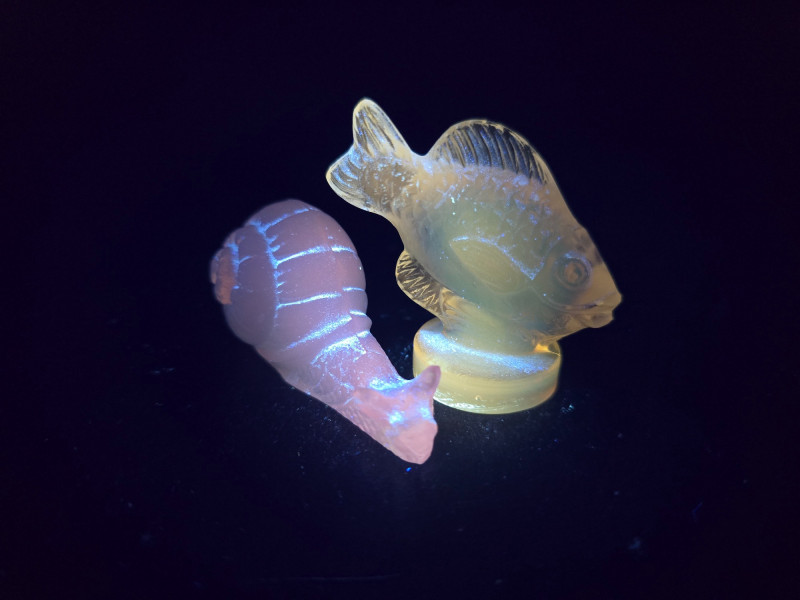 A pair of exquisite opalescent glass figurines by Sabino of France, featuring a standing fish and a reclining snail. Crafted in the signature Sabino style, these pieces glow with ethereal hues of blue, yellow, and violet under changing light. The fish, likely “Poisson L’Eglefin” or “Poisson San Piarre,” stands upright with detailed fins and scales, while the snail showcases a coiled shell and extended antennae. Both pieces are signed and measure approximately 3" wide. A luminous duo for collectors of French Art Deco glass. Maker: Sabino (France) Material: Opalescent glass Color Palette: Iridescent blue, yellow, and violet tones- Glows under UV light Dimensions: Approx. 3" W × 2" H each Design Features: Upright fish with circular base Reclining snail with extended head and coiled shell Signed base (Sabino France) Era: Mid-20th century Condition: Excellent; no chips, cracks, or repairs noted Item Details