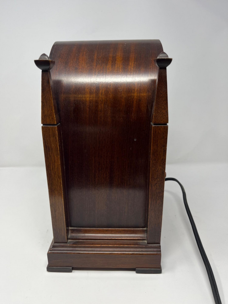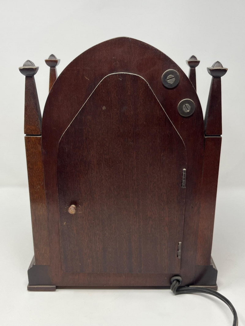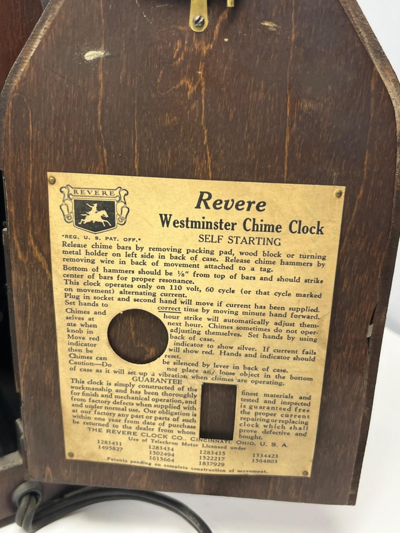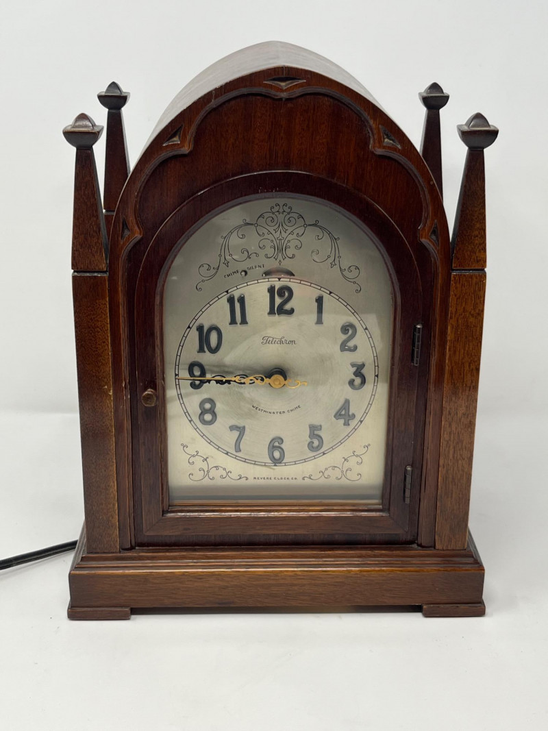 Summary: A stately Revere Telechron electric mantel clock featuring a rich wood case with gothic arch silhouette and finial accents. The silvered dial displays black Arabic numerals and ornate gold-tone hands, including a crescent moon second hand. Powered by a reliable Telechron motor, this clock plays the iconic Westminster chimes on the quarter hour and hour. A classic example of mid-century American craftsmanship, ideal for collectors or those seeking vintage ambiance with modern convenience. Maker: Revere Clock Company (Telechron motor) Model: Likely M38 or R-935 series Movement: Electric (Telechron synchronous motor) Chime: Westminster quarter-hour and hourly melody Material: Wood case with silvered metal dial Dimensions: 10" L × 7" W × 13" H Design Features: Gothic arch silhouette with finials Silver dial with black numerals and decorative scrollwork Gold-tone hands and crescent moon second hand Power cord for plug-in operation Era: Circa 1930s–1940s Condition: Vintage; working order not guaranteedItem Details