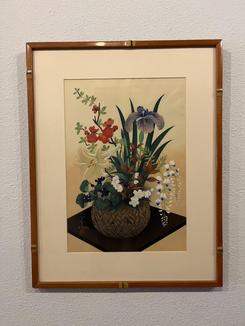 Summary: A masterful kachō-e (bird-and-flower) woodblock print by Ohno Bakufu (1888–1976), titled Flowers in Bamboo Basket (Spring). This composition features irises, lilies, and orchids arranged in a woven basket, rendered with delicate linework and subtle color gradations. Published by Kyoto Hanga-In in the 1950s, the print is framed in a bamboo-style frame by Tokyo’s Yubido studio. A serene and elegant celebration of seasonal beauty from one of Japan’s most respected 20th-century printmakers. Artist: Ohno Bakufu (大野麦風, 1888–1976) Title: Flowers in Bamboo Basket (Spring) Publisher: Kyoto Hanga-In Medium: Woodblock print (mokuhanga) Format: Oban (approx. 27 × 37.5 cm image size) Frame: Bamboo-style frame by Yubido, Tokyo Dimensions (Framed): 21" L × 16" W Era: 1950s Condition: Excellent; vibrant colors and clean impressionItem Details