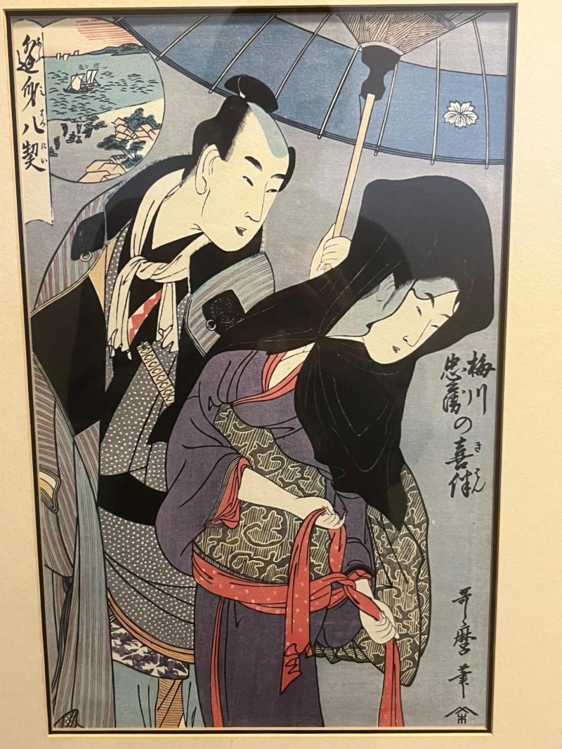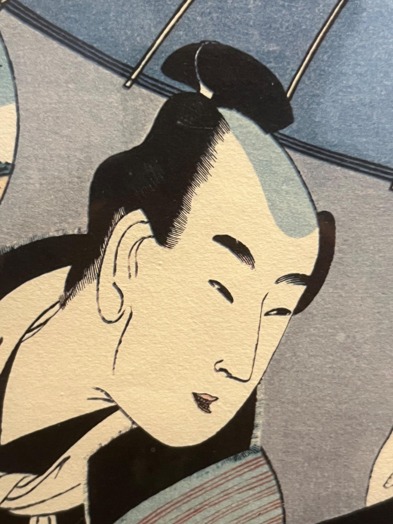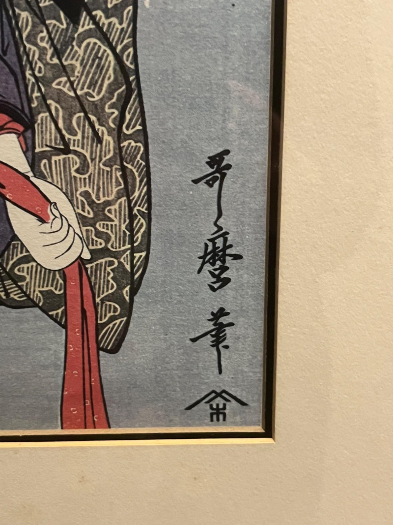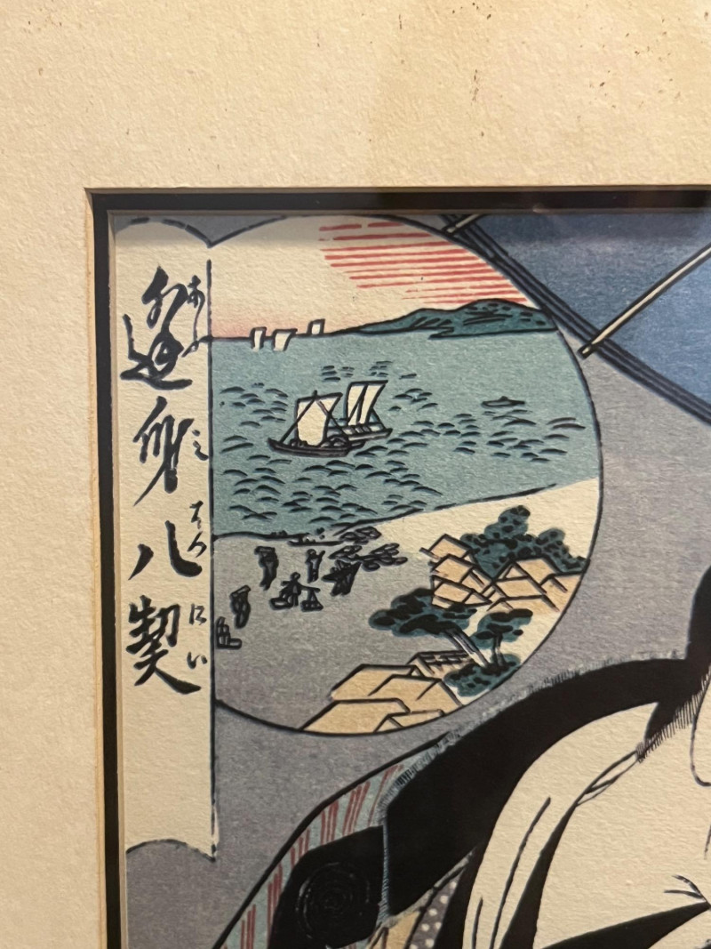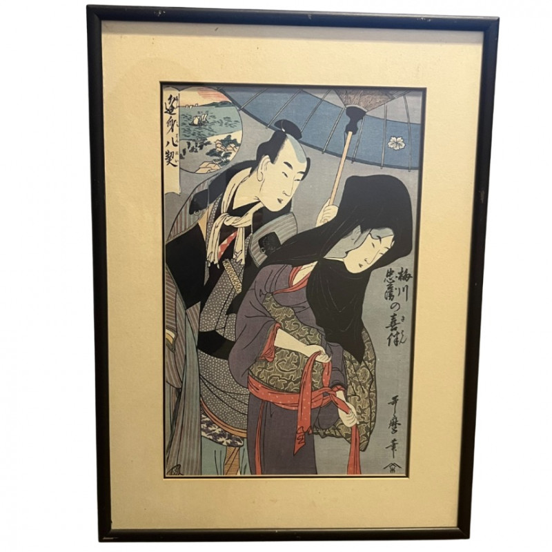 This is an opportunity to own a beautiful, framed reproduction of a classic Japanese ukiyo-e woodblock print by the master artist Kitagawa Utamaro (c. 1753–1806). Artist: Kitagawa Utamaro, one of the most celebrated ukiyo-e artists of the Edo period. Title: "Happy Togetherness for Umegawa and Chûbei" Subject: The print depicts the famous and tragic love story of the courtesan Umegawa and the merchant Chûbei, a popular subject in Japanese folklore and theater. The scene captures an intimate moment between the two figures, with Chûbei holding an umbrella over them. The delicate lines, vivid colors, and expressive faces are hallmarks of Utamaro's style. Medium: This piece is a high-quality reproduction of the original woodblock print, professionally framed under glass. Condition: Excellent, with the colors remaining vibrant and the paper in good condition. The frame shows minor signs of wear consistent with age. This framed reproduction is a stunning decorative piece for any home and a must-have for collectors of Japanese art and history. It is ready to hang and be admired. Please see photos for a closer look at the condition and details.