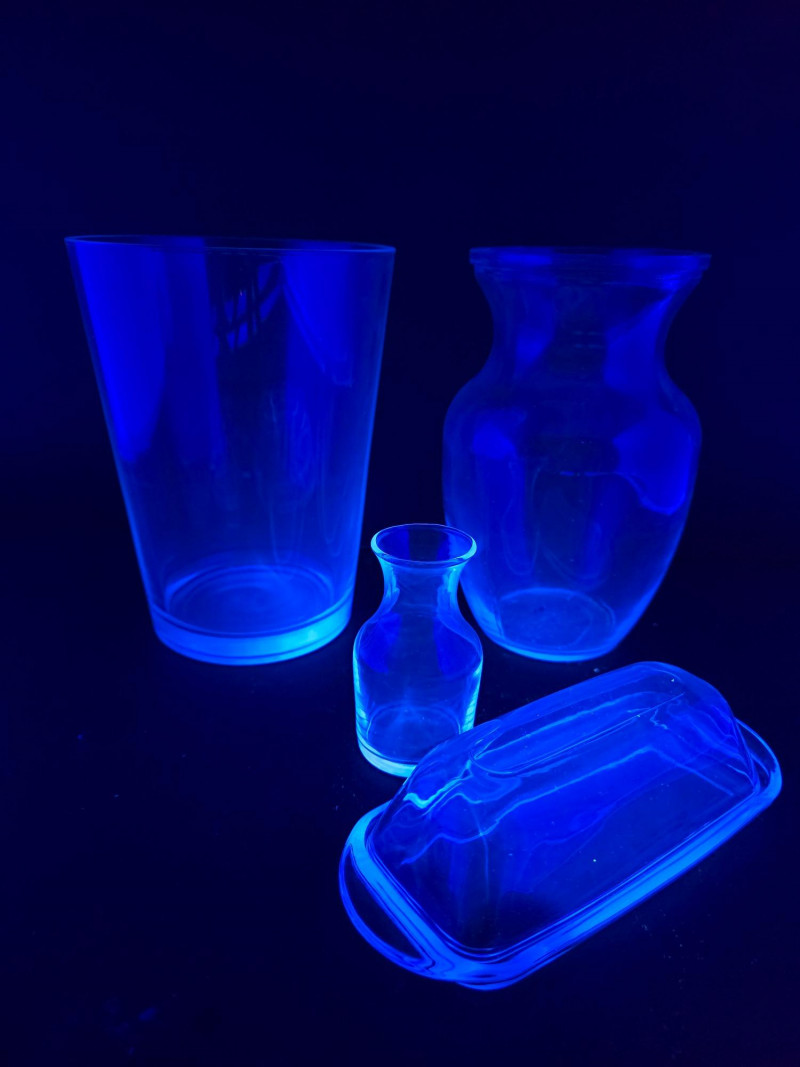 Summary: A visually striking 4-piece collection of electric blue glassware, each piece exhibiting vivid fluorescence under UV light. Includes a cylindrical tumbler, narrow-neck vase, miniature carafe, and covered butter dish. Likely mid-century pressed or molded glass, possibly incorporating manganese or trace uranium for glow effect. A captivating set for collectors of novelty glass, barware, or blacklight display. Material: Pressed or molded glass with UV-reactive compounds Color: Clear glass- Electric blue (fluoresces under blacklight) Set Includes: 1 cylindrical tumbler 1 narrow-neck vase 1 miniature carafe 1 covered butter dish with lid Dimensions: Vary by piece; approx. 3"–6" tall Design Features: Smooth and faceted contours Uniform manganese glow under UV light Likely mid-century novelty or barware glass Era: 1950s–1970s Condition: Excellent vintage; no chips or cracks noted Item Details