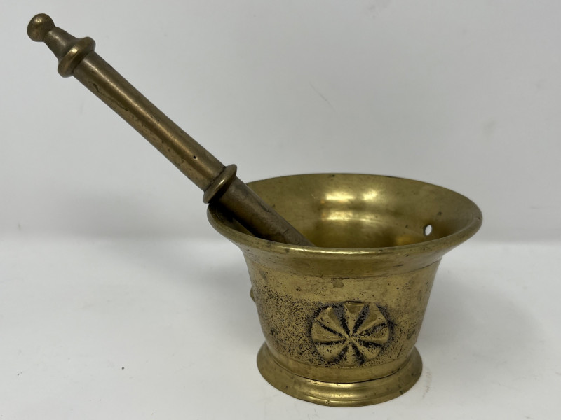 Lot # 178 - Antique Solid Brass Mortar and Pestle Apothecary Set