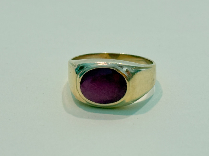 Solid 10k gold ring featuring a flush-set oval cabochon ruby with deep purple-red tones. Smooth, polished band with vintage styling and minimalist elegance. Size: 7.5