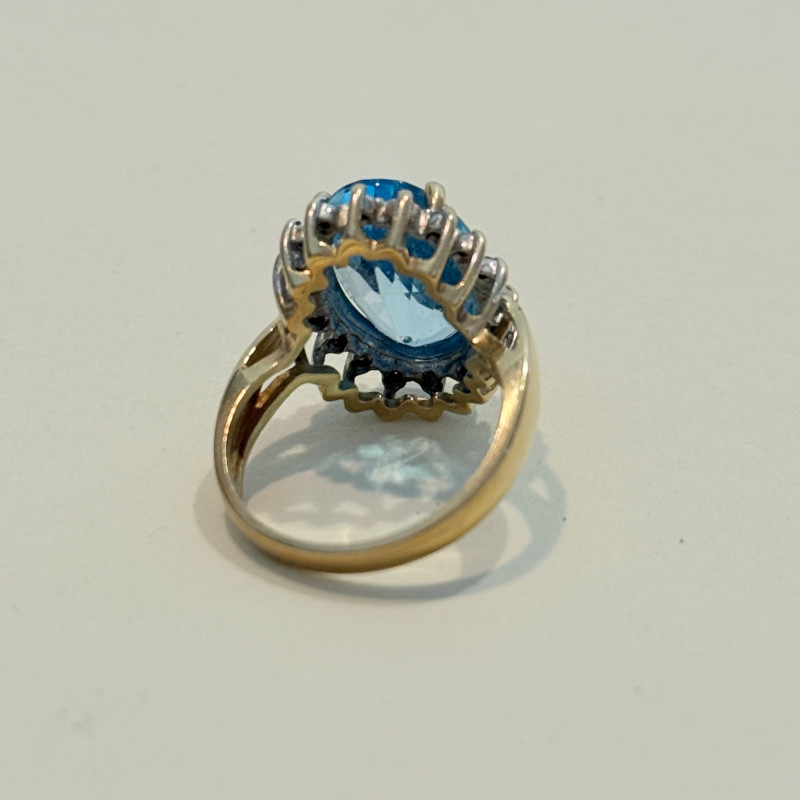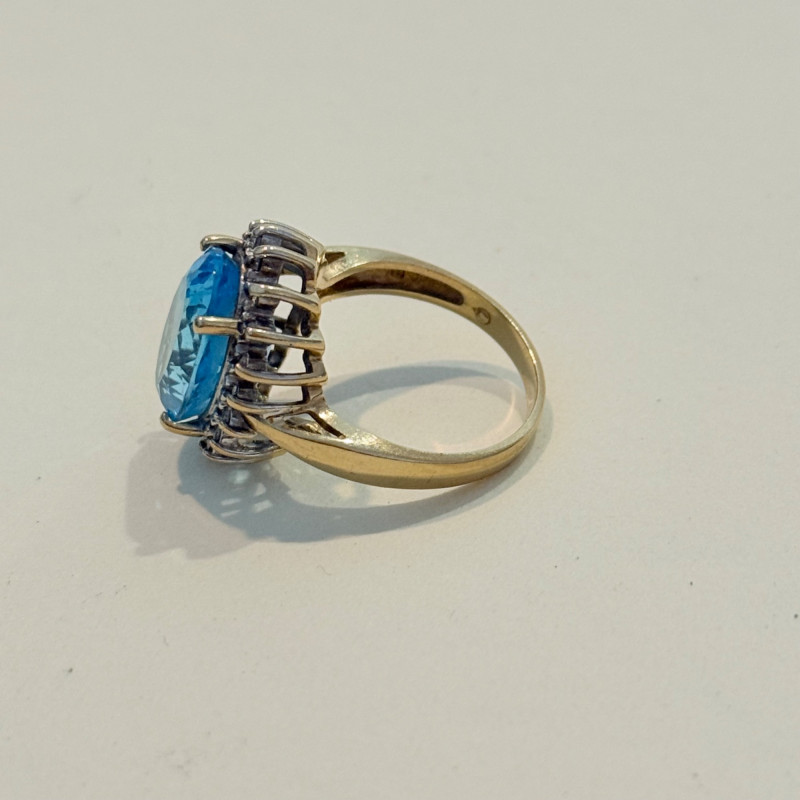 Blue topaz and diamond ring set in 14k gold. Features a large faceted oval blue topaz surrounded by a halo of clear accent stones. Weighs 5.9 grams and fits a size 7.5. Size: 7.5