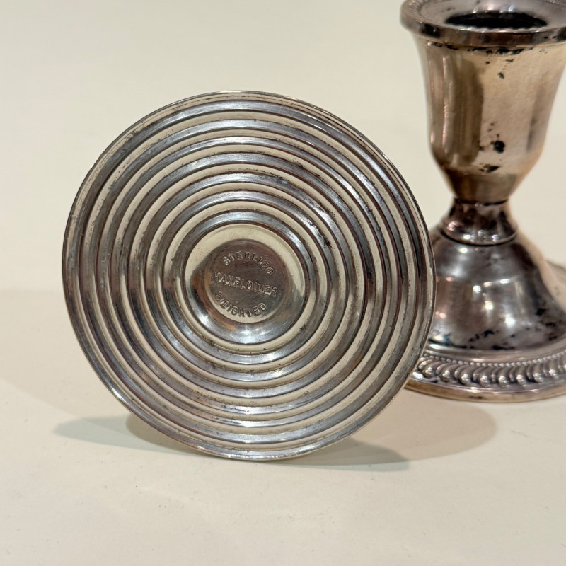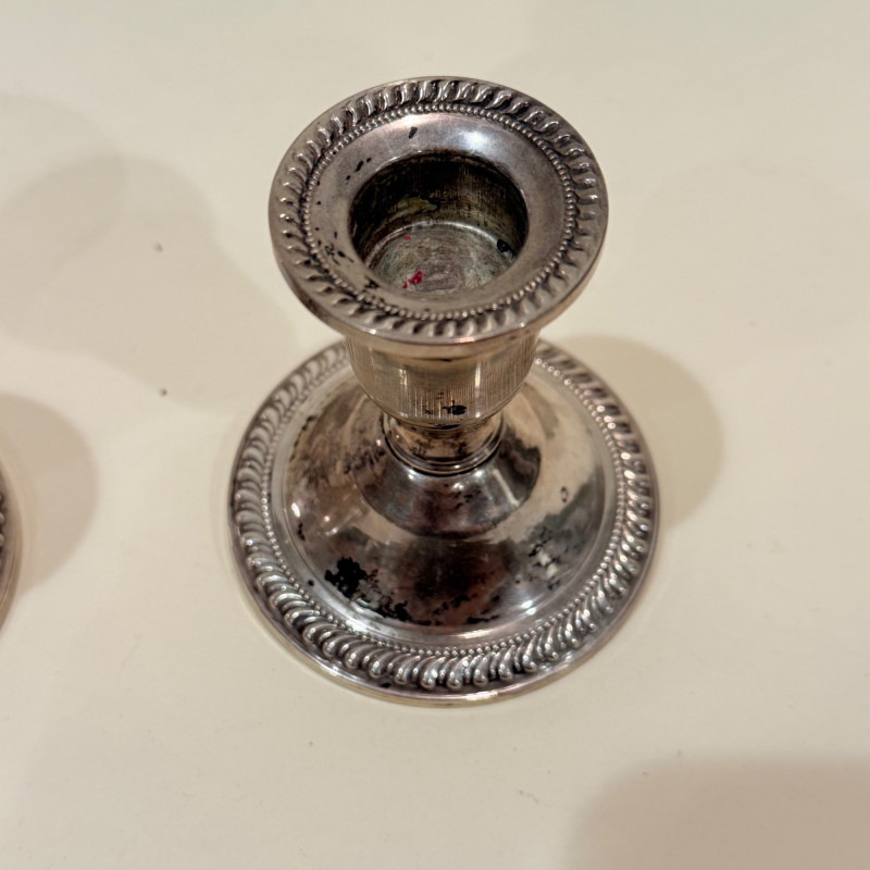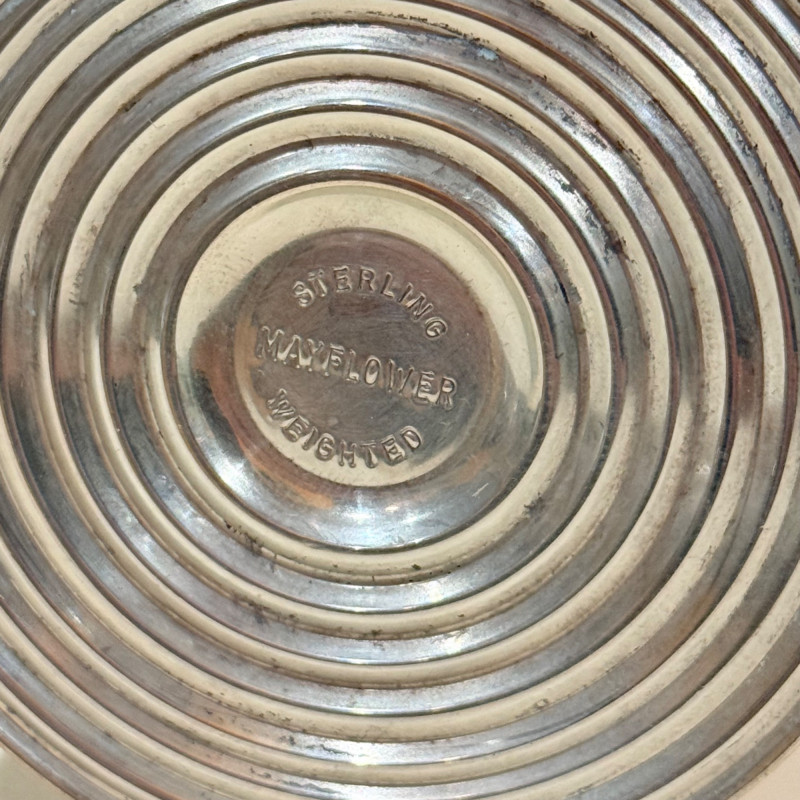 Colonial Glow: Mayflower Sterling Candlesticks with Rope-Edge Bases – Weighted Pair Classic pair of sterling silver candlestick holders by Mayflower Silversmiths, each standing 3 inches tall with a flared top, narrow neck, and rounded base. The bases feature a rope-edge border, and the surface shows natural patina and light wear, consistent with age. Combined weight: 219.8 grams. Both are marked STERLING and confirmed weighted. Maker: Mayflower Silversmiths Material: Sterling silver (marked), weighted Dimensions: 3" tall Weight: 219.8 grams total (includes internal weighting) Design: Colonial-style silhouette with flared top and rope-edge base Markings: Stamped STERLING