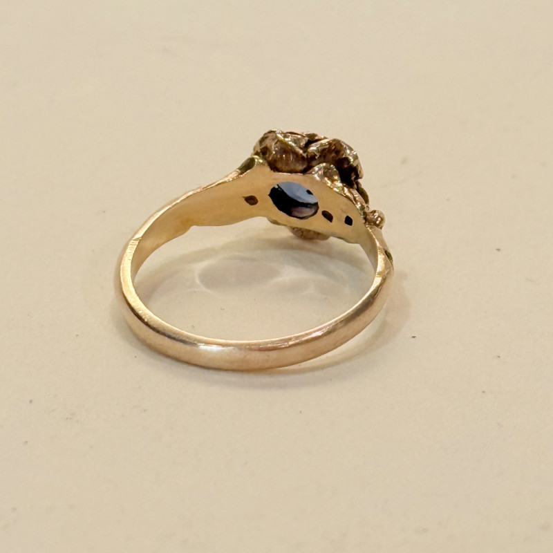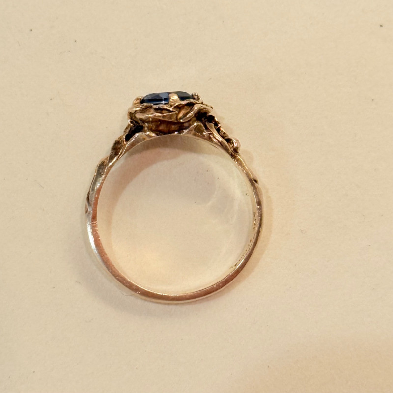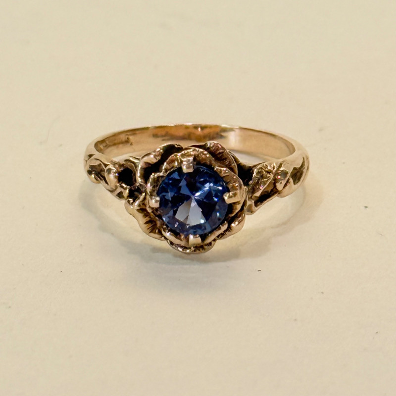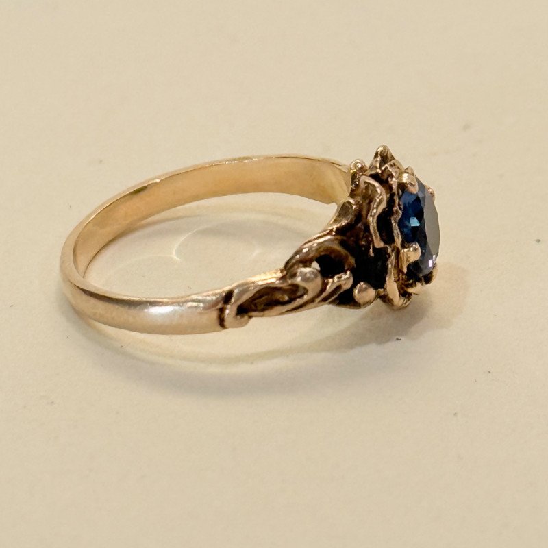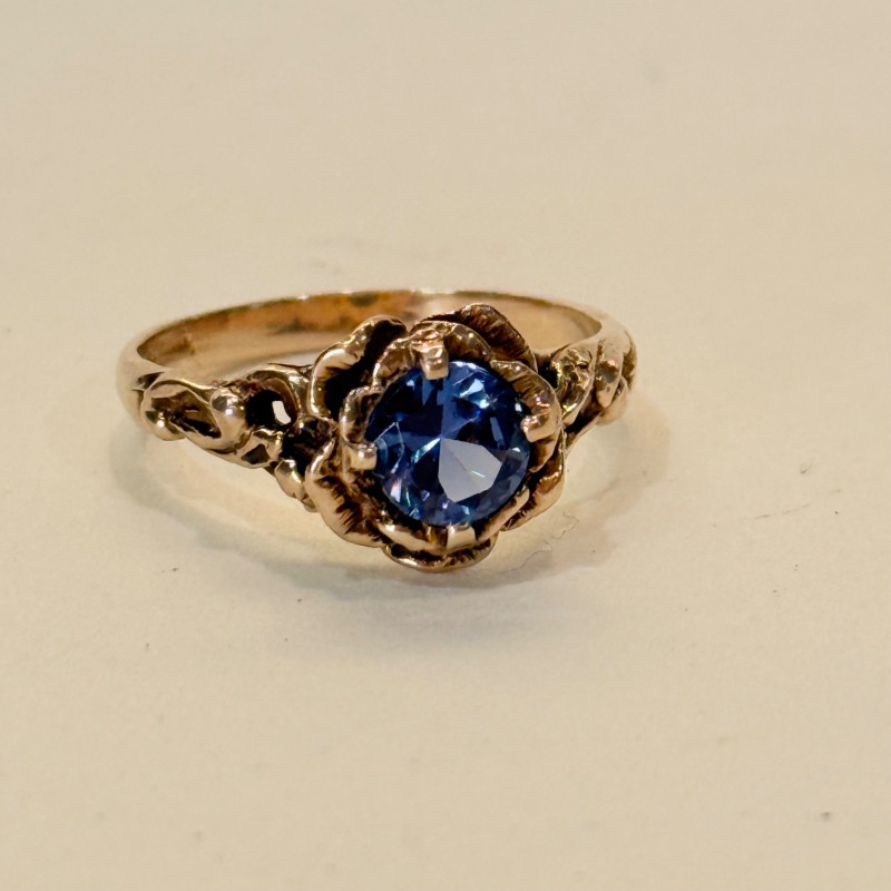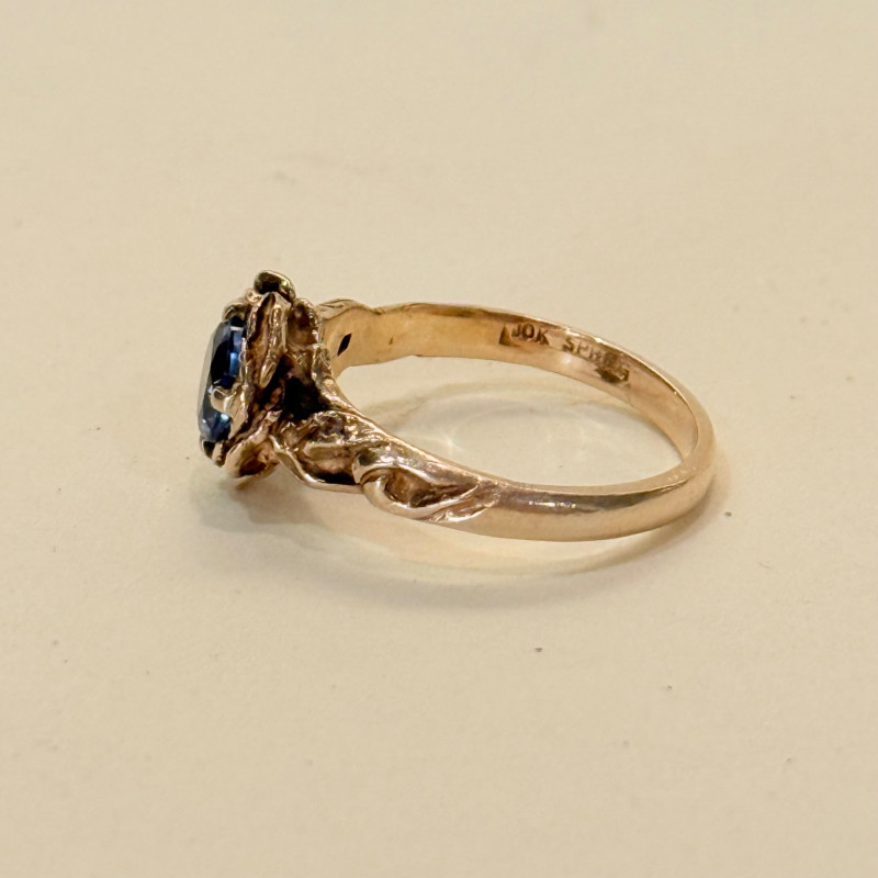 Size 6 ring stamped 10k. Features a round-cut London blue topaz in a floral-style setting. Total weight: 3.3 grams. Size: 6 Weight: 3.3 grams Material: 10k gold (stamped) Gemstone: London blue topaz