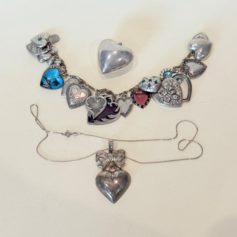 Designs: Charm bracelet, bow pendant necklace, heart locket