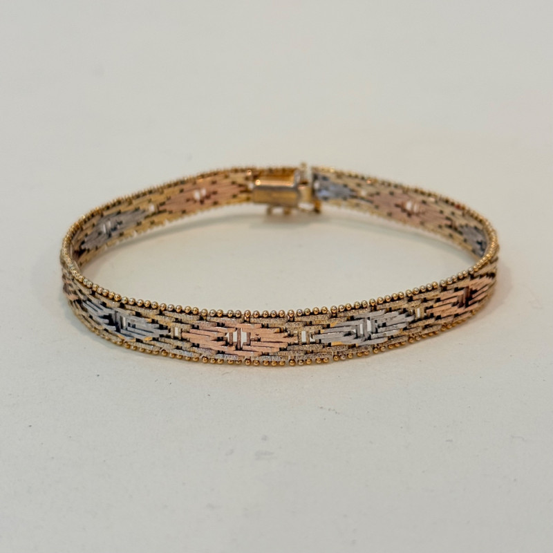 Striking Italian-made bracelet crafted in sterling silver (.925) with a tri-color finish—rose, yellow, and white tones woven into a repeating chevron and bar pattern. The design is framed by beaded borders and finished with a secure box clasp. Measures approx. 7.5 inches long × 8mm wide. Marked .925 Italy. Material: Sterling silver (.925), tri-color finish Length: 7.5 inches Width: 8mm Weight: 17.9 grams Design: Chevron and bar motif with beaded edge in rose, yellow, and white tones Markings: Stamped .925 Italy