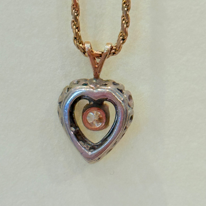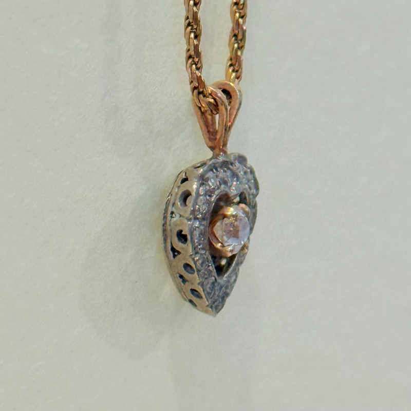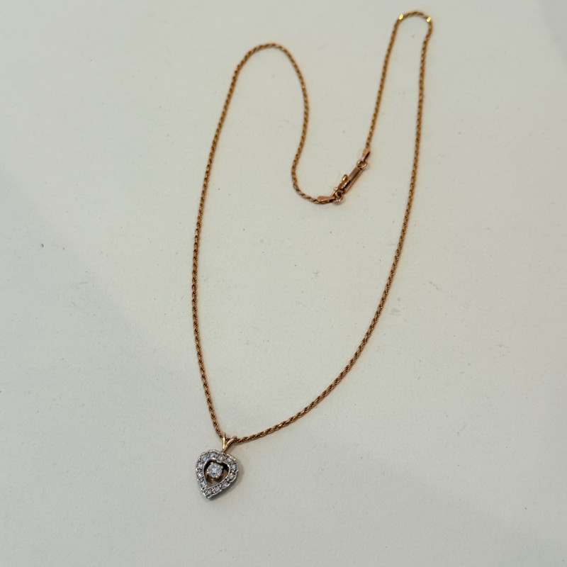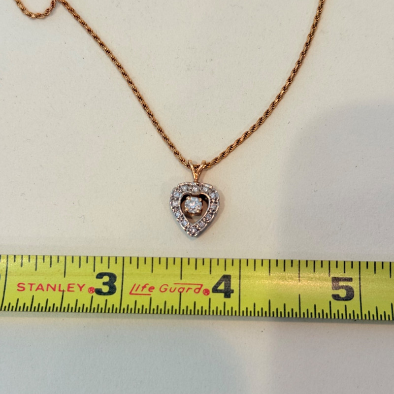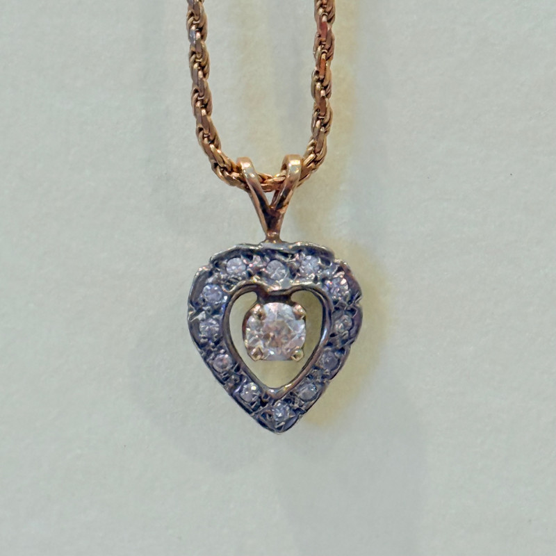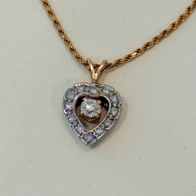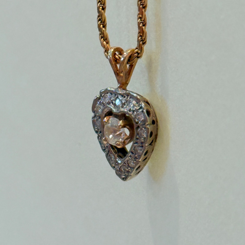 A timeless expression of elegance and sentiment, this 14K gold heart pendant necklace features a raised brilliant-cut diamond at its center, encircled by a halo of smaller diamonds that catch the light with every movement. The pendant is suspended from a twisted rope chain stamped .585, confirming its 14K gold purity. Both chain and pendant exhibit warm luster and refined craftsmanship. Chain: Twisted rope style, marked .585 (14K gold) Pendant: 14K gold heart with raised center diamond and diamond halo Design: Classic romantic motif with dimensional sparkle Era: Likely late 20th century to early 2000s Condition: Excellent vintage condition; stones bright, gold intact
