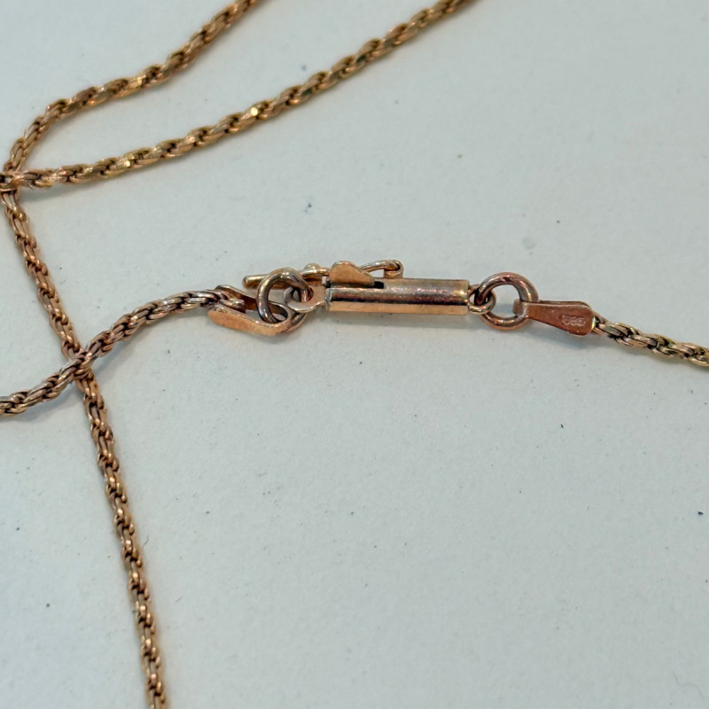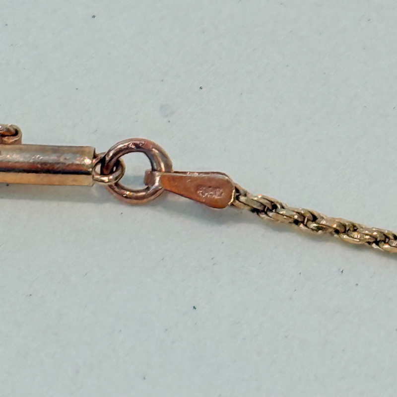Weighs 5.4 grams. 28” chain. Stamped 585. 13 diamond total.