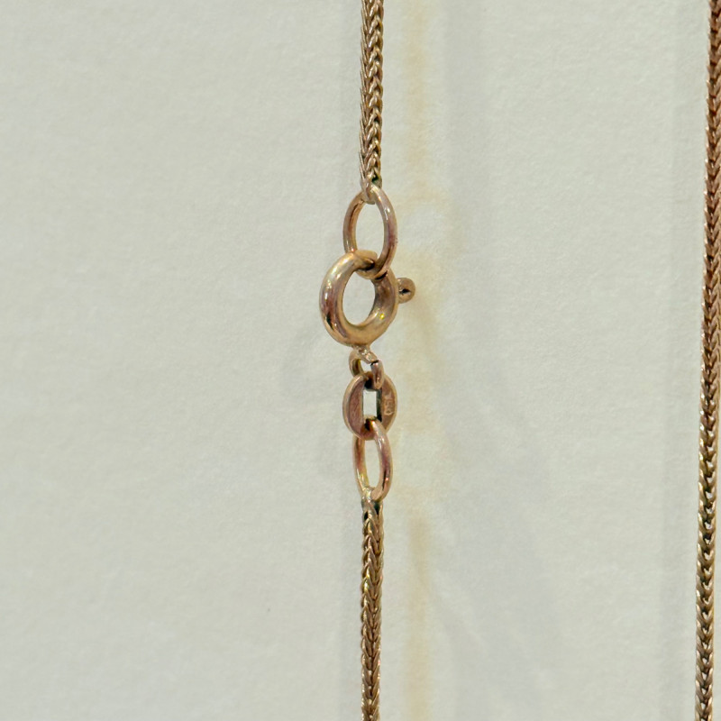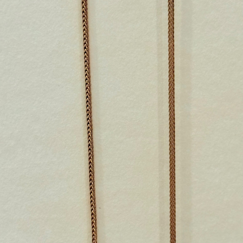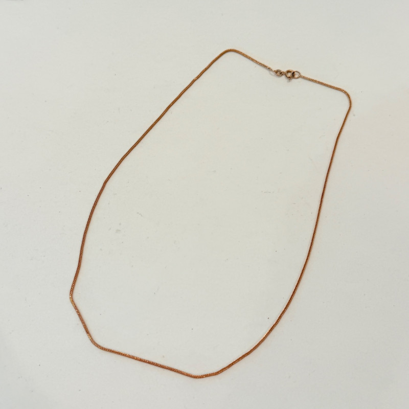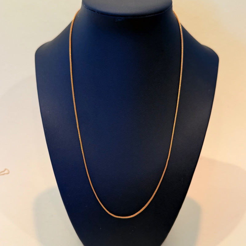 Golden Whisper: Delicate 18K Chain with Sleek, Minimalist Profile Fine 18K gold necklace featuring a slender, tightly linked chain with polished finish and graceful drape. Measures 18.5 inches long and weighs 2.8 grams. Stamped 750, indicating European 18K gold purity. Material: 18K gold, stamped 750 Length: 18.5 inches Weight: 2.8 grams Design: Fine linked chain with smooth finish Markings: Stamped 750