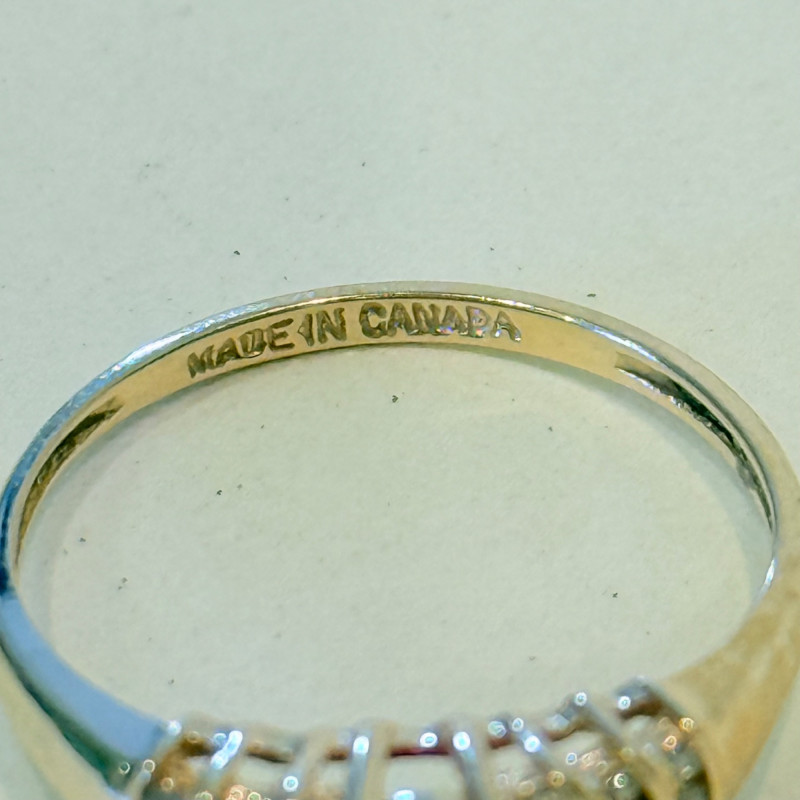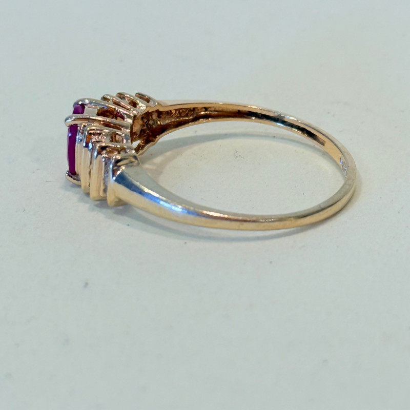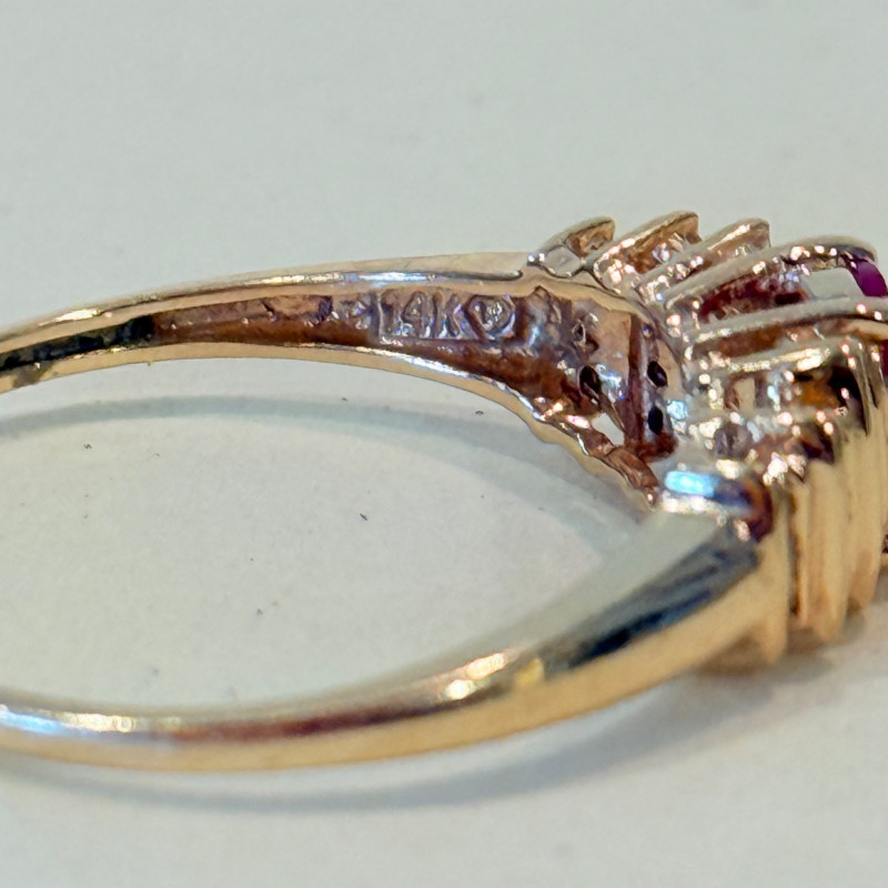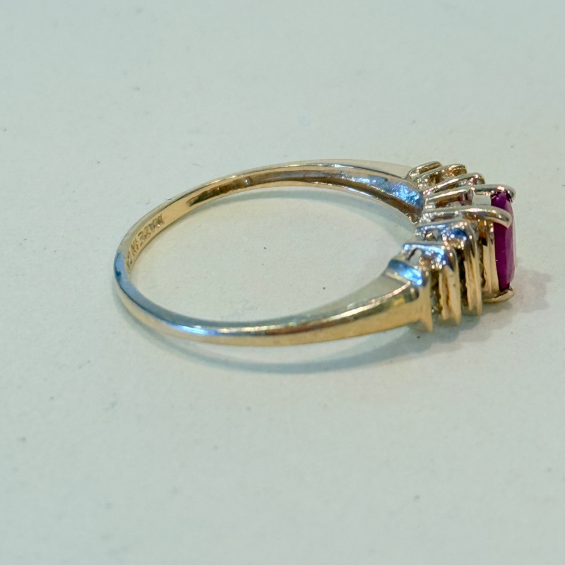 Crimson Crown: 14K Gold Ruby Ring with Diamond-Set Shoulders Elegant 14K yellow gold ring featuring a vibrant oval-cut ruby flanked by ten round brilliant-cut diamonds set in graduated channels along the shoulders. The ruby is prong-set and richly saturated, offering bold contrast against the sparkle of the diamonds and warm gold band. Ring size: 9. Total weight: 2.9 grams. Stamped 14K inside band. Material: 14K yellow gold, stamped Gemstones: Oval ruby (approx. 0.75 ct), 10 round diamonds (approx. 0.10 ct total) Size: 9 Weight: 2.9 grams Design: Prong-set ruby with channel-set diamond shoulders Markings: Stamped 14K