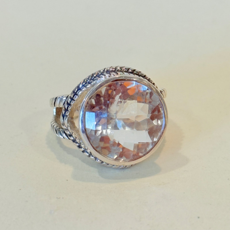 Crystal Crown: Sterling Silver Statement Ring with Brilliant-Cut White Topaz Bold sterling silver ring featuring a large, round faceted white topaz set in a raised bezel framed by twisted rope detailing. The stone is exceptionally clear and reflective, offering diamond-like brilliance with a softer glow. The band is sculptural and substantial, with rope accents continuing along the shank. Ring size: 8. Total weight: 12.2 grams. Stamped 925. Material: Sterling silver, stamped 925 Gemstone: White topaz, round brilliant cut (approx. 10–12 mm diameter) Size: 8 Weight: 12.2 grams Design: Raised bezel with twisted rope border and sculptural shank Markings: Stamped 925