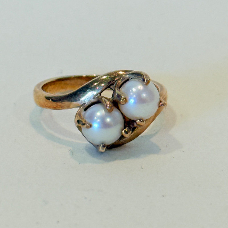 Duet in Luster: Vintage 10K Gold Ring with Twin Cultured Pearls Graceful 10K yellow gold ring featuring two white cultured pearls set side by side in a classic bypass design. The pearls are prong-set and exhibit soft luster with subtle iridescence. The gold band curves elegantly around the pearls, creating a balanced and romantic silhouette. Ring size: 4. Total weight: 2.9 grams. Stamped 10K inside band. Material: 10K yellow gold, stamped Gemstones: Two white cultured pearls, approx. 6 mm each Size: 4 Weight: 2.9 grams Design: Bypass-style twin pearl setting with prong mounts Markings: Stamped 10K