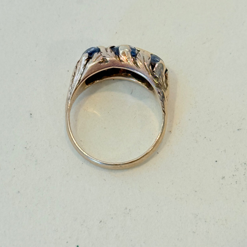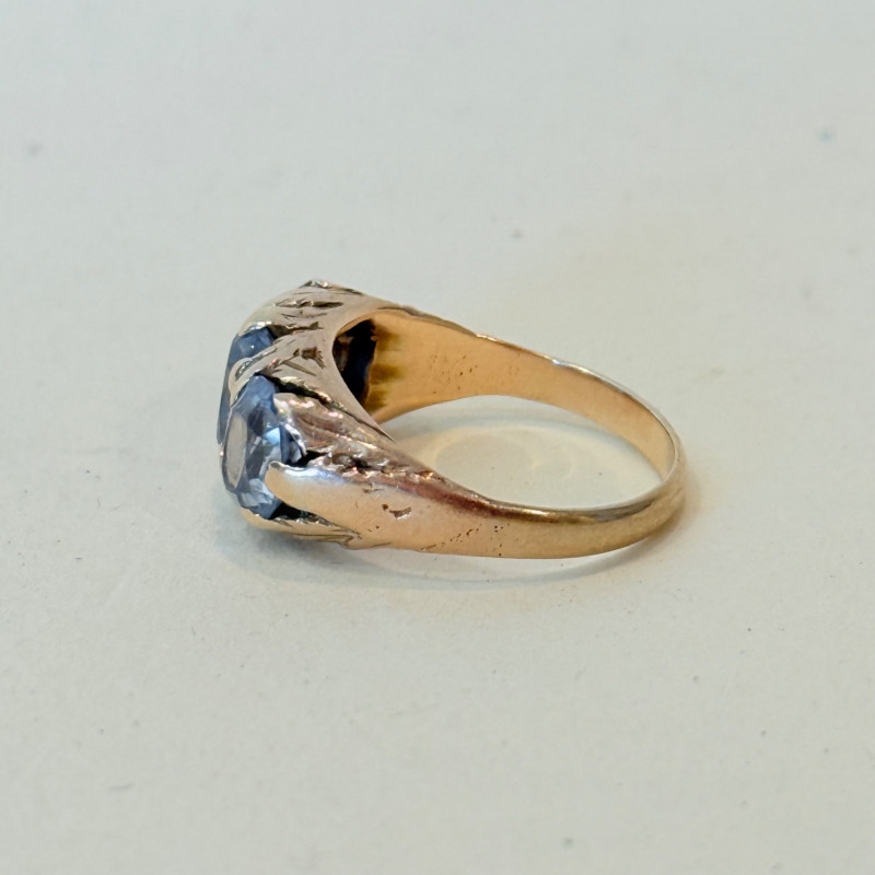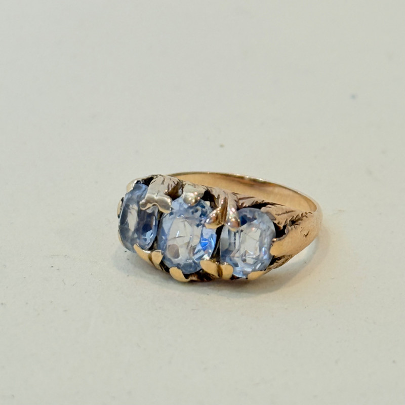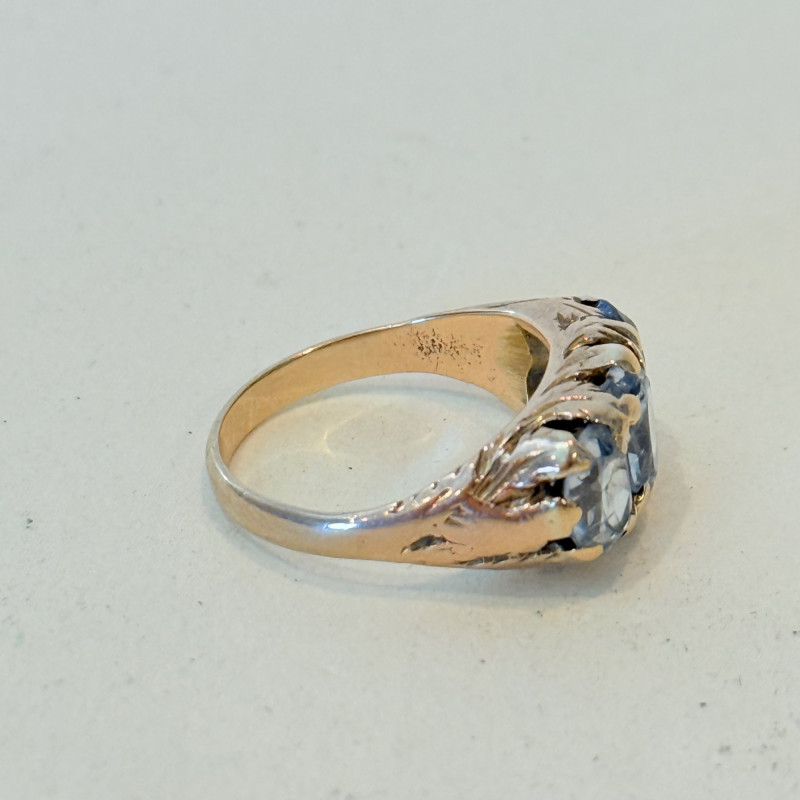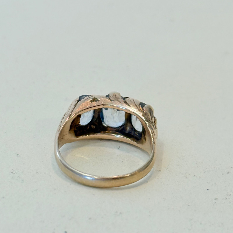 Vintage gold ring featuring three faceted aquamarine stones in a graduated row, with the center stone slightly larger than the flanking gems. The stones measure approximately ¼ inch long each and are prong-set in a decorative gallery with scrollwork shoulders. Ring size: 5. Total weight: 4.5 grams. No visible markings; karat unknown. Material: Gold (karat unknown), unmarked Gemstones: Three aquamarines, approx. ¼" each Size: 5 Weight: 4.5 grams Design: Graduated three-stone setting with decorative gallery and scrollwork shoulders Markings: None visible