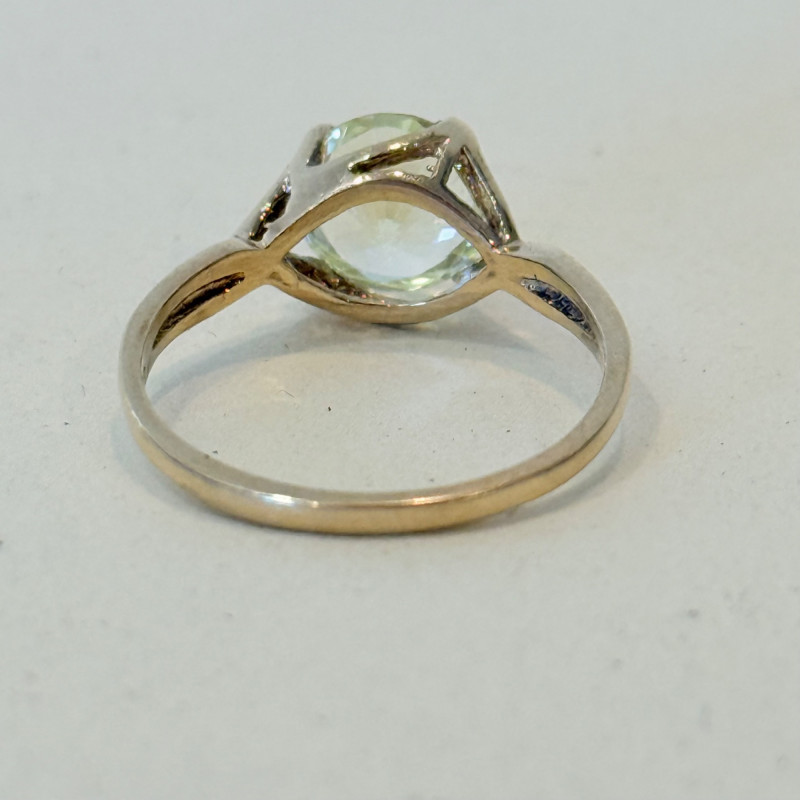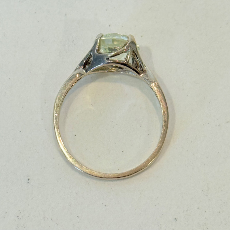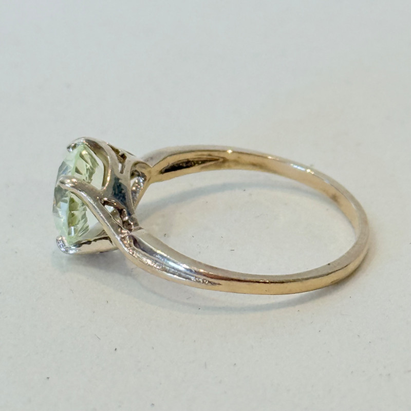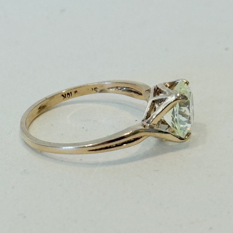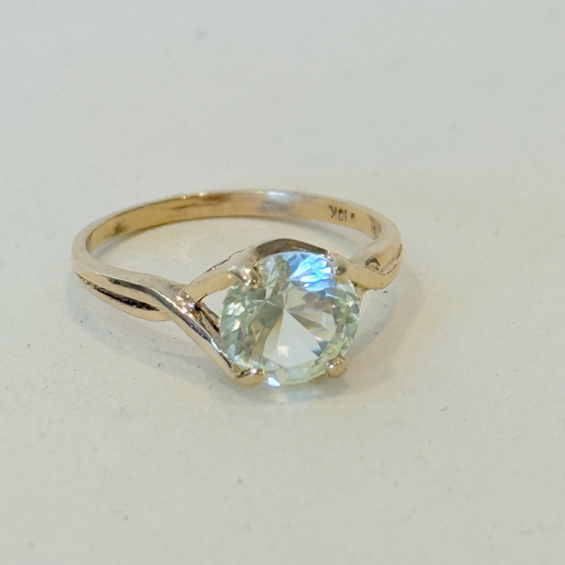 Mistlight Solitaire: 10K Gold Ring with Round-Cut Green Amethyst Elegant 10K yellow gold ring featuring a round-cut green amethyst (also known as prasiolite), set in a four-prong solitaire mount with a subtle twist design at the shoulders. The stone measures approximately 10 mm in diameter, offering a soft, minty glow with brilliant faceting. Ring size: 7. Total weight: 2 grams. Stamped 10K inside band. Material: 10K yellow gold, stamped Gemstone: Green amethyst (prasiolite), approx. 10 mm round cut Size: 7 Weight: 2 grams Design: Solitaire setting with twisted shoulders Markings: Stamped 10K