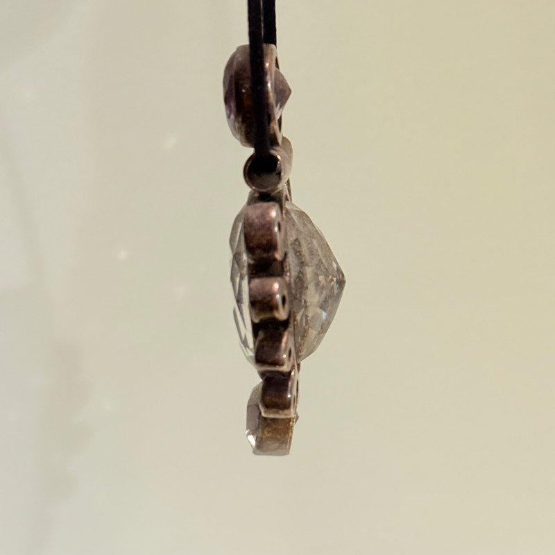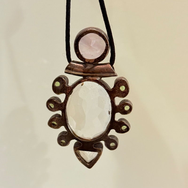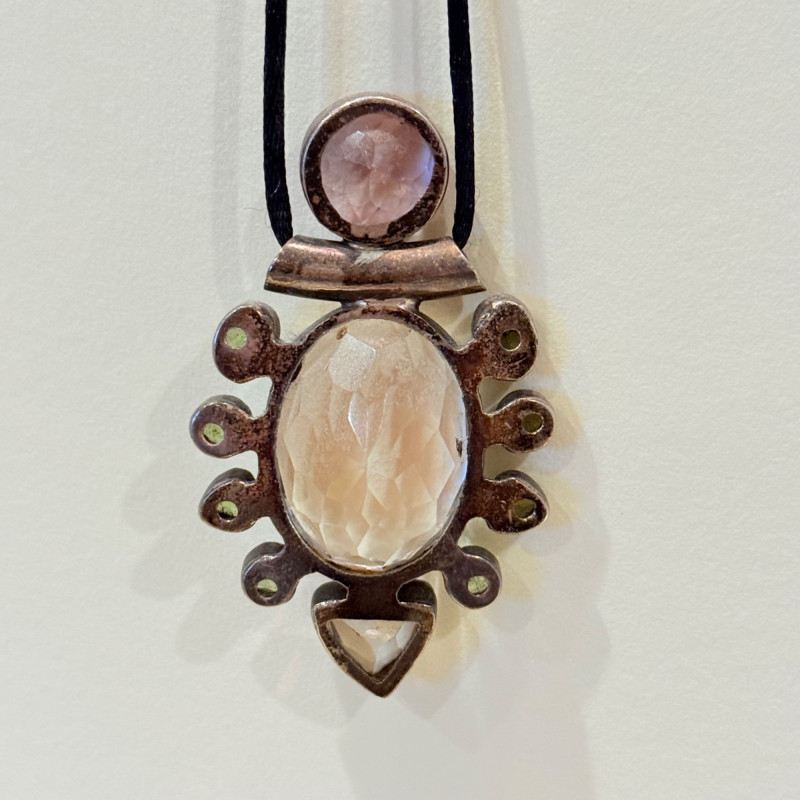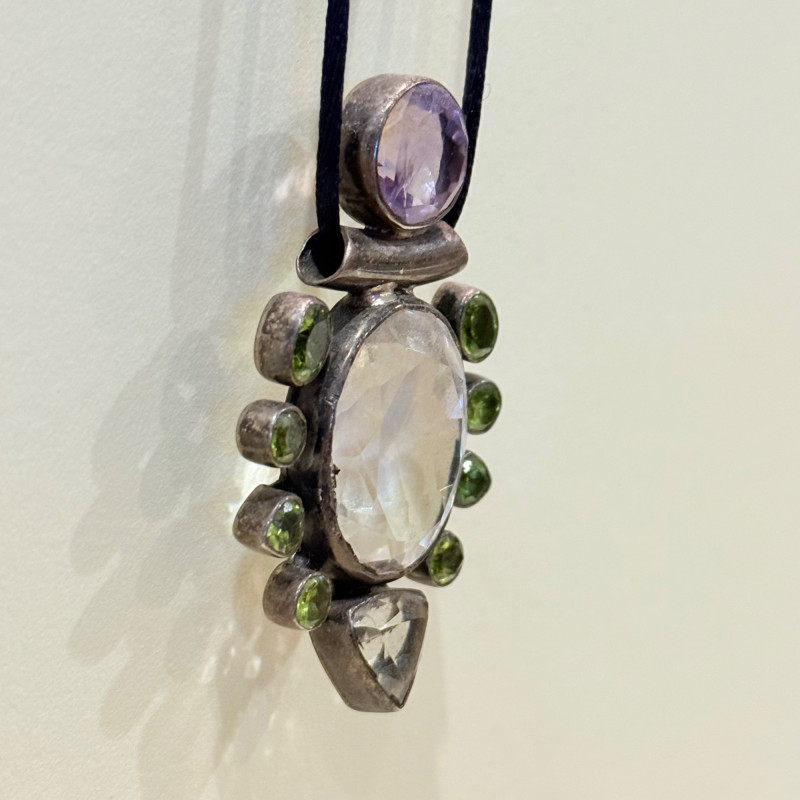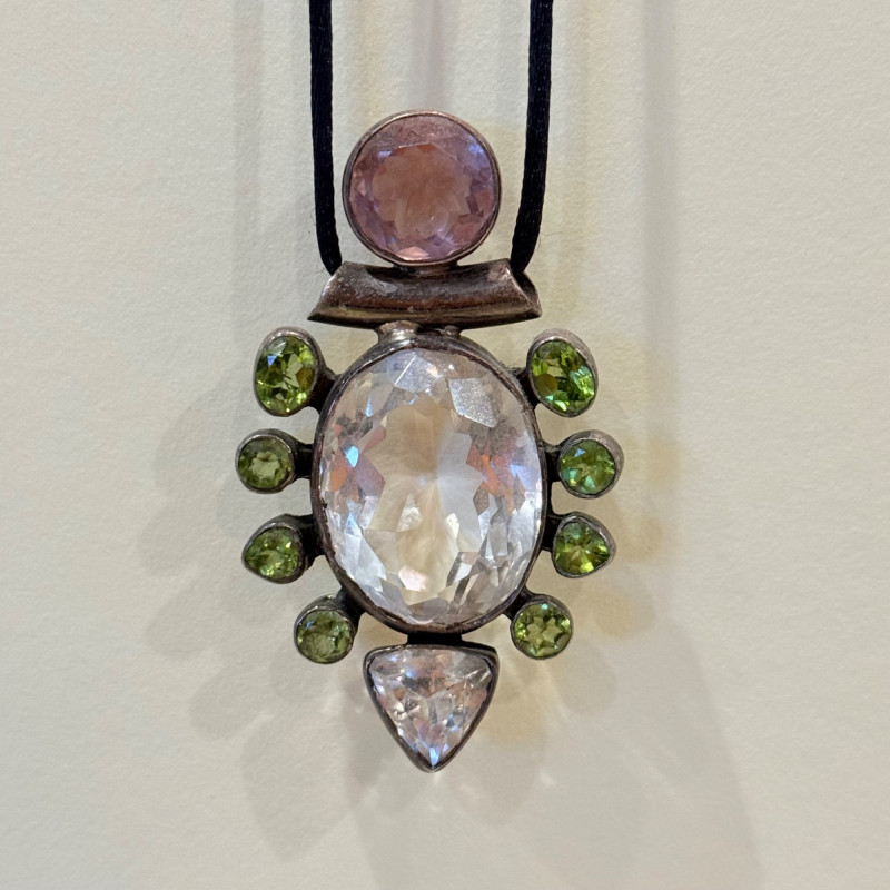 Celestial Array: Sterling Pendant with Quartz, Tourmaline, and Peridot Striking artisan-crafted sterling silver pendant featuring a symmetrical arrangement of faceted gemstones. At center is a large oval-cut clear quartz, flanked by six round green peridot stones. A round pink tourmaline crowns the top, while a triangular clear quartz anchors the base. The stones are bezel-set in a sculptural silver frame and suspended from a black cord. Measures 2.5" × 1.5". Unmarked but tests as sterling. Material: Sterling silver (tested), clear quartz, pink tourmaline, green peridot Dimensions: 2.5" height × 1.5" width Design: Vertical pendant with symmetrical gemstone layout Markings: Unmarked Style Note: Evokes celestial and chakra-inspired motifs; reminiscent of 1990s–2000s studio jewelry from the Southwest and Pacific Northwest