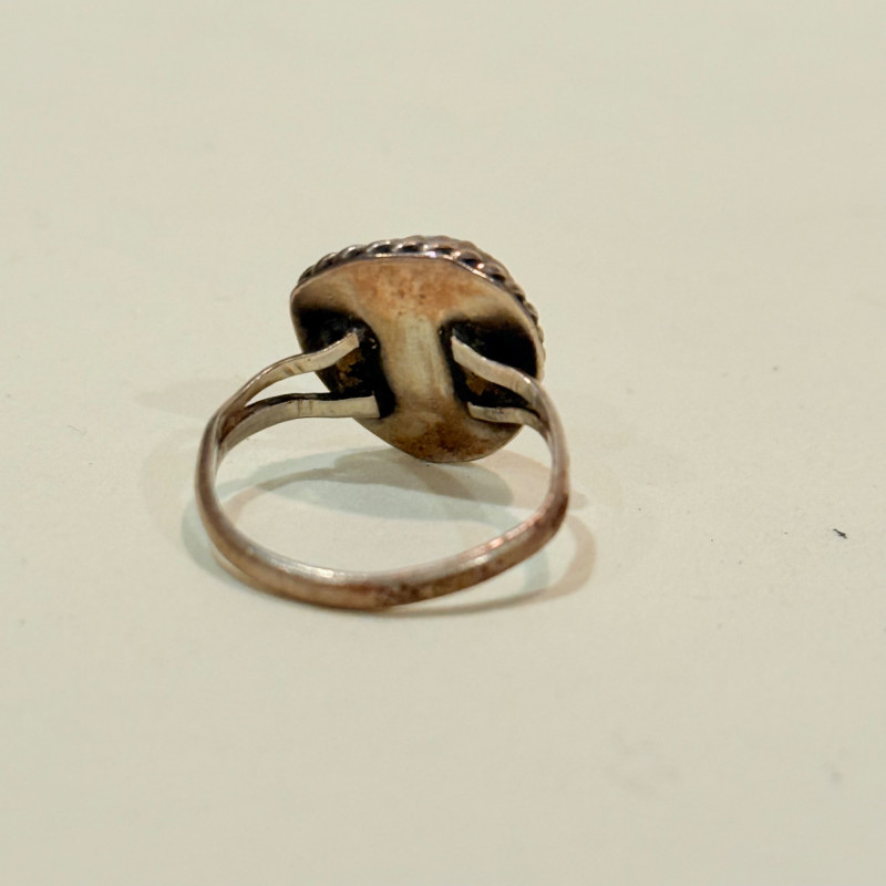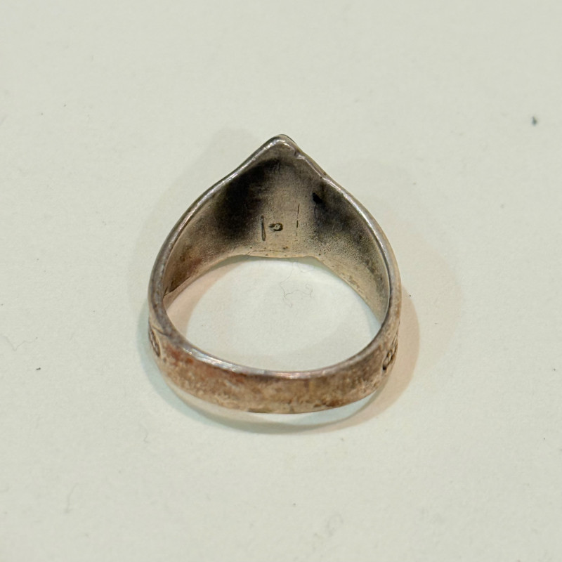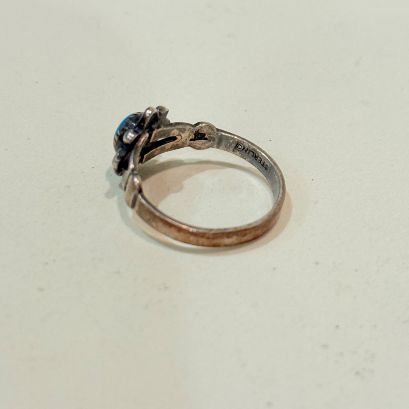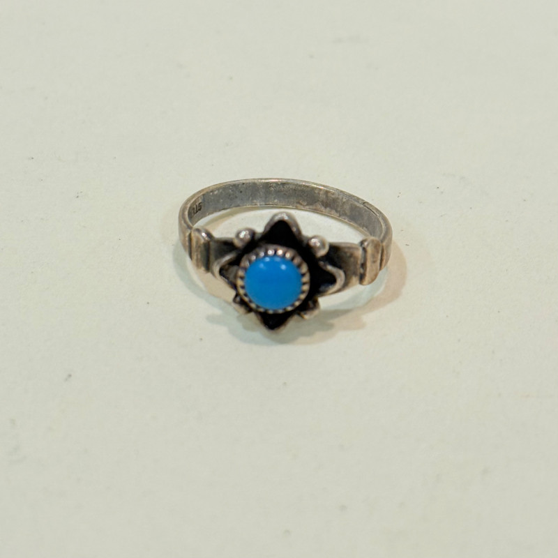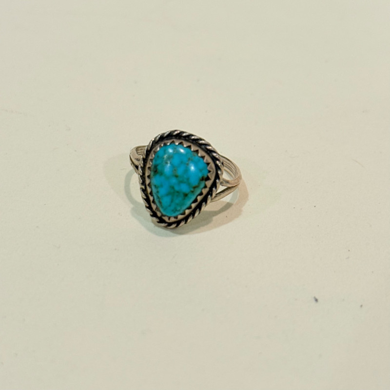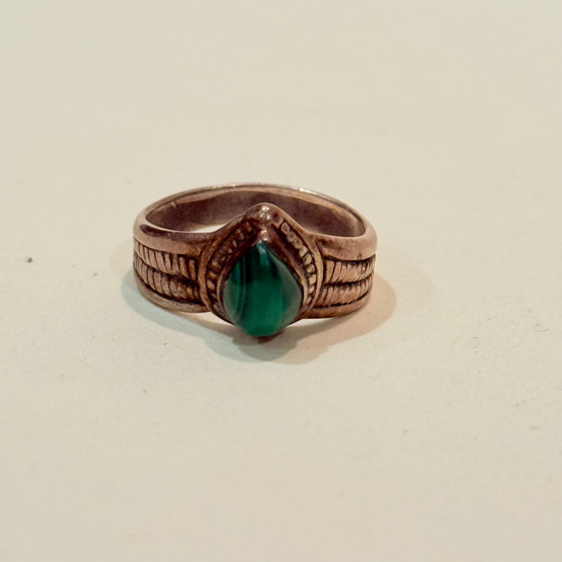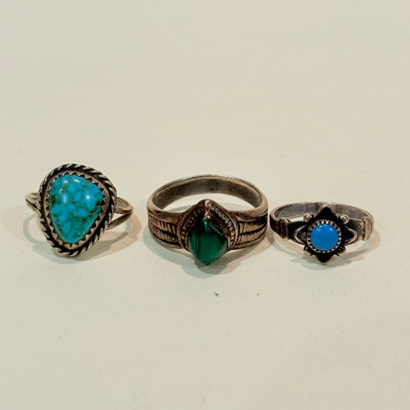 Southwest Signals: Sterling Stackers in Earth and Sky Tones Set of three vintage sterling silver rings in complementary styles and stones. Includes a teardrop turquoise cabochon with rope bezel (size 6), a faceted marquise-cut malachite in a leaf-engraved band (size 7), and a petite round turquoise cabochon in a scalloped bezel with flanking scrollwork (size 4.5). All unmarked but test as sterling. Material: Sterling silver (tested), turquoise, malachite Sizes: 4.5, 6, and 7 Designs: Teardrop turquoise with twisted rope bezel Marquise malachite with engraved leaf shoulders Round turquoise with scalloped bezel and scroll accents Markings: Unmarked Style Note: Evokes mid-century Navajo and Zuni influences, ideal for stacking or gifting across generations