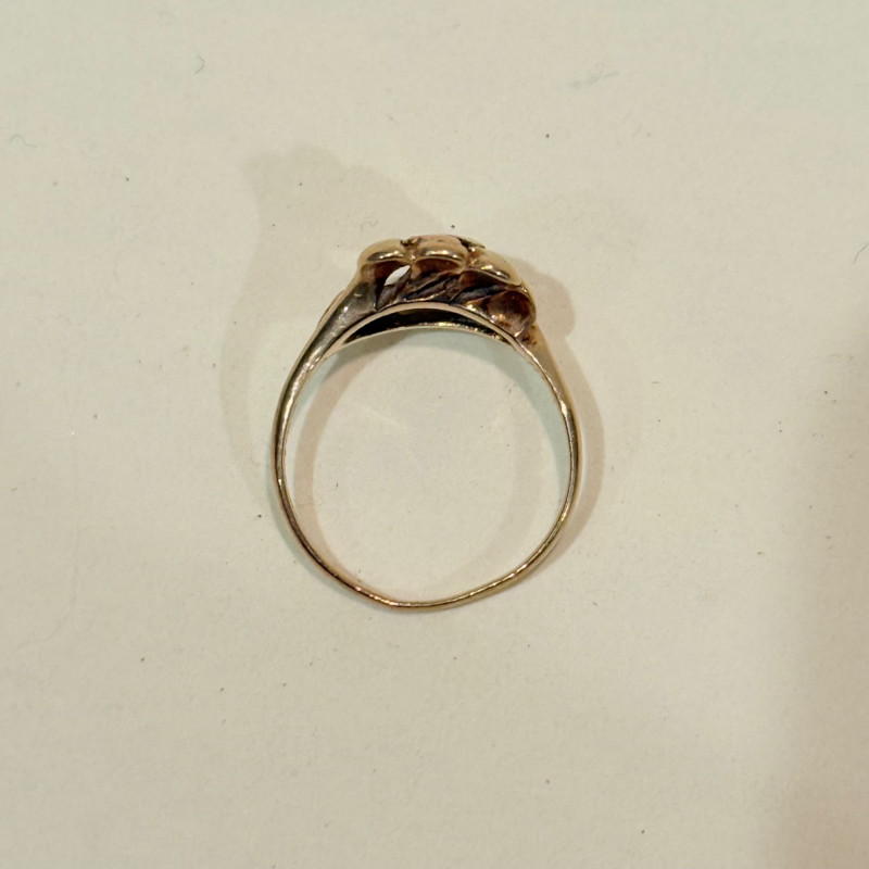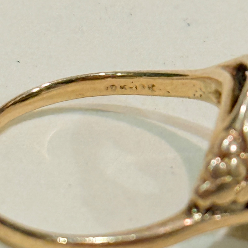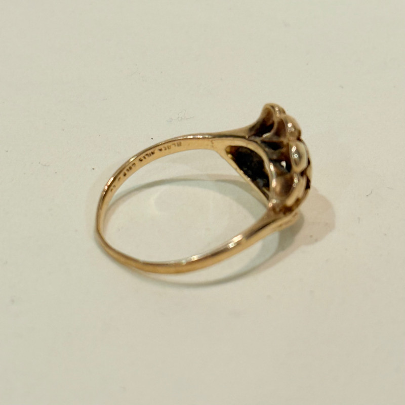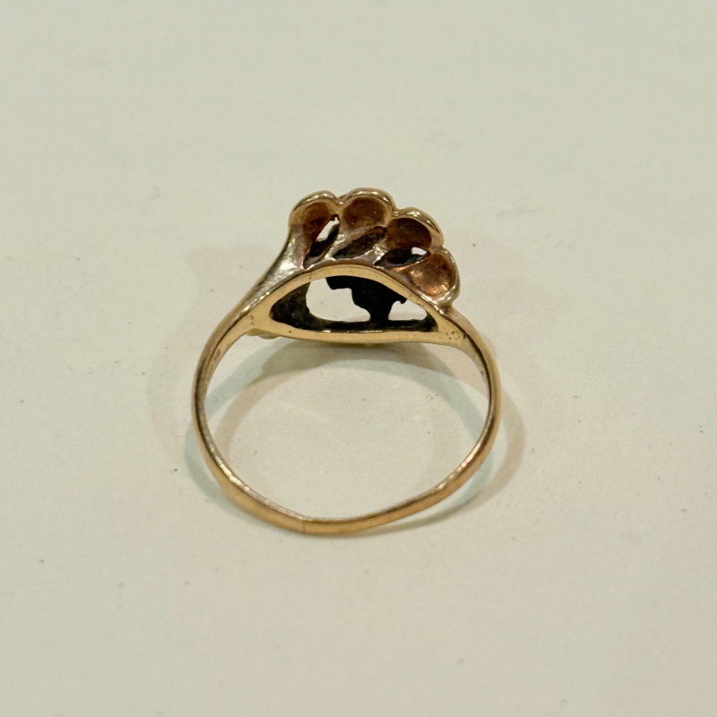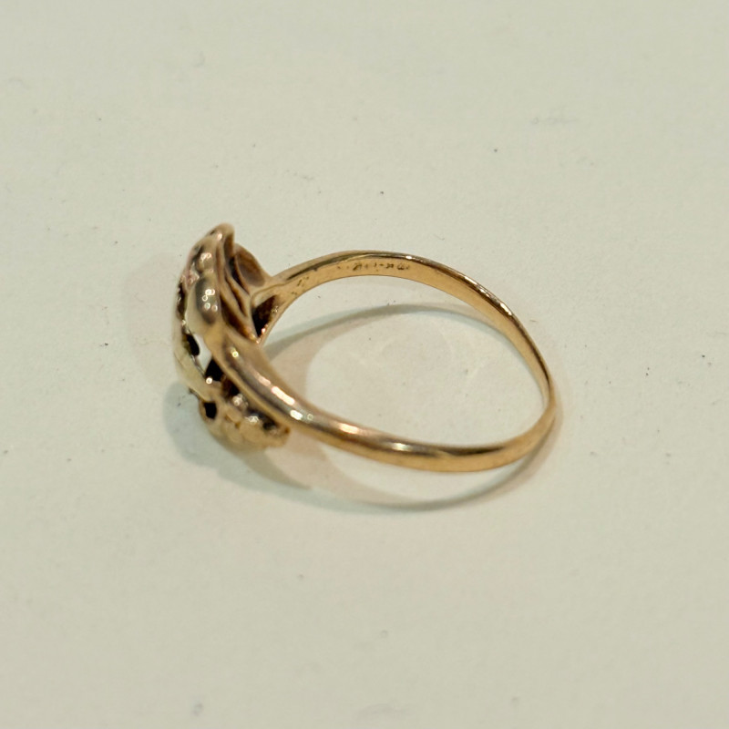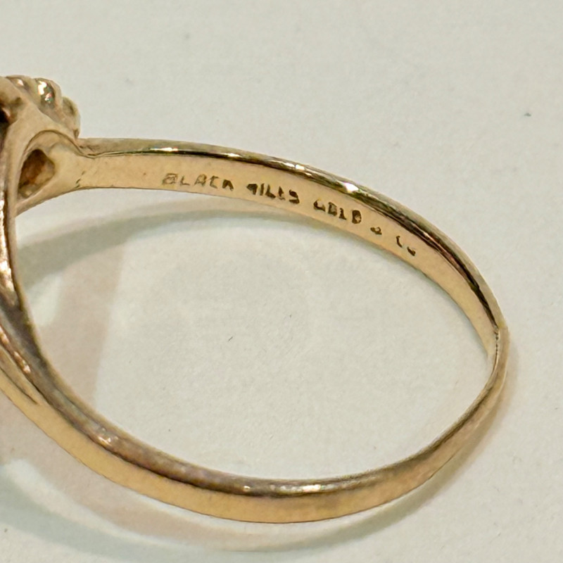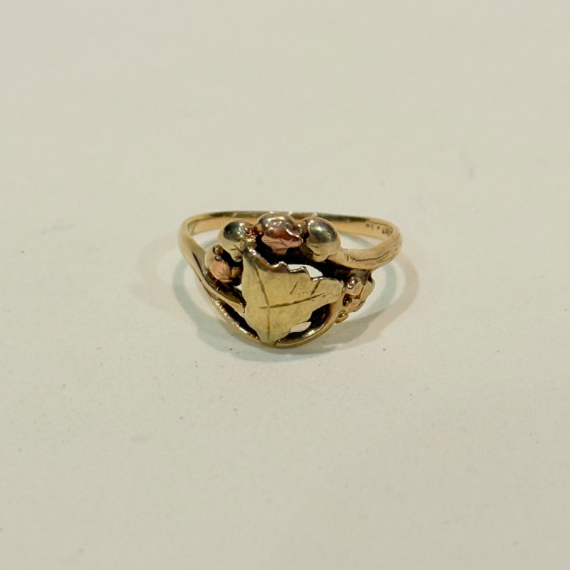 Dakota Vine: Nature’s Emblem in 10K Gold Vintage Black Hills Gold ring in classic tri-color design, featuring a central textured grape leaf flanked by rose and green gold accents in floral and bead motifs. Crafted in 10K yellow gold with 12K rose and green gold detailing, this size 6 ring weighs 2.4 grams. Unmarked but consistent with Landstrom’s or South Dakota Gold Co. production from the mid-20th century. Material: 10K yellow gold base with 12K rose and green gold accents Size: 6 Weight: 2.4 grams Design: Central grape leaf with flanking floral and bead motifs Markings: Unmarked Style Note: Reflects the iconic Black Hills Gold tradition, rooted in South Dakota craftsmanship and symbolic of prosperity and unity