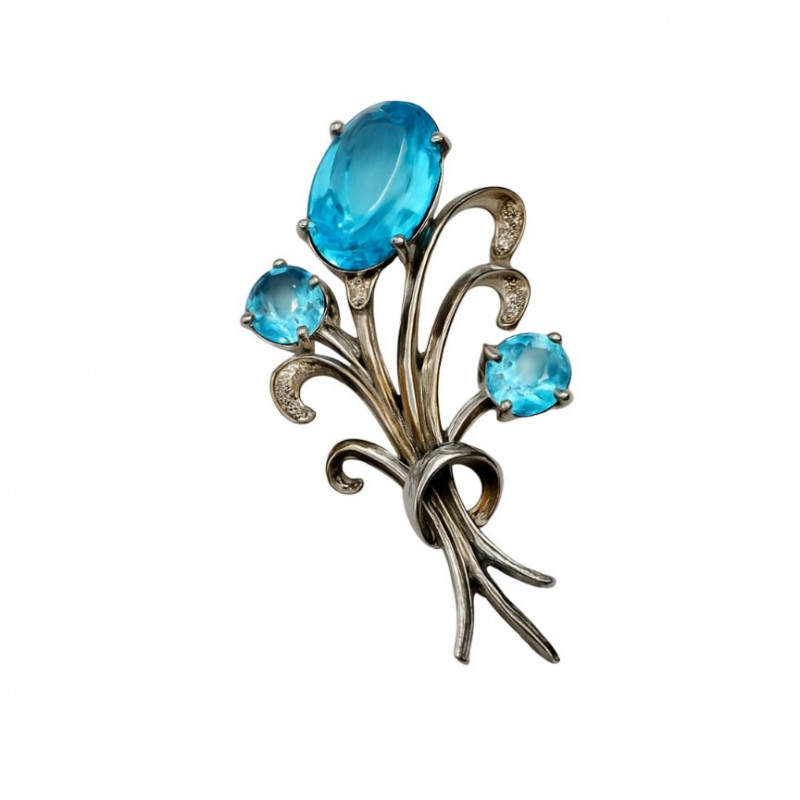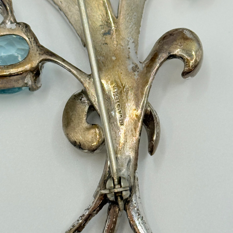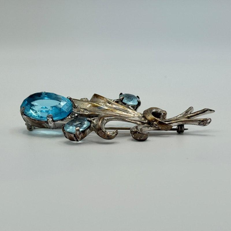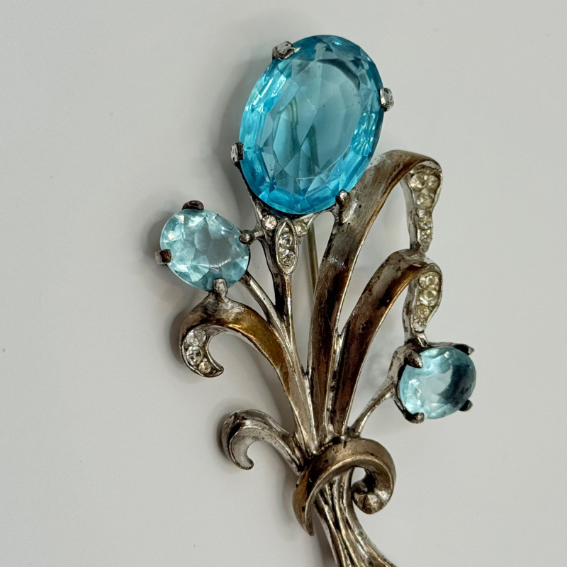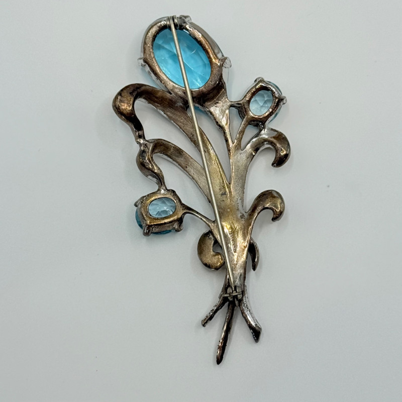Vintage Reja sterling brooch in a stylized floral spray design, featuring three aquamarine rhinestones—one large oval and two round—set among curling stems accented with clear rhinestones. Crafted in sterling silver with graceful mid-century lines. Measures 3.5" × 1.5". Marked Sterling. Maker: Reja Material: Sterling silver, rhinestone Dimensions: 3.5" × 1.5" Design: Floral spray with aquamarine and clear rhinestones Markings: Stamped Sterling