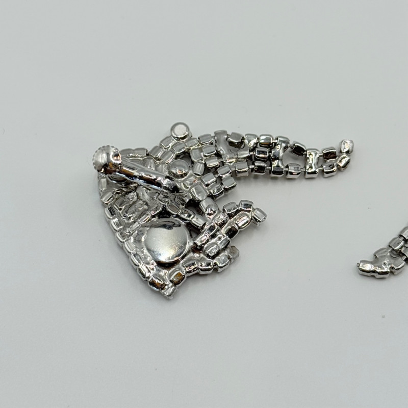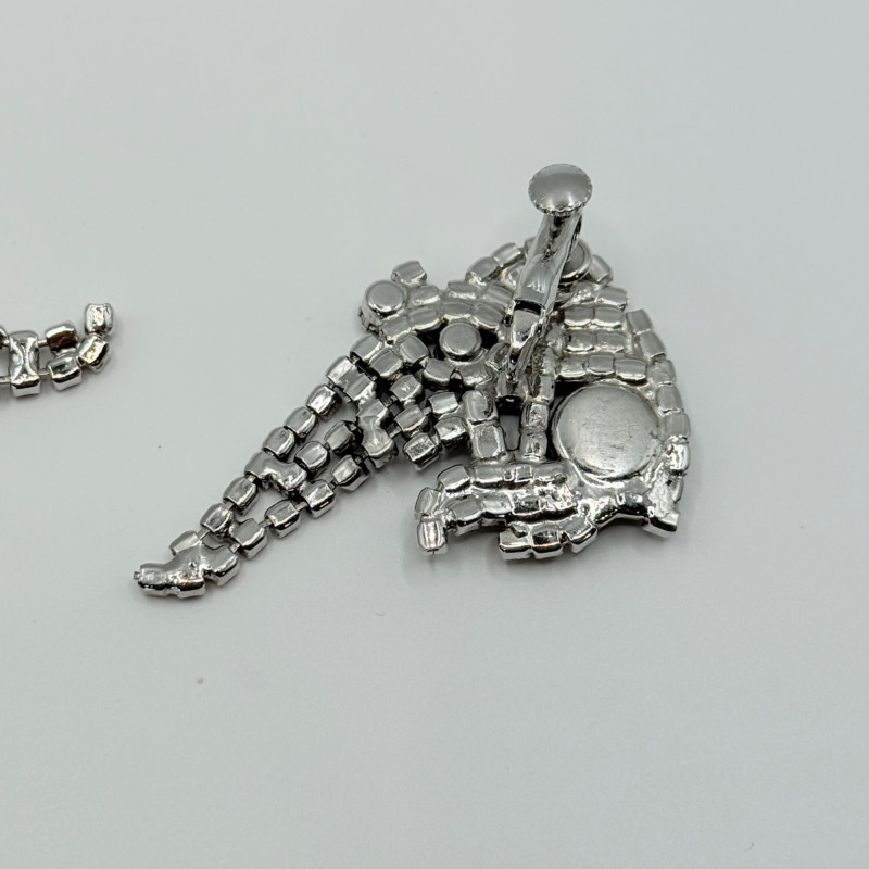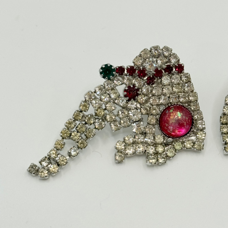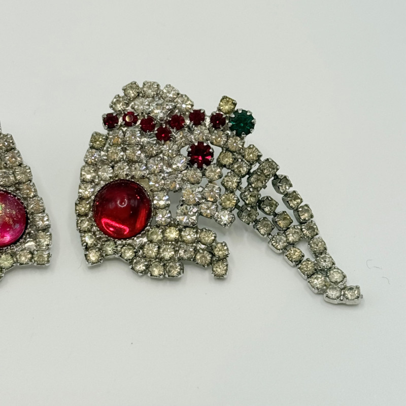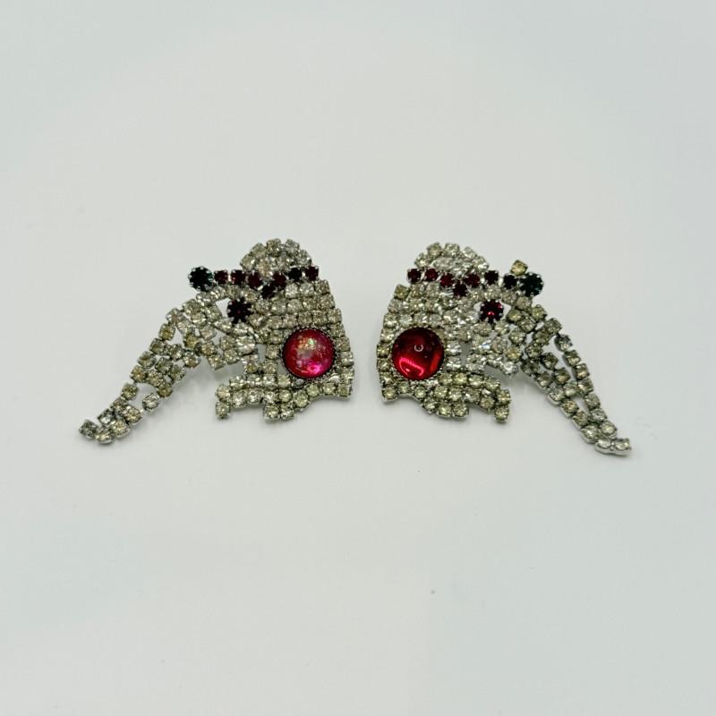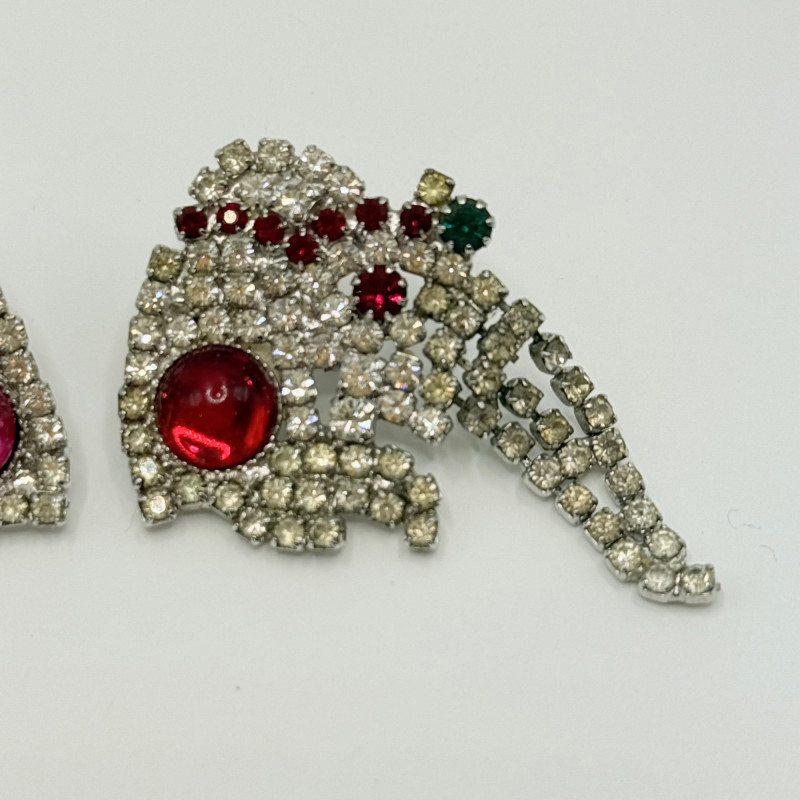 Pair of vintage rhinestone elephant earrings, each crafted in a mirrored figural design. Clear rhinestones form the body and trunk, while red cabochon eyes and green and red accent stones suggest ceremonial headdress detail. Likely mid-century costume pieces, possibly of Austrian or Weiss-style origin. Unsigned. Measures 1.5" long. Quantity: 2 Material: Clear rhinestones, colored glass stones Design: Mirrored elephant forms with jeweled accents Dimensions: 1.5" long Markings: Unsigned