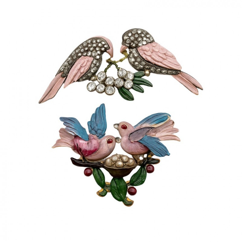 Pair of vintage figural bird brooches in enamel and rhinestone. One features two pink birds perched on a rhinestone branch with white blossoms; the other shows three birds in pink and blue gathered around a pearl-accented nest with green leaves and red berries. Unsigned. Measures 2.5" to 3.5" wide. Quantity: 2